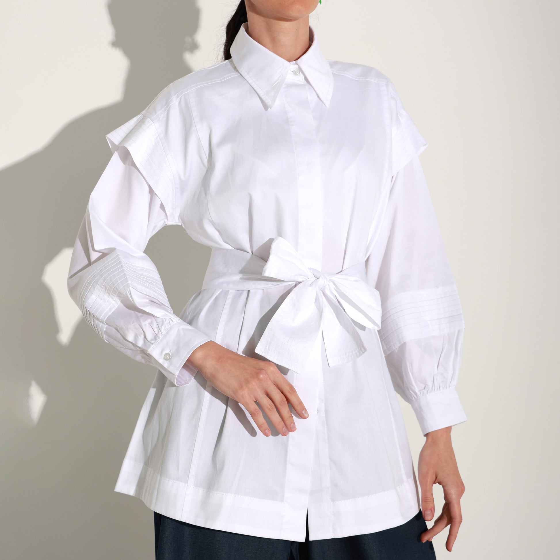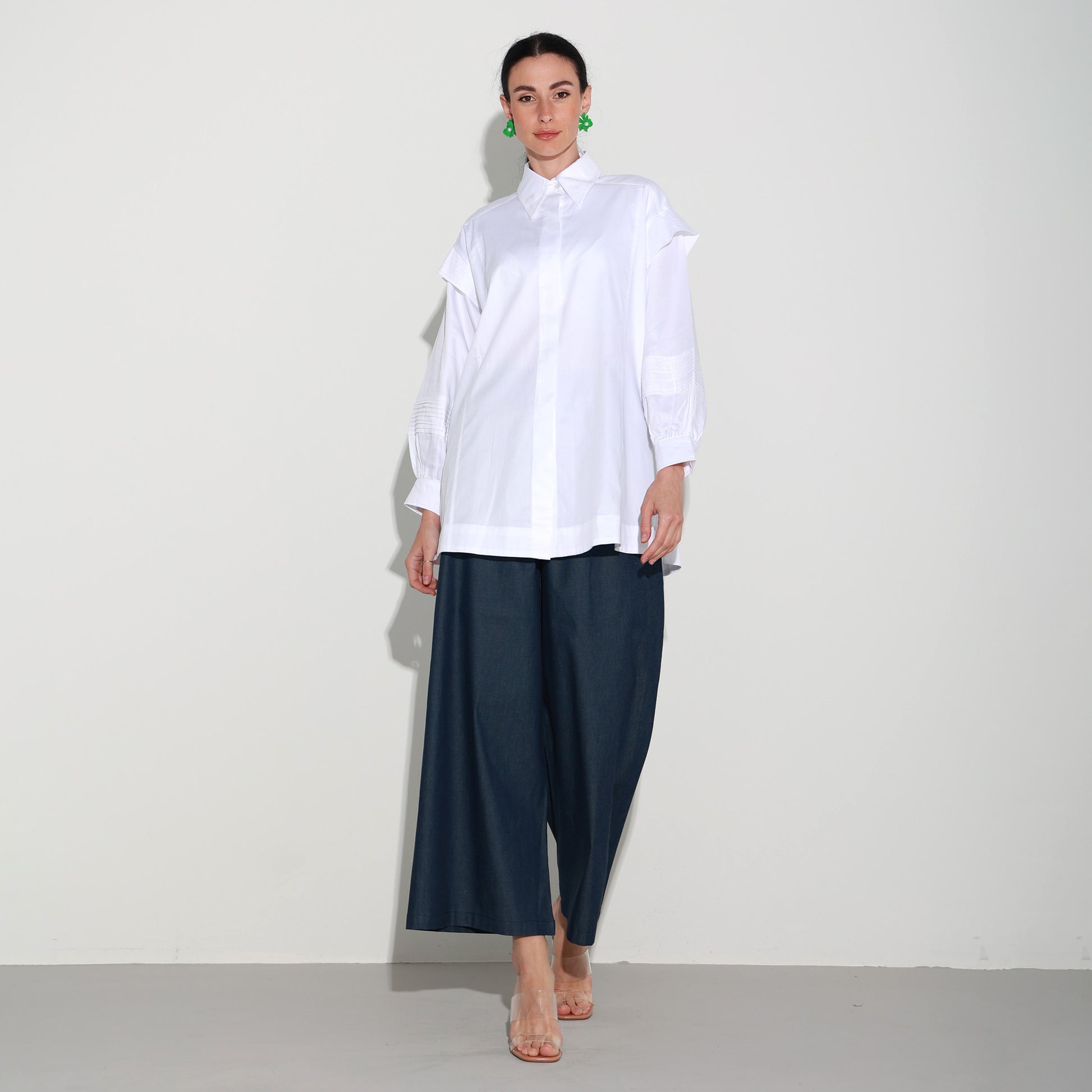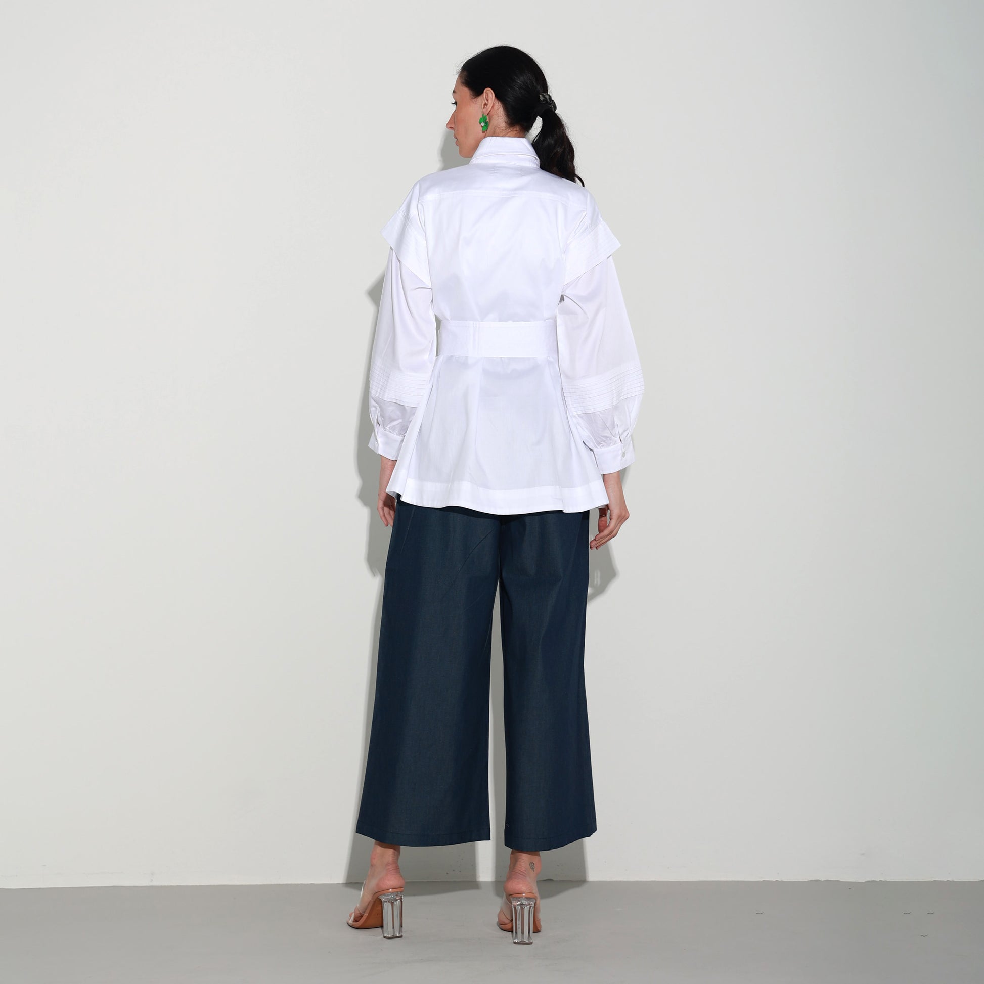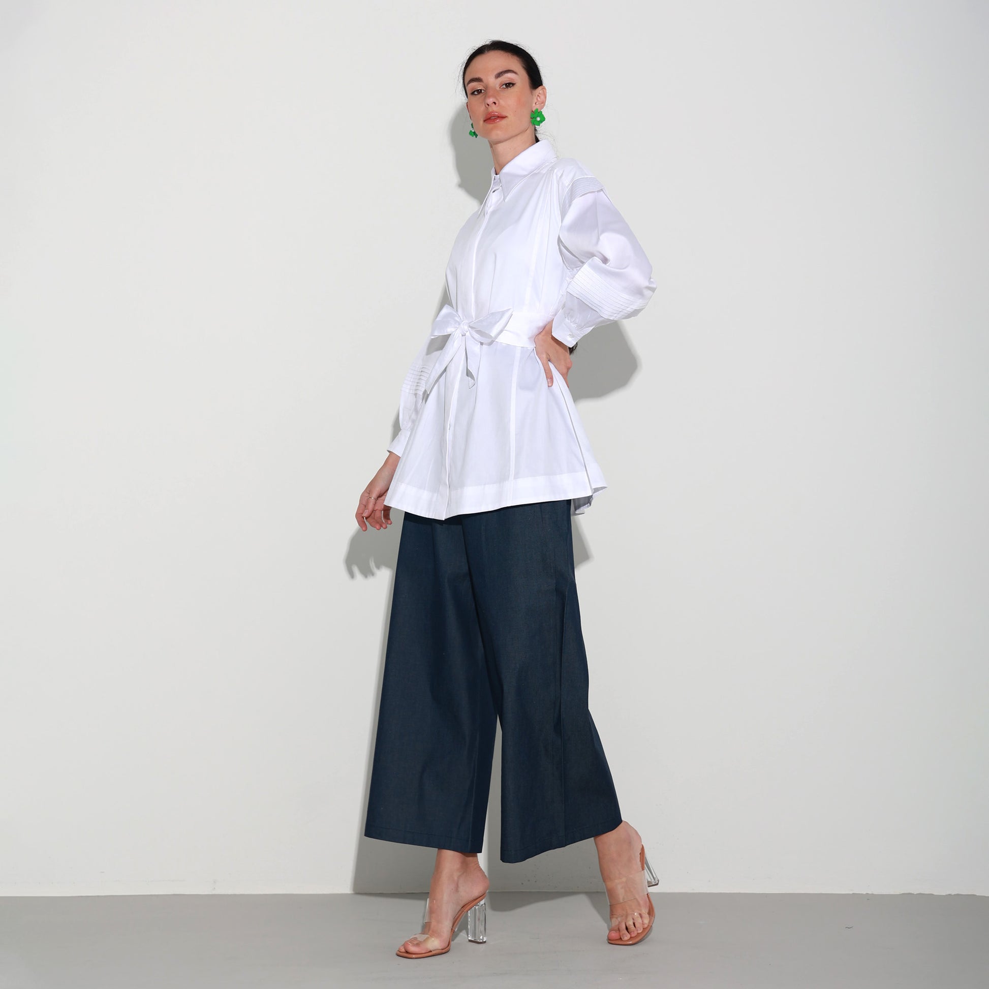 Elevate your wardrobe with this chic ensemble featuring a crisp white top and stylish navy blue pants, both crafted from 100% pure cotton for ultimate comfort and breathability. The top boasts a tailored fit with a sophisticated tie waist and a sleek hidden button-down design, perfect for both casual and formal occasions. The wide-leg pants add a modern twist, offering a flattering silhouette and versatile style. Ideal for the fashion-forward individual seeking effortless elegance and superior quality.