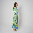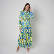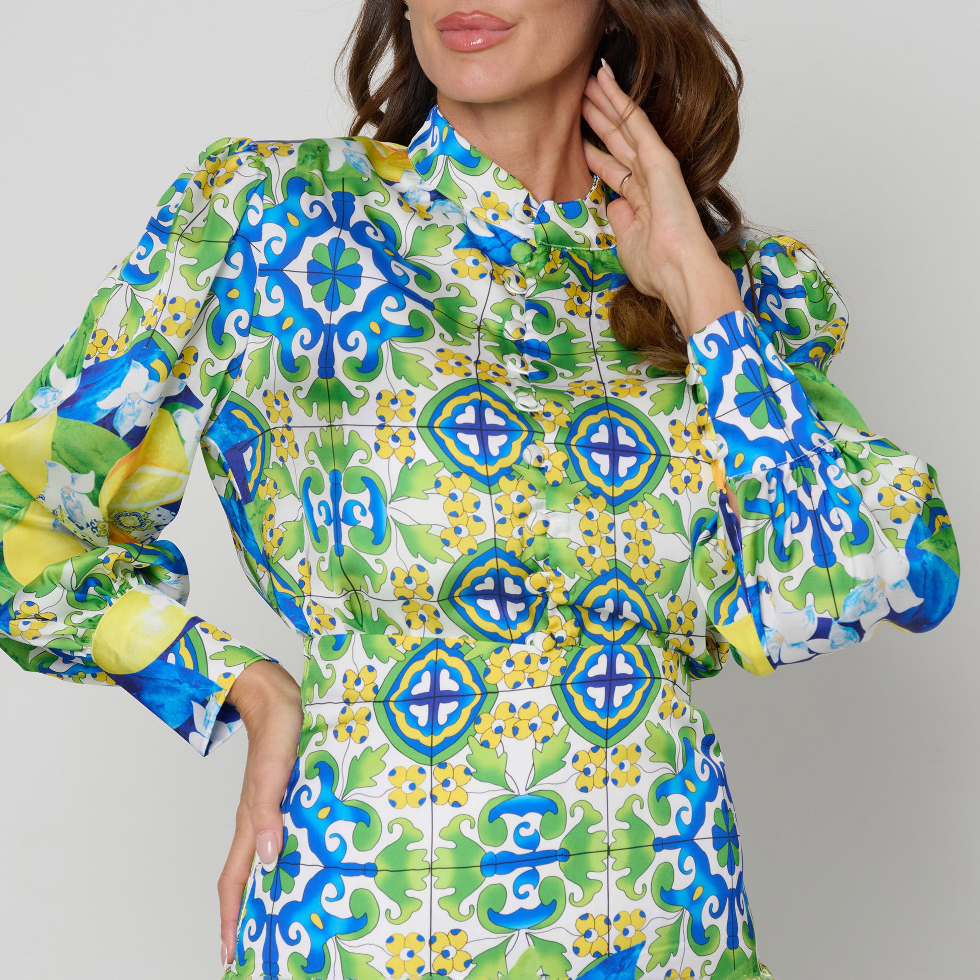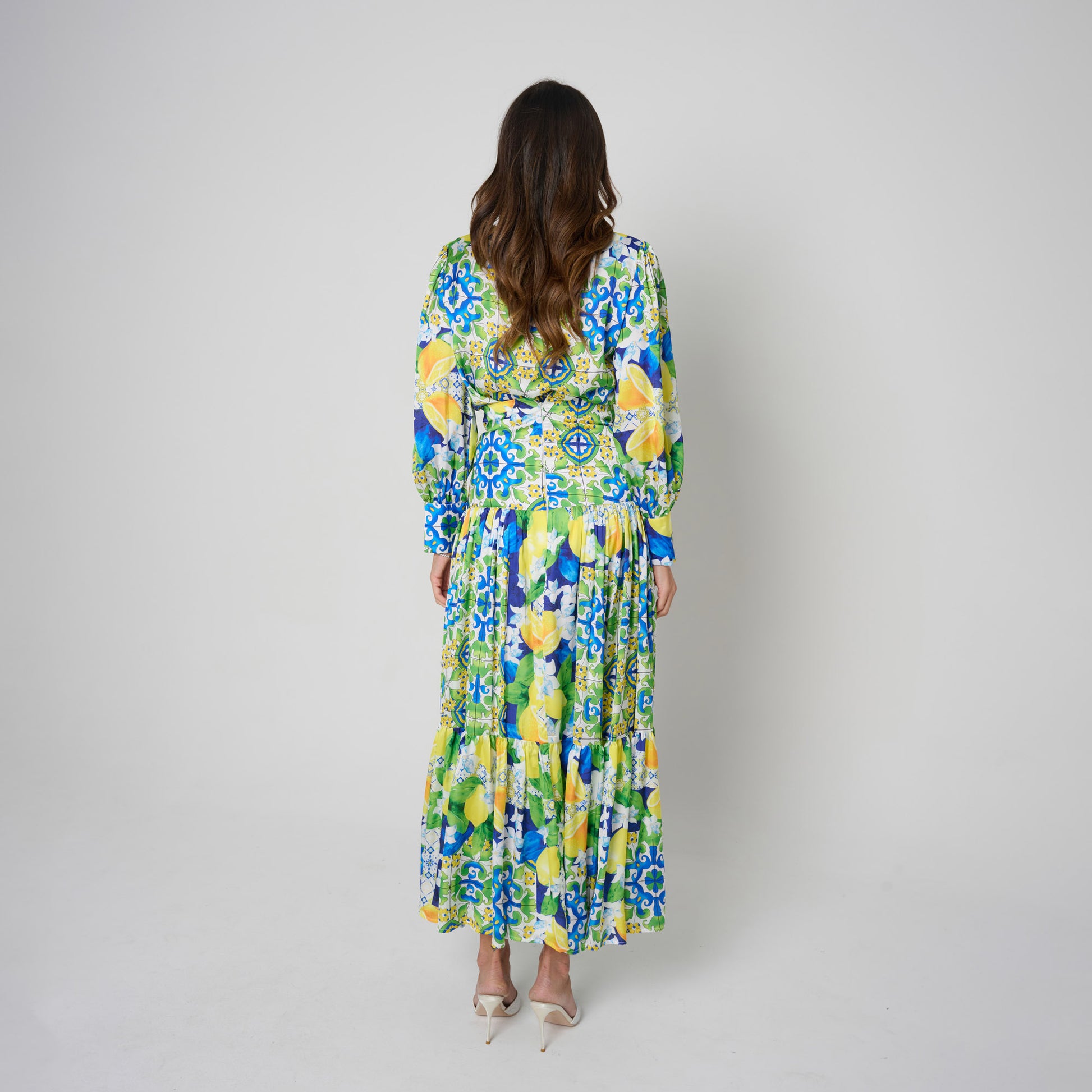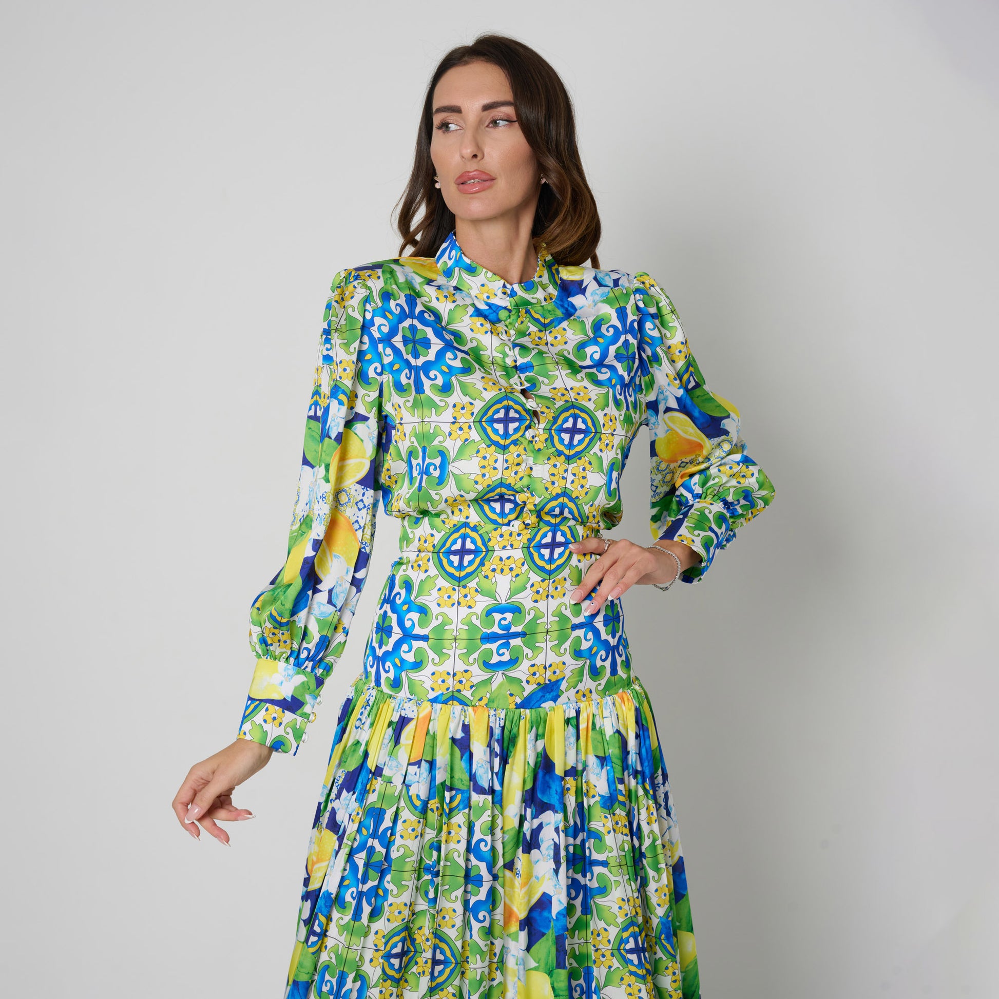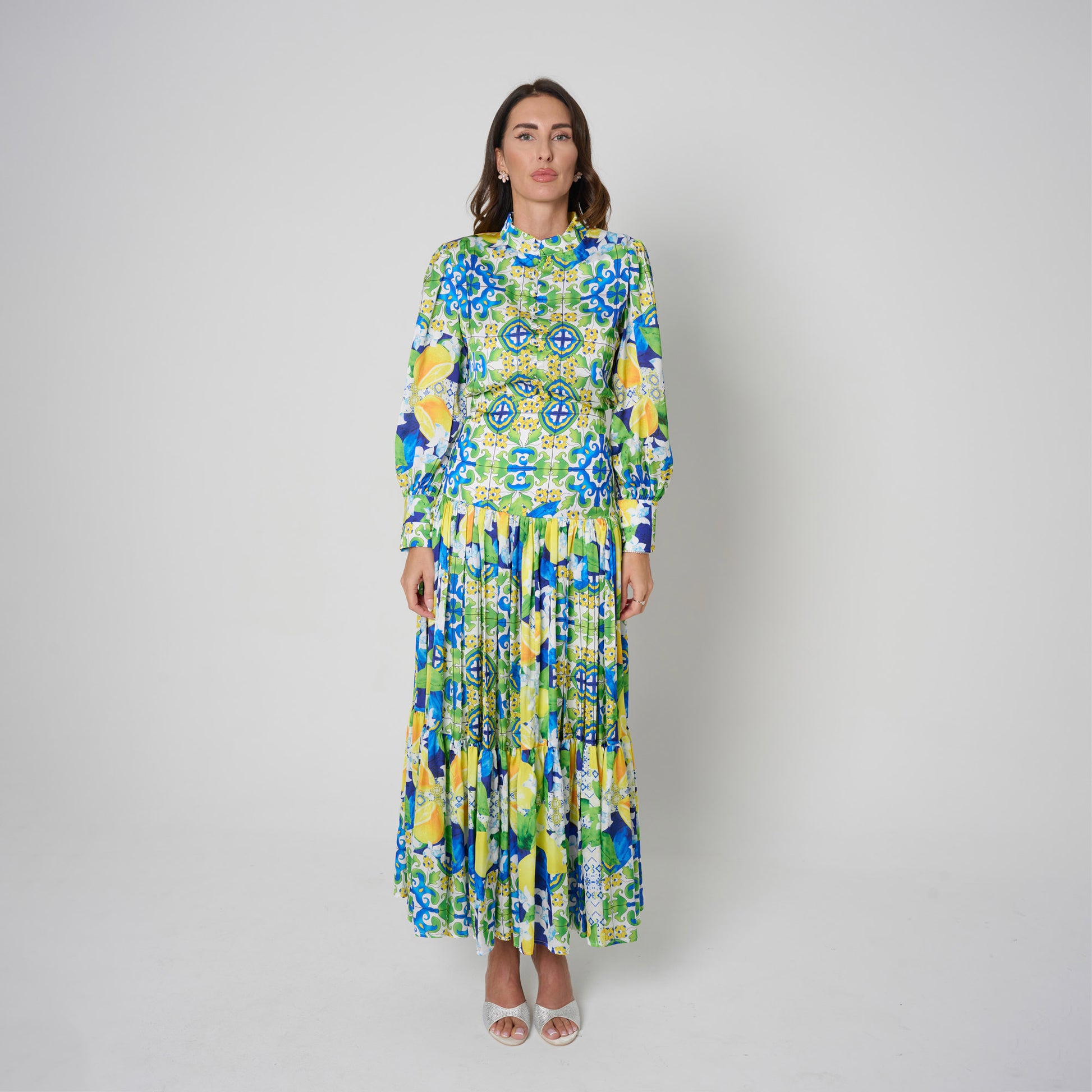 This vibrant set includes a matching shirt and skirt featuring a lively, intricate pattern in shades of green, blue, and yellow. The design is reminiscent of Mediterranean tiles, with geometric and floral elements creating a refreshing feel. The shirt has a high neckline and long sleeves with a relaxed fit, adding modest elegance, while the skirt flows with a tiered structure, enhancing its movement and volume. This eye-catching ensemble is perfect for a cheerful, sophisticated look, blending bold colors with classic charm.