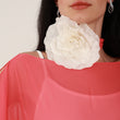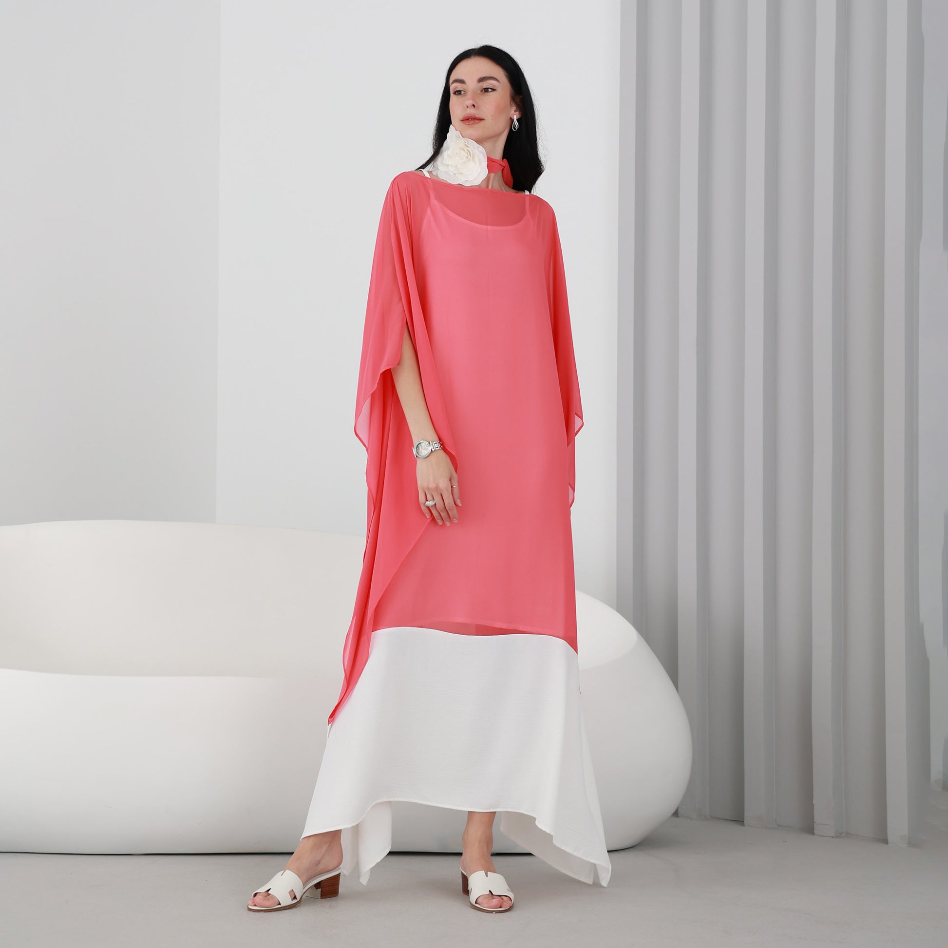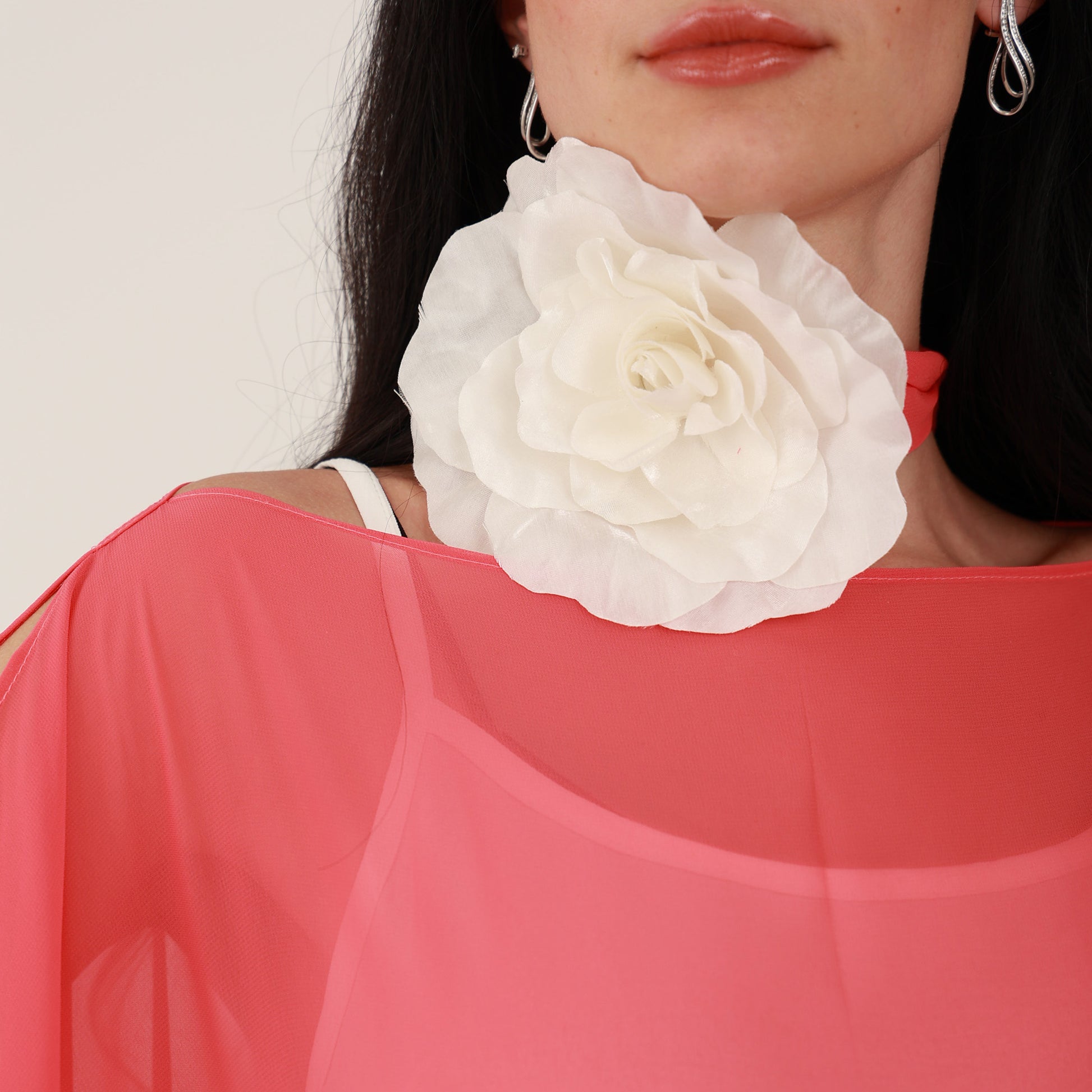 كما يتميز الفستان بقلادة على شكل زهرة جميلة على الرقبة تضيف . قلادة الزهرة مصنوعة من قماش الشيفون الذي يكمل الفستان بشكل مثالي.