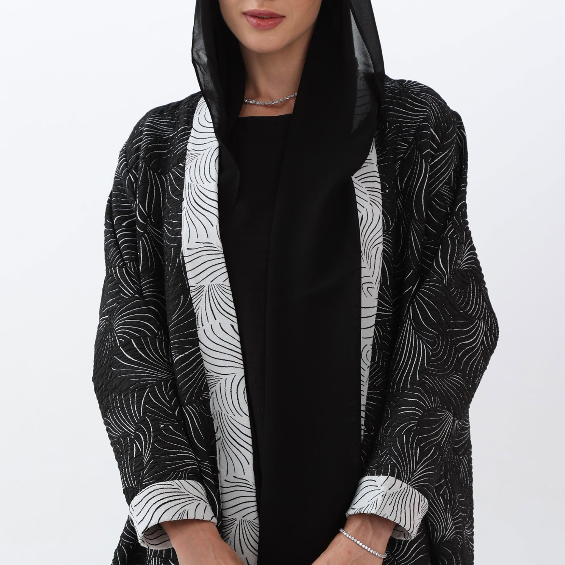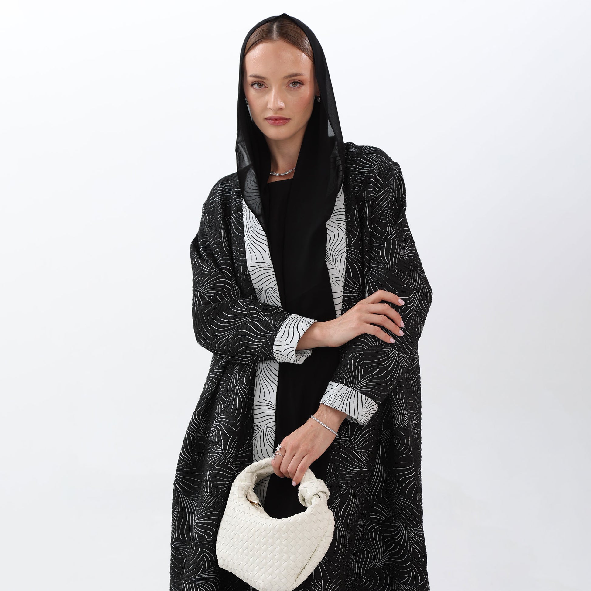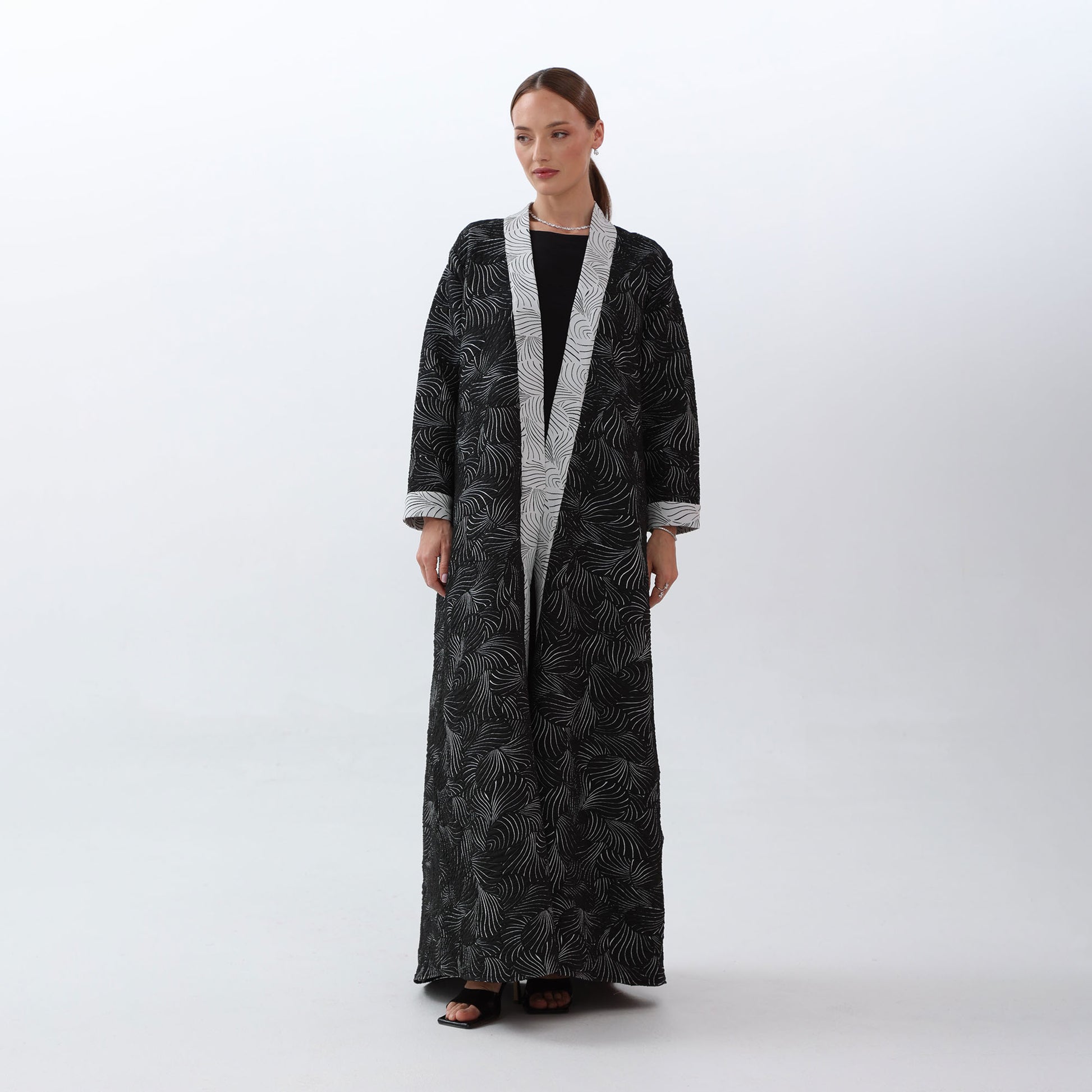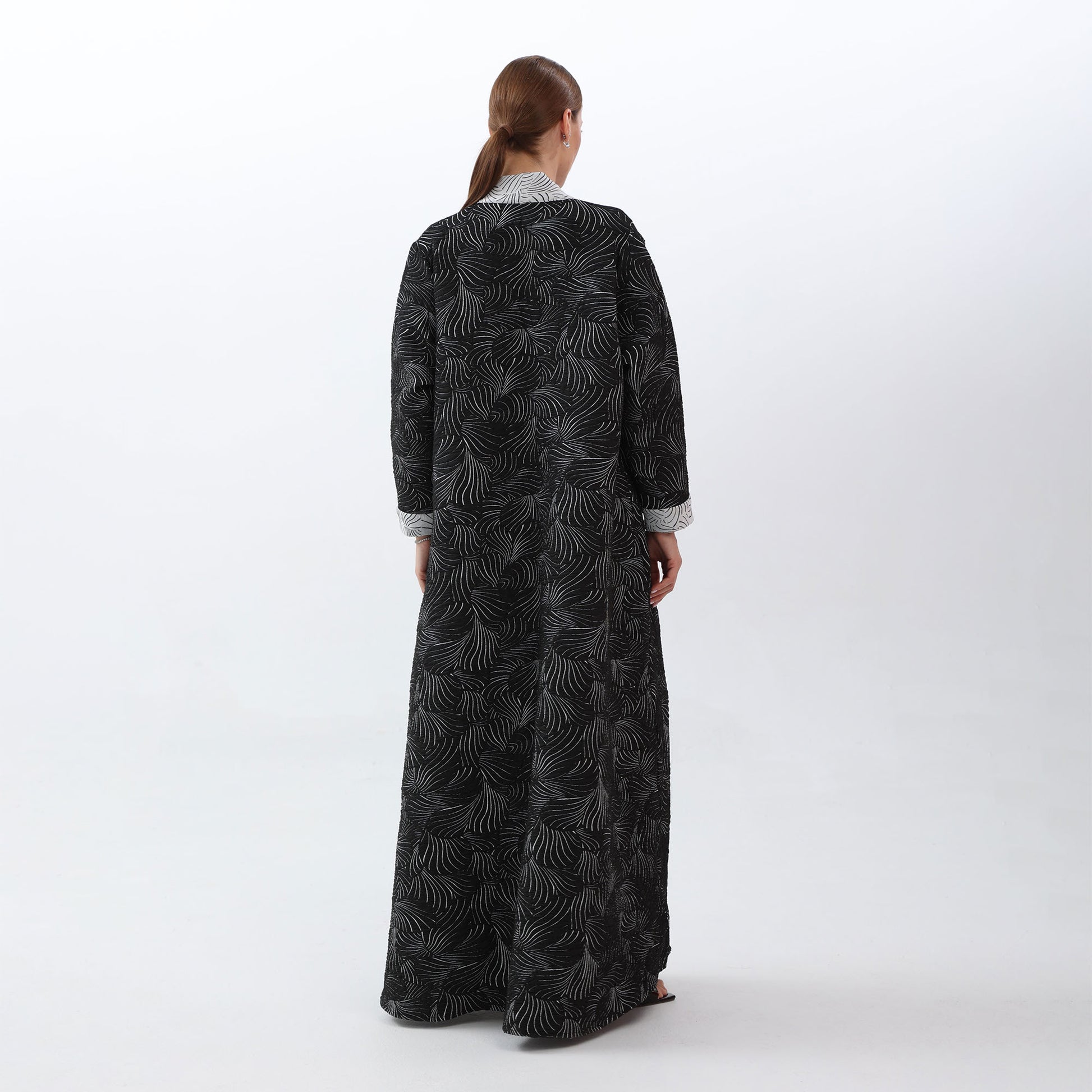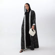 Add a touch of elegance to your wardrobe with this stunning abaya. Crafted from premium quality fabric, this abaya features a sophisticated black design with intricate patterns and a contrasting white trim. The open-front style and long flowing silhouette offer a timeless look that is perfect for any occasion, whether it's a formal event or a casual gathering. Pair this abaya with your favorite accessories and footwear to complete your ensemble. Ideal for the fashion-forward individual seeking effortless elegance and superior quality.
