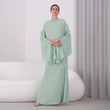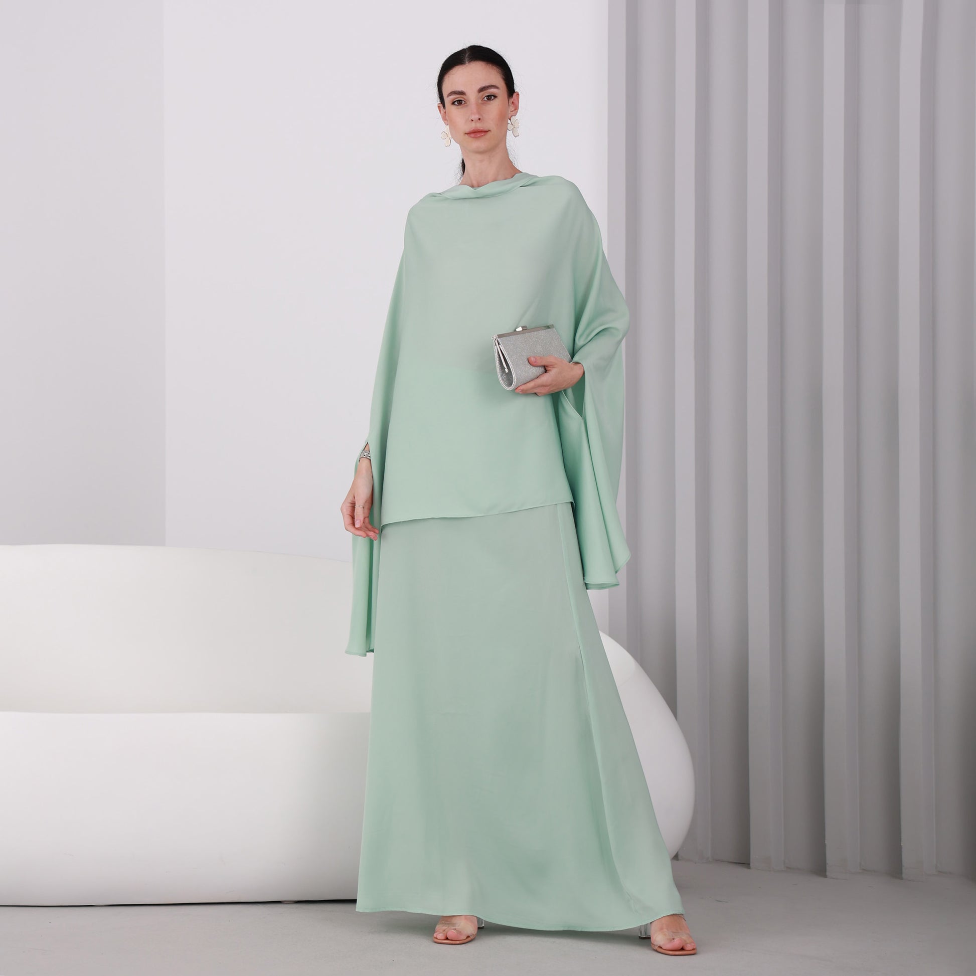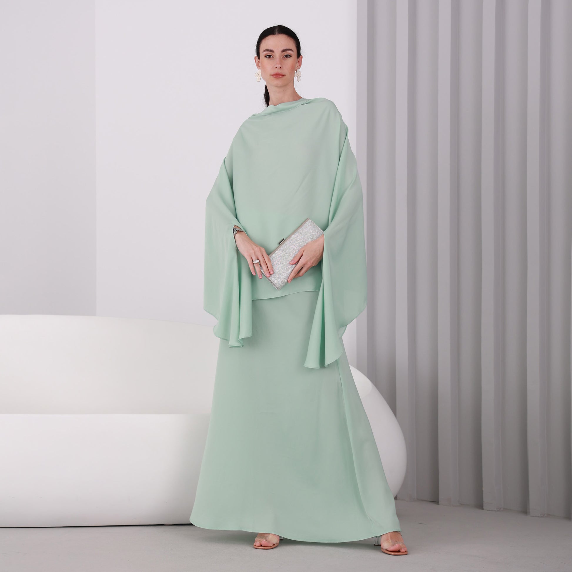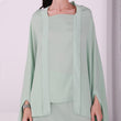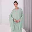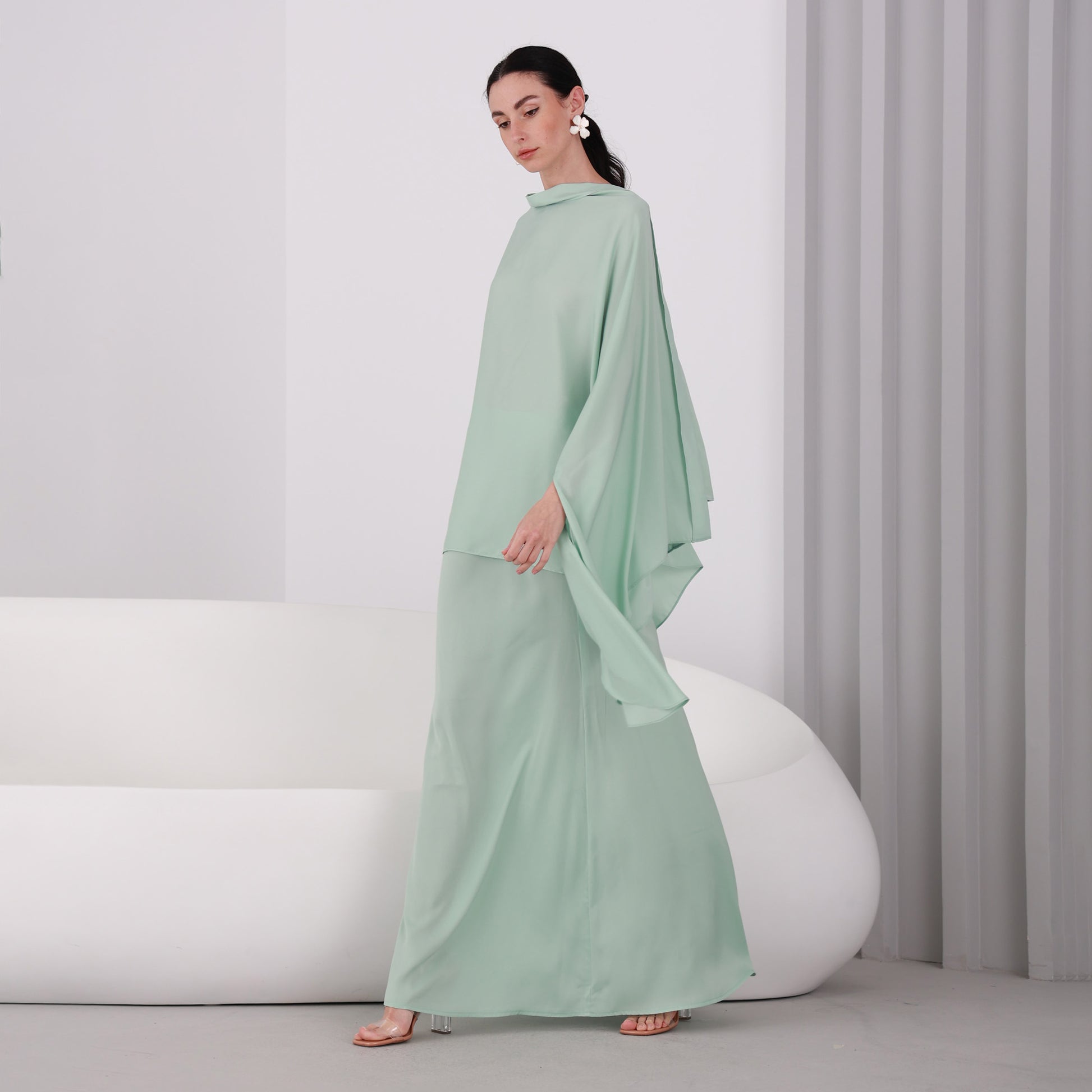 You'll be turning heads in this stunning set, consisting of a floor-length flowy skirt and a delicately designed top. The Light Pistachio silk chiffon fabric drapes gracefully, exuding elegance and sophistication. The top boasts a special design. The skirt is also a statement piece, with a subtle shimmer that catches the eye as you move. Together, the set creates a timeless and memorable look that's perfect for any formal occasion.