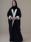عباية سوداء بقصة واسعة مع أكمام وياقة بلون أصفر هادئ مصنوعة من قماش الكوبرو