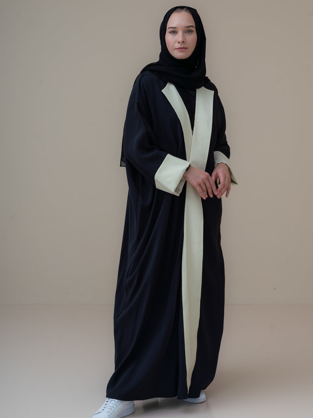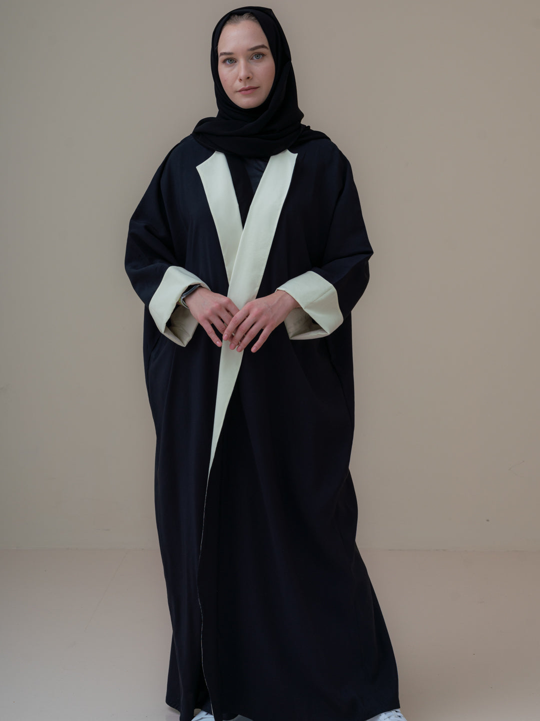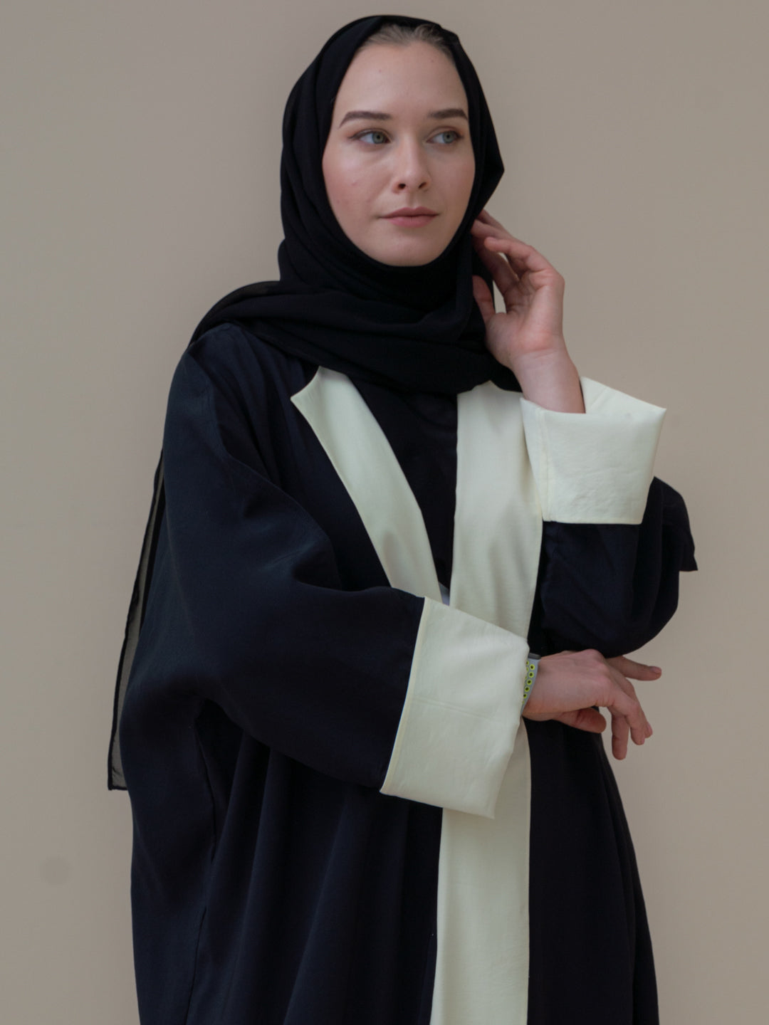 Be yourself by wearing Adira Abaya every day. A wide cut black Abaya with baby yellow collar and cuffs. Made from Japanese Cupro fabric, soft and luxurious.