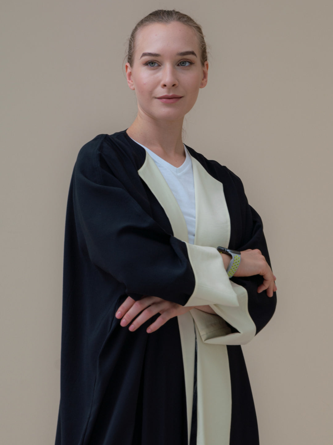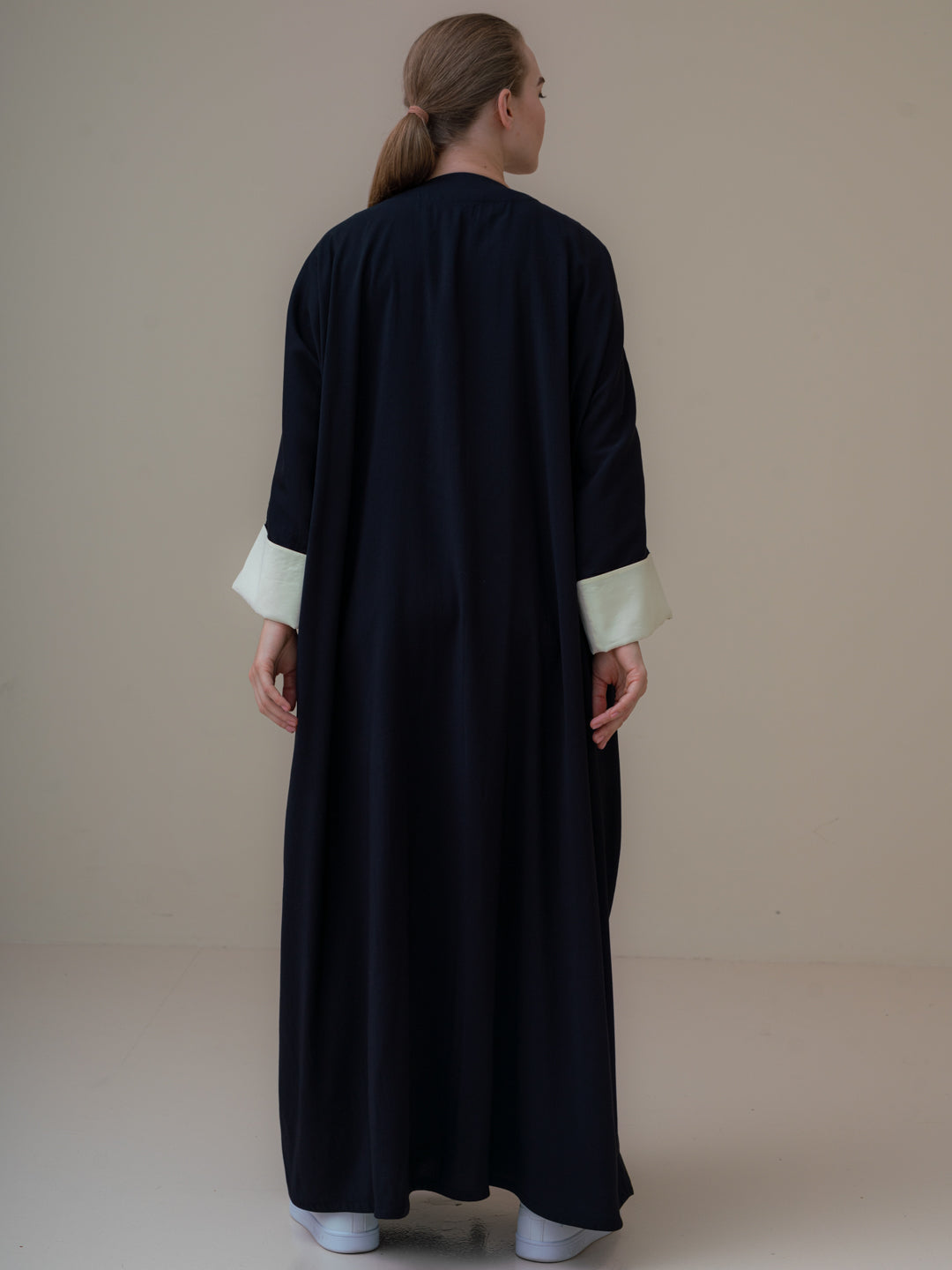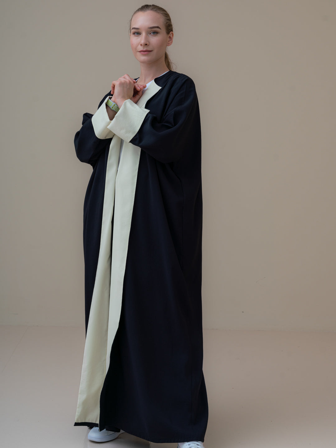 Be yourself by wearing Adira Abaya every day. A wide cut black Abaya with baby yellow collar and cuffs. Made from Japanese Cupro fabric, soft and luxurious.
