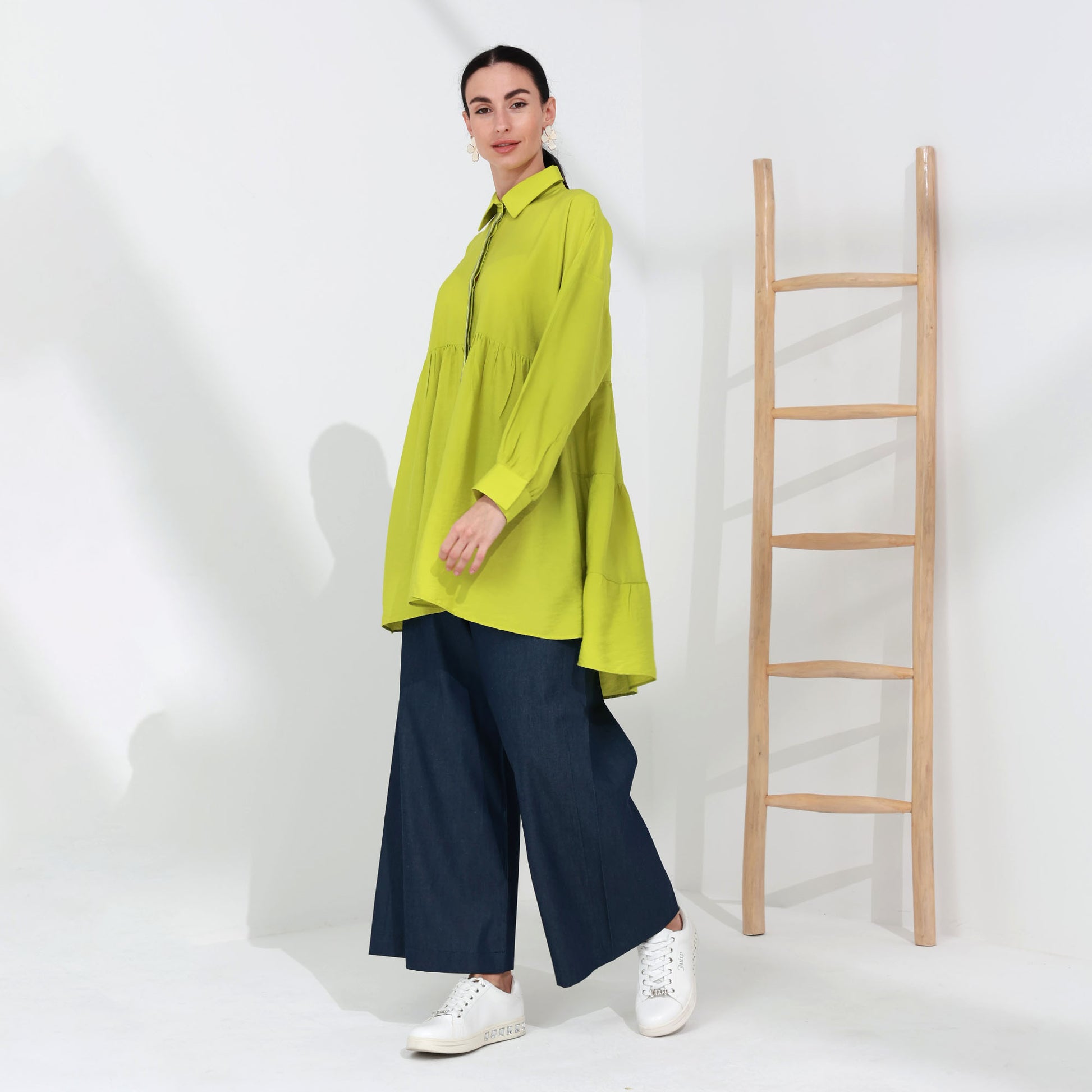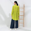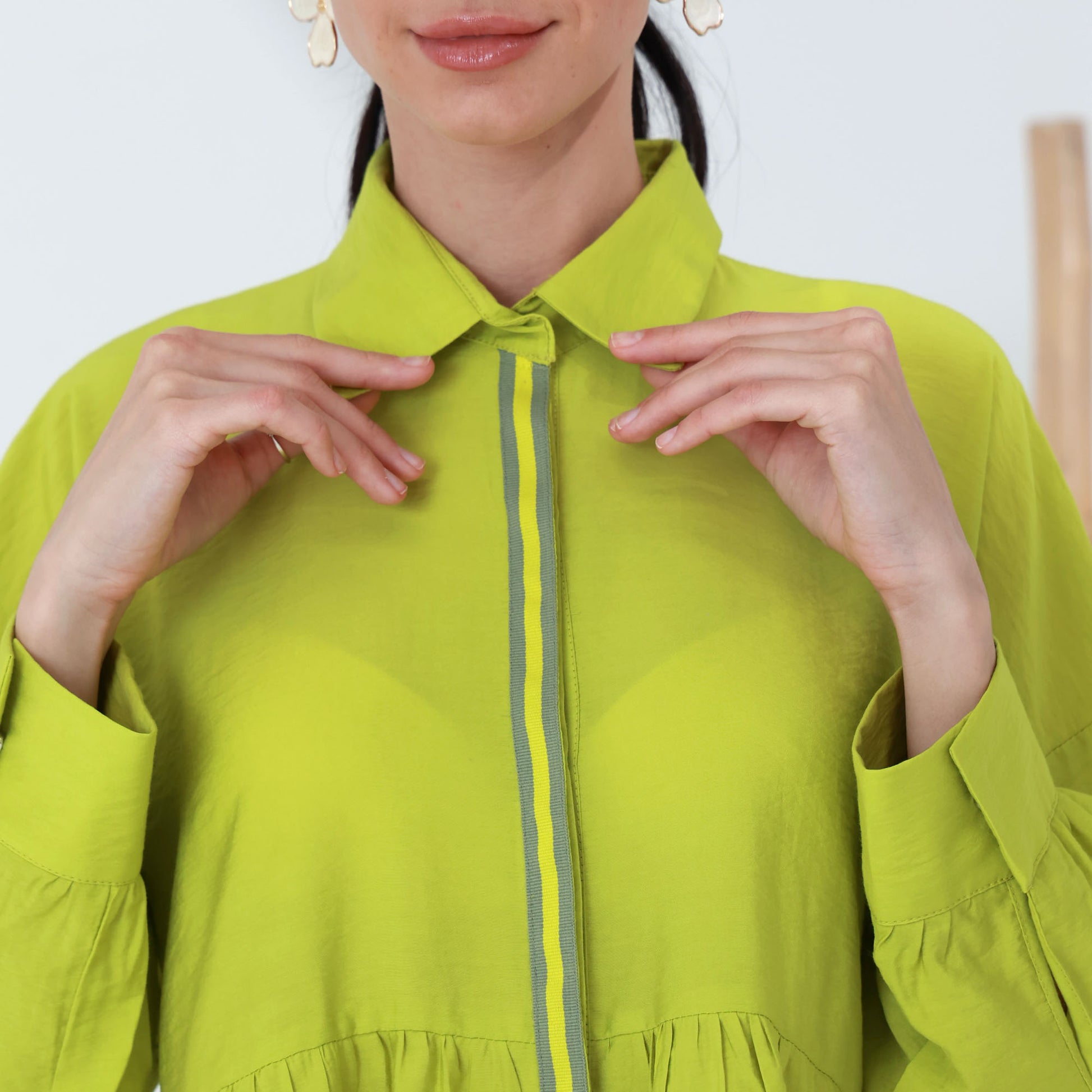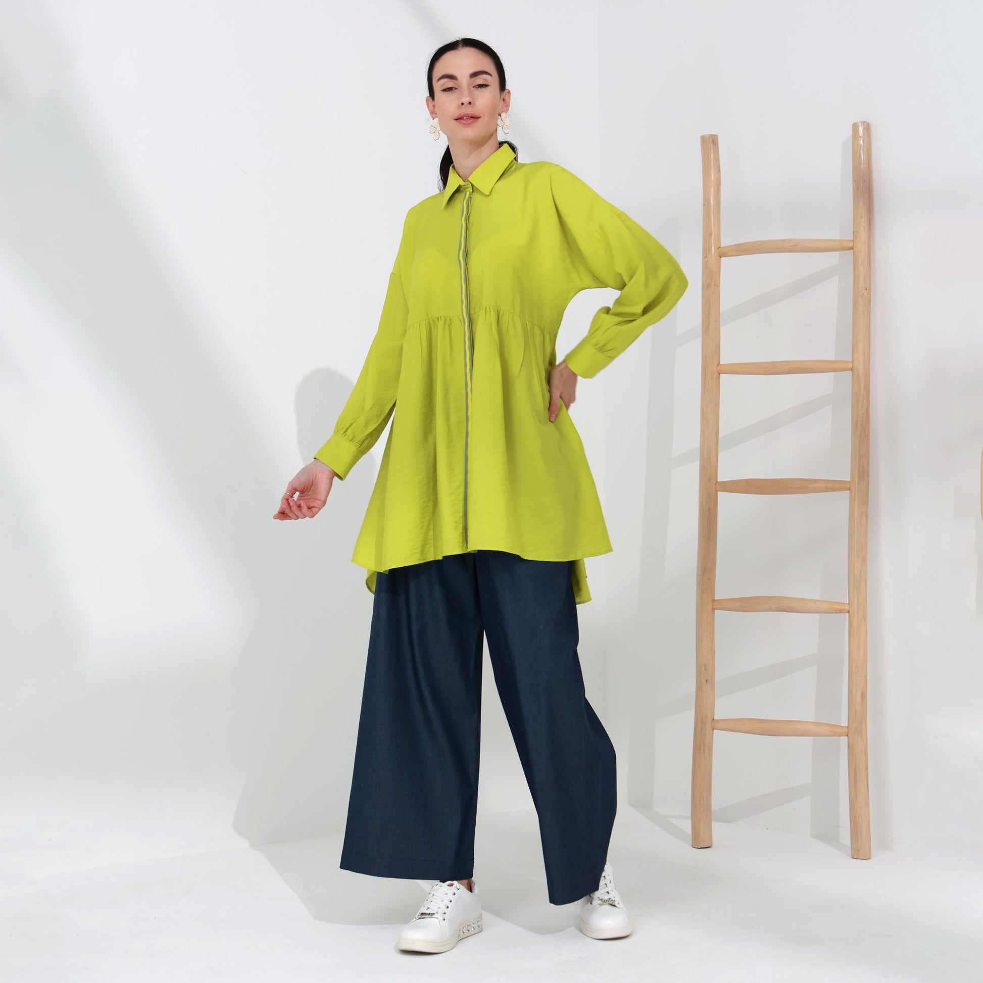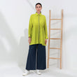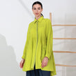 Brighten your wardrobe with this vibrant shirt made from luxurious copra fabric. Featuring a bold, lime-green hue, this shirt brings a fresh and lively touch to any outfit. The fabric is lightweight and breathable, offering all-day comfort. The shirt's design includes a classic collar, button-down front, and a gathered waist for a flattering fit that flows gracefully over the body. Its high-low hemline adds a modern twist, perfect for pairing with wide-leg pants or jeans. Embrace a blend of comfort and style with this standout piece, ideal for both casual and chic looks.