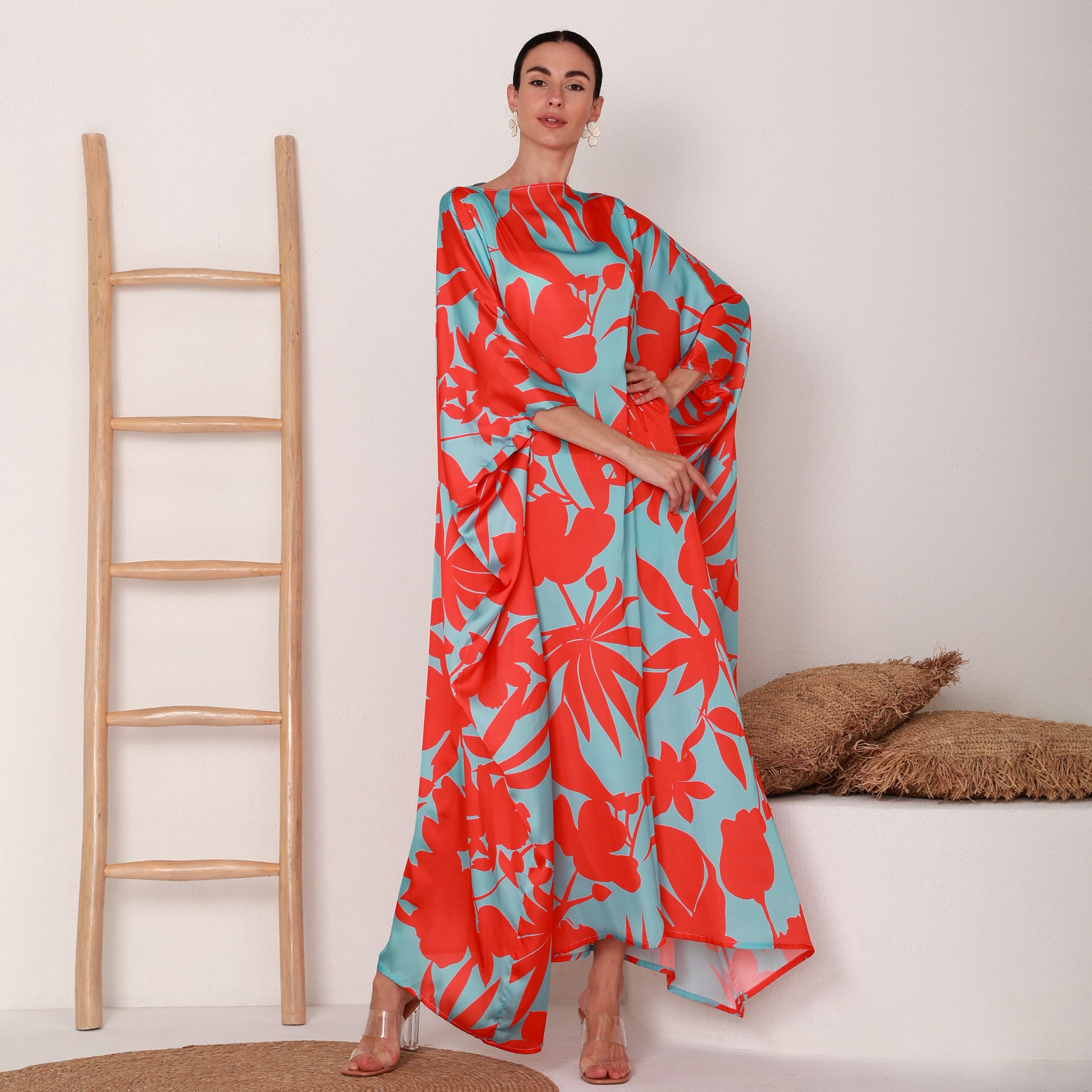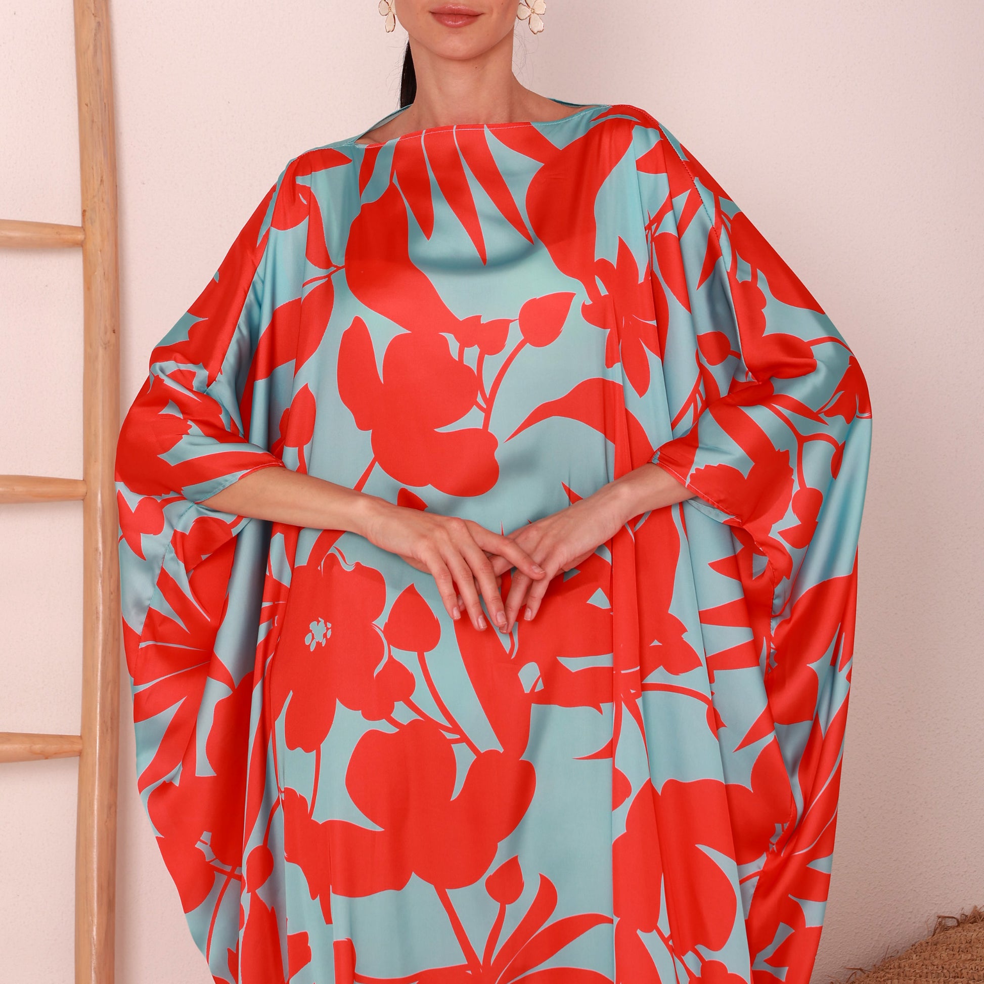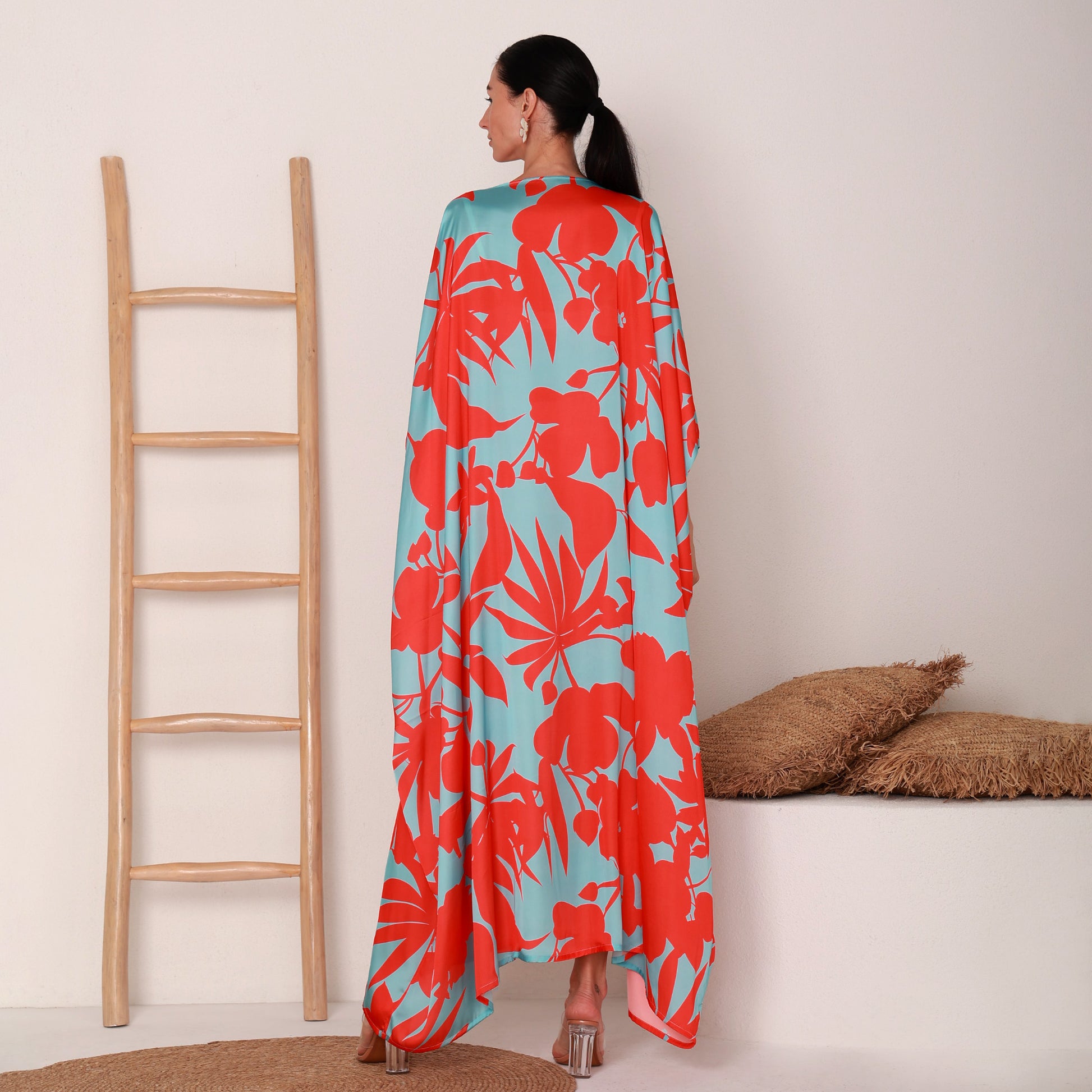 Muhra kaftan features a loose and flowy silhouette, with a straight neckline and wide sleeves that add to its relaxed and easy-going vibe. The Scarlet red color is attractive and refreshing, while the prints are intricate and delicate, creating a sophisticated and feminine look. The lightweight chiffon silk material drapes beautifully and is perfect for warm weather, while the oversized design ensures that you stay comfortable and relaxed. You can pair it with some heels and jewelry for a more formal occasion. Overall, this kaftan is a versatile and chic addition to any wardrobe.