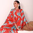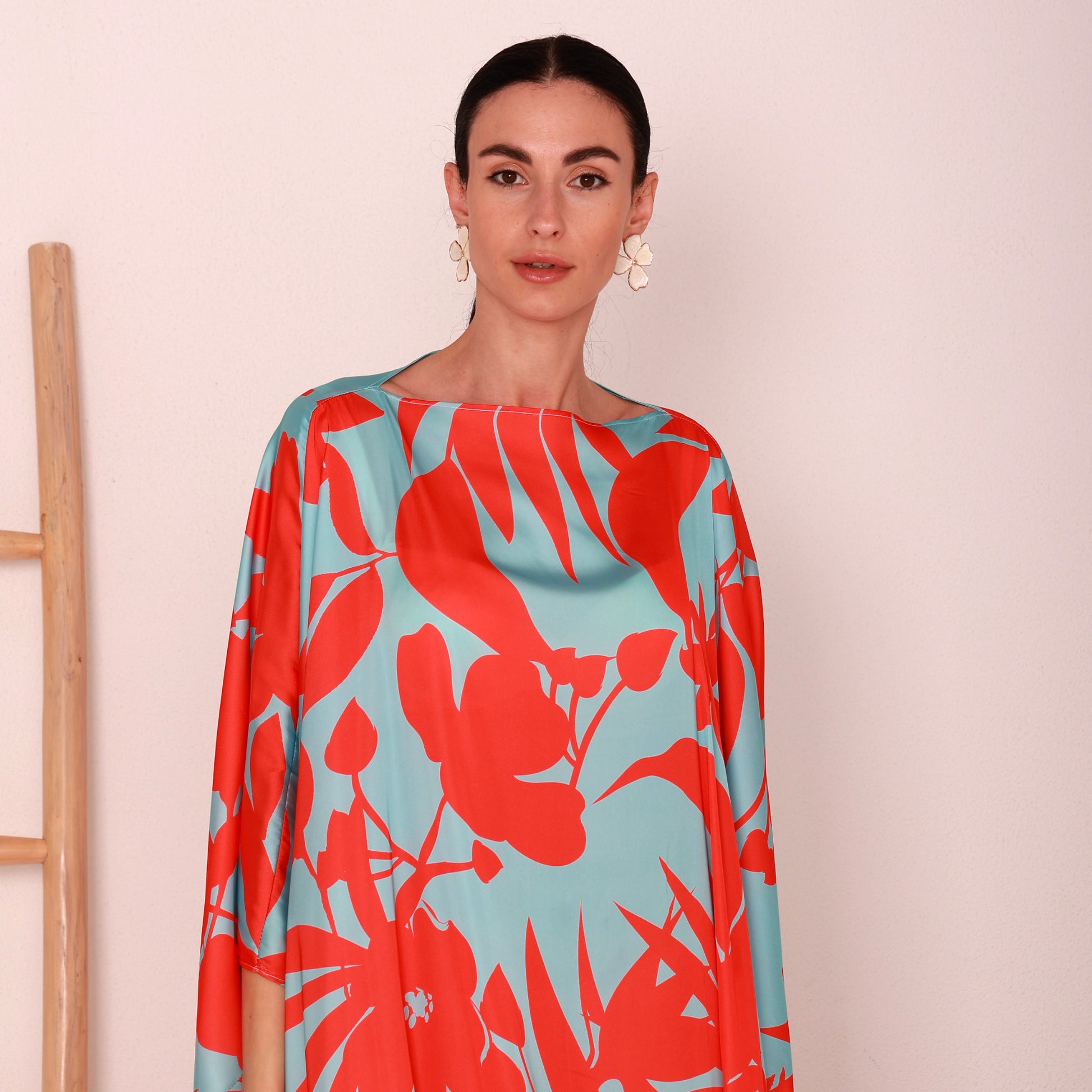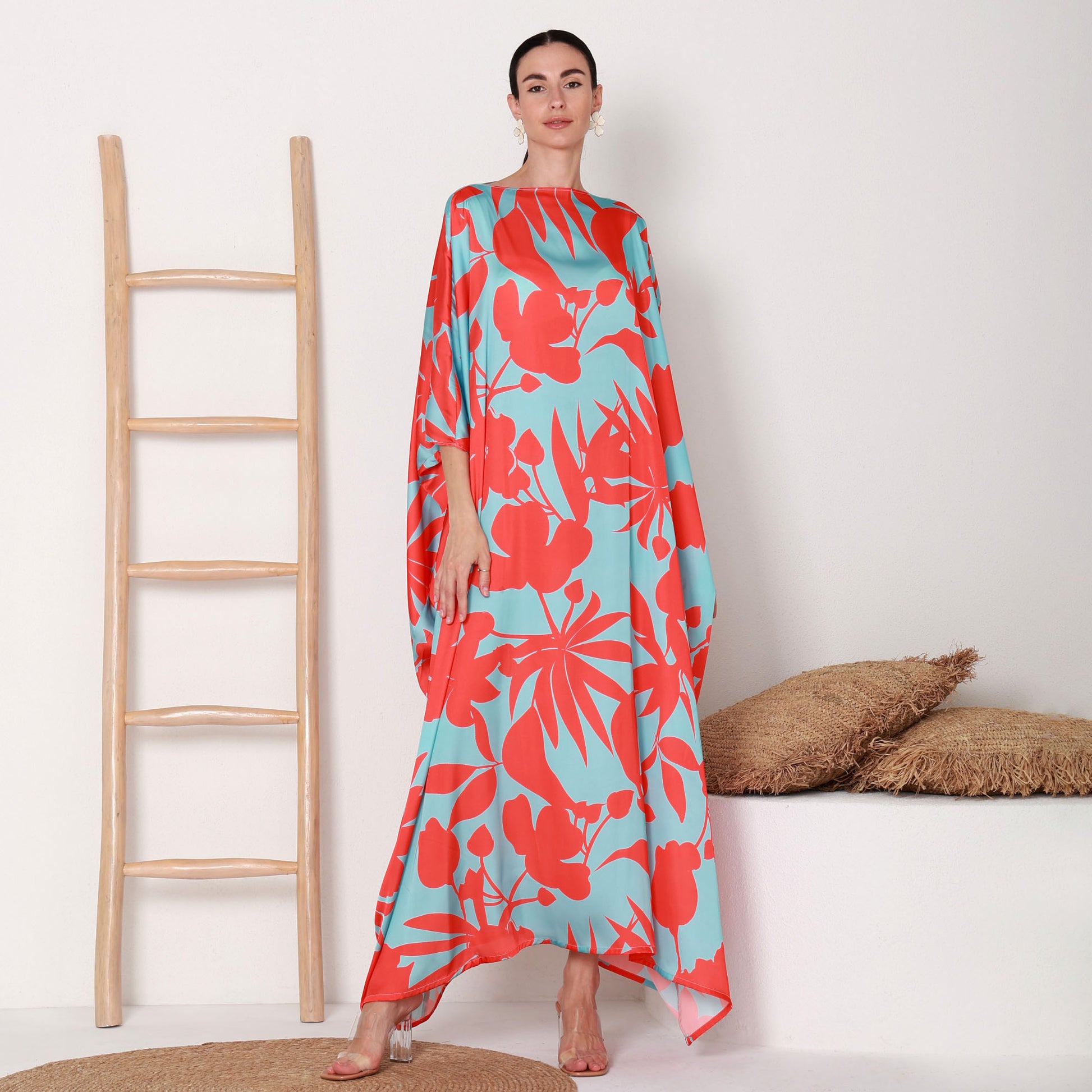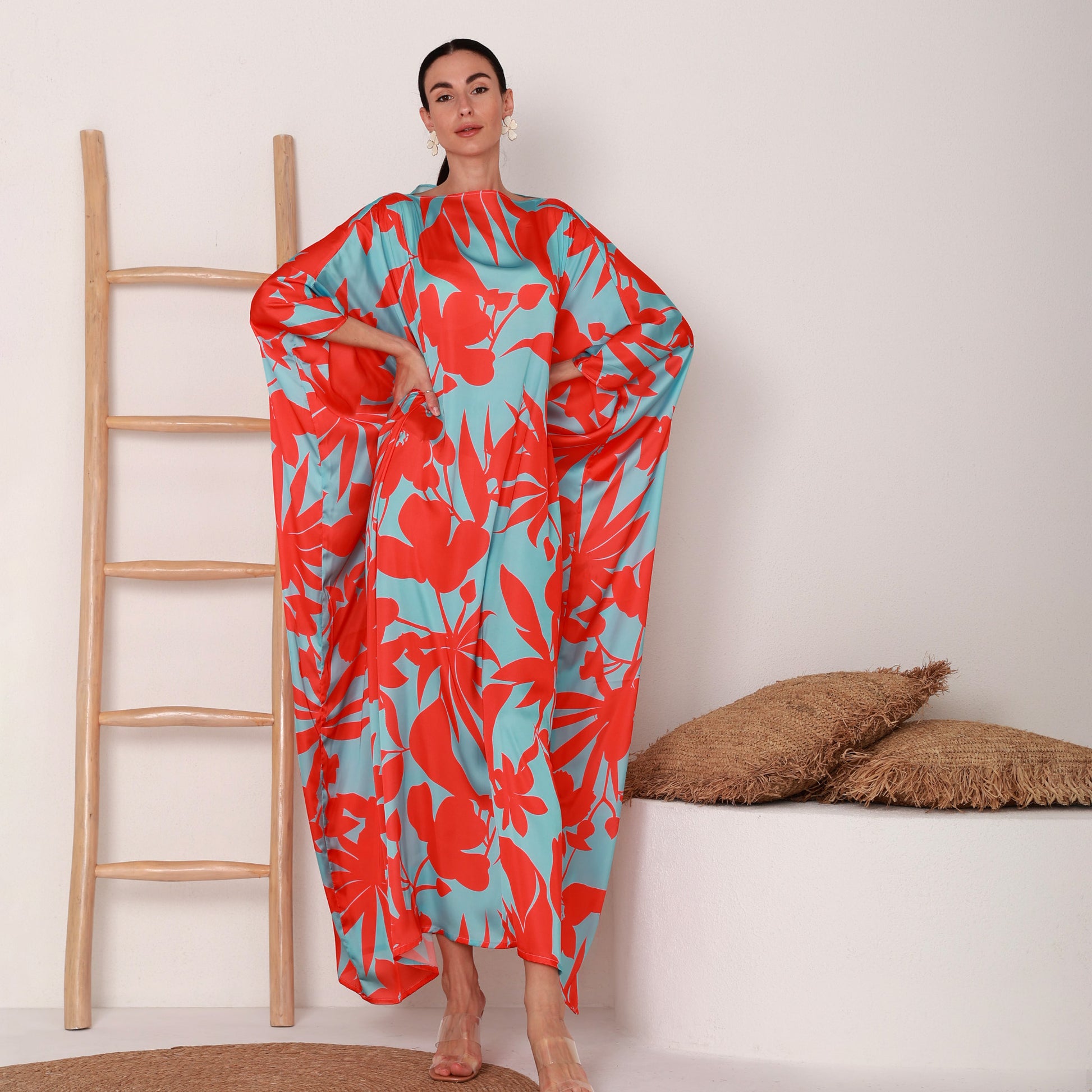Muhra kaftan features a loose and flowy silhouette, with a straight neckline and wide sleeves that add to its relaxed and easy-going vibe. The Scarlet red color is attractive and refreshing, while the prints are intricate and delicate, creating a sophisticated and feminine look. The lightweight chiffon silk material drapes beautifully and is perfect for warm weather, while the oversized design ensures that you stay comfortable and relaxed. You can pair it with some heels and jewelry for a more formal occasion. Overall, this kaftan is a versatile and chic addition to any wardrobe.