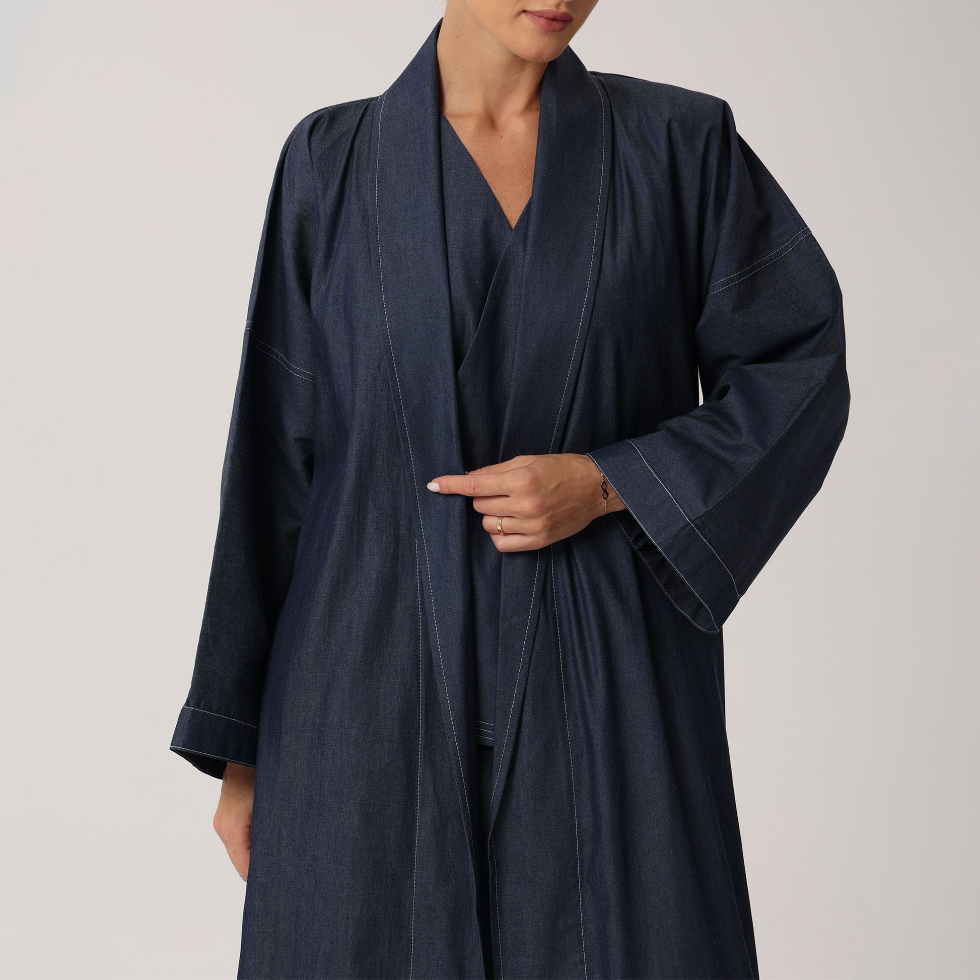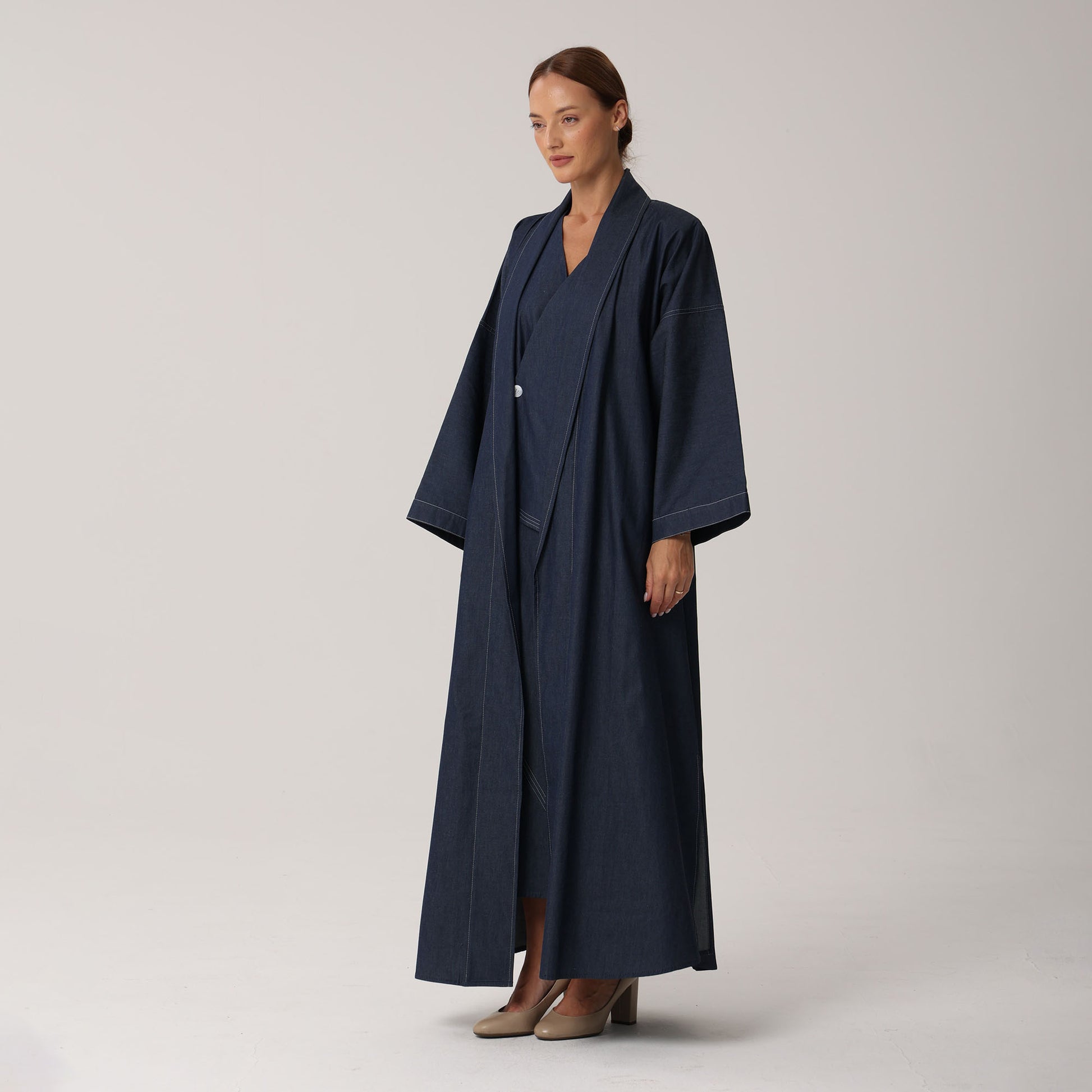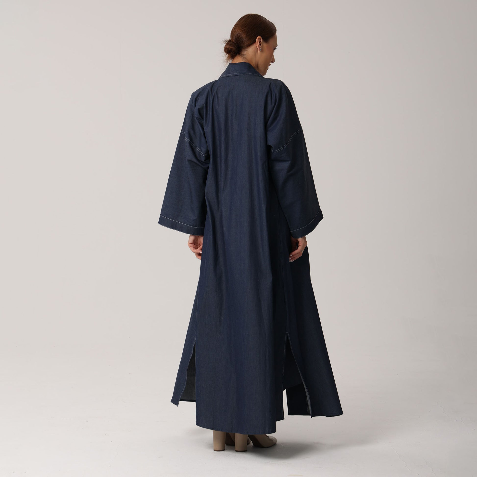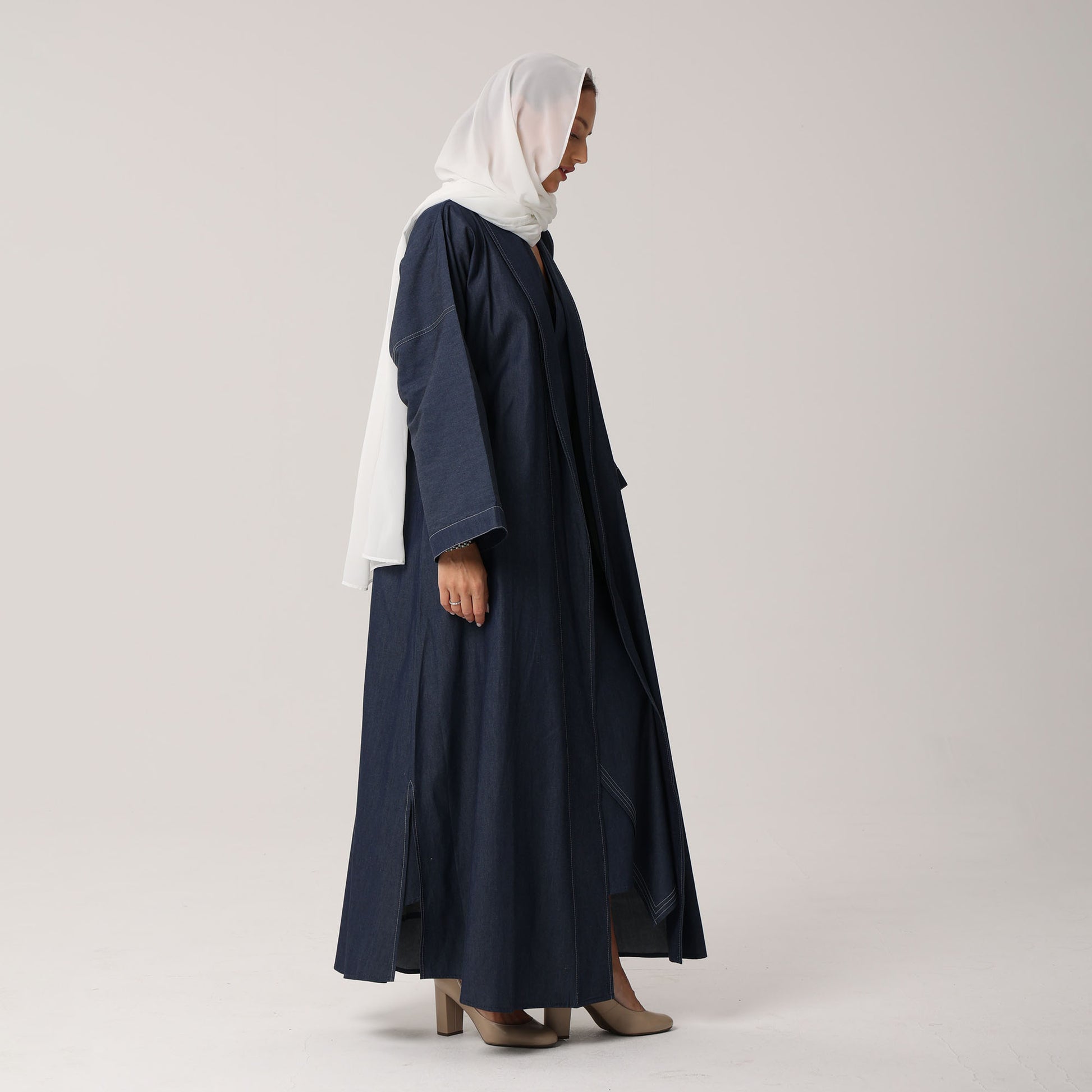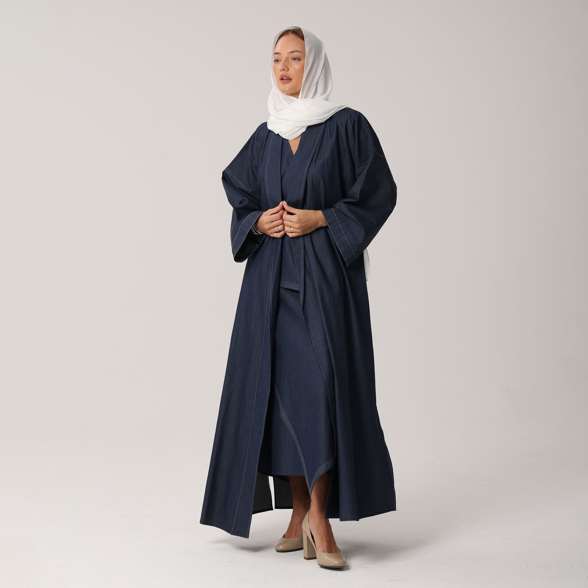This Emma Abaya set features a straight-cut Abaya with wide sleeves, providing modest coverage and freedom of movement.