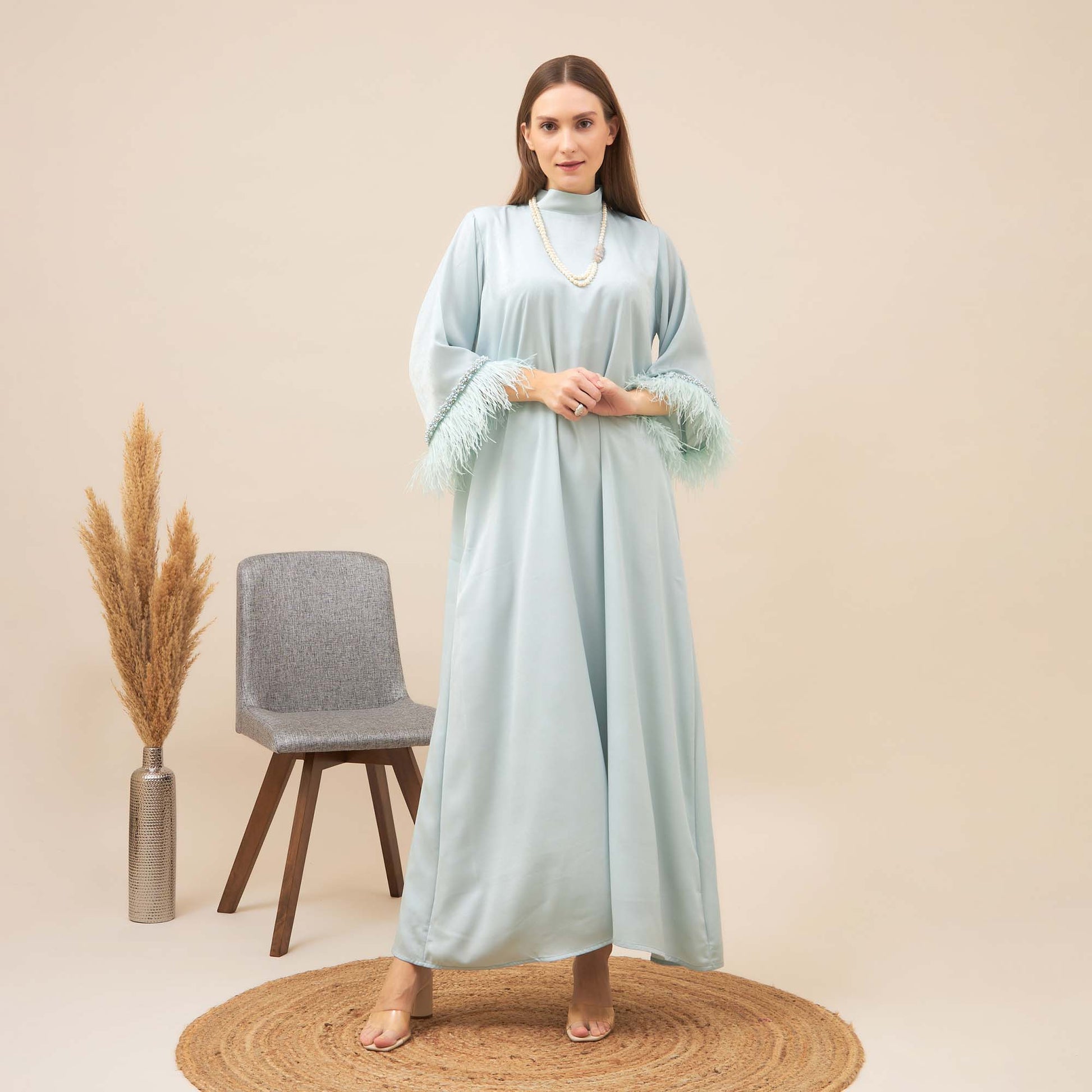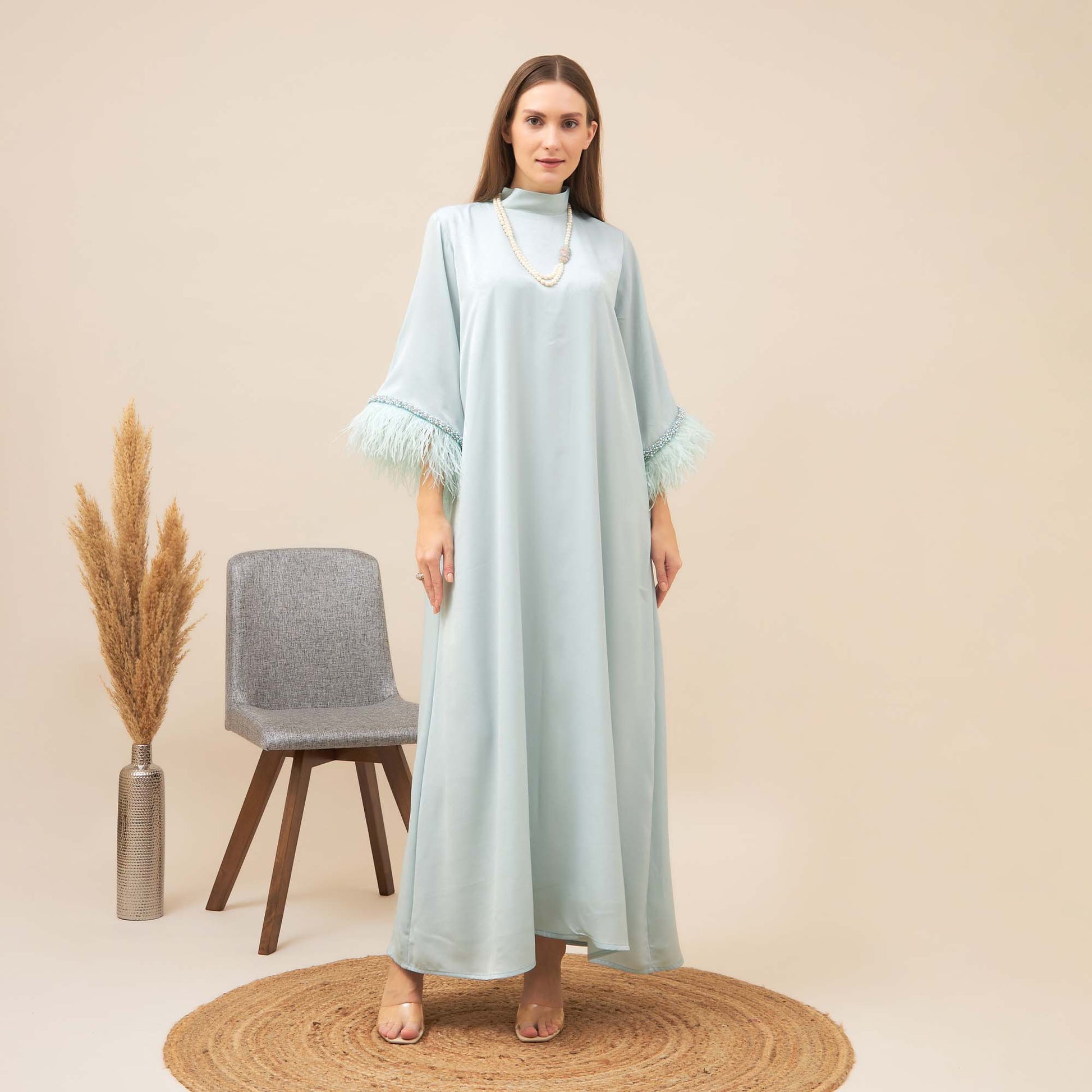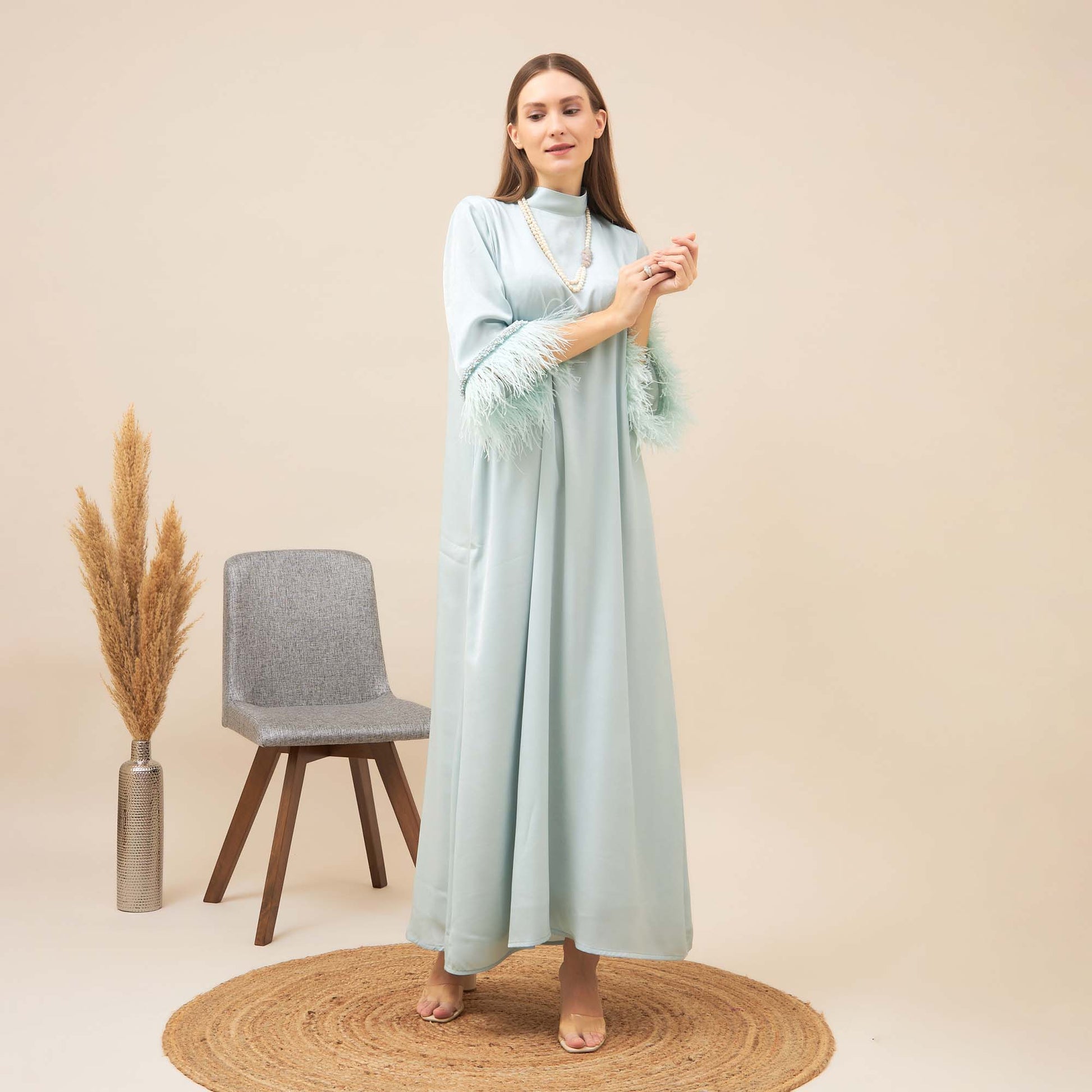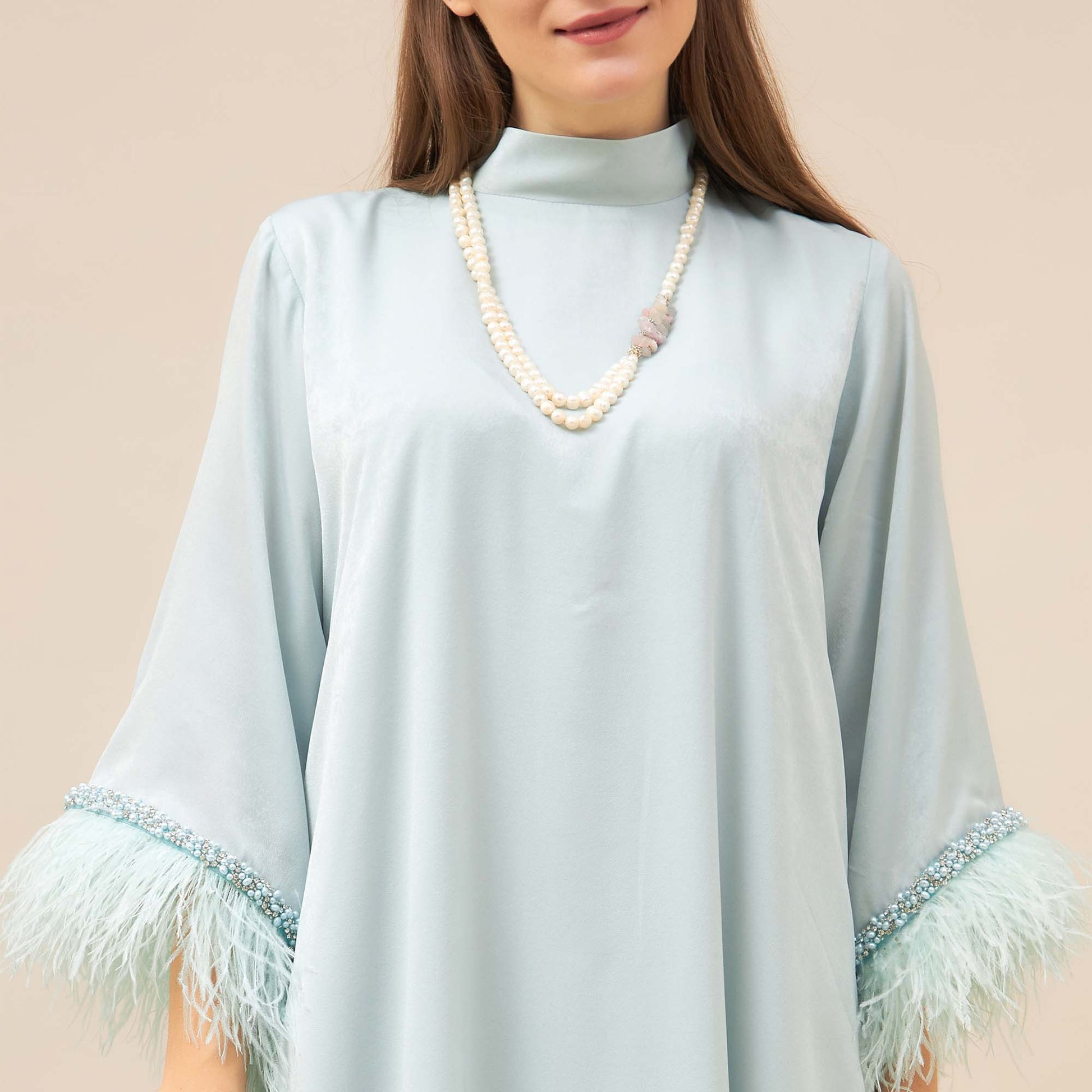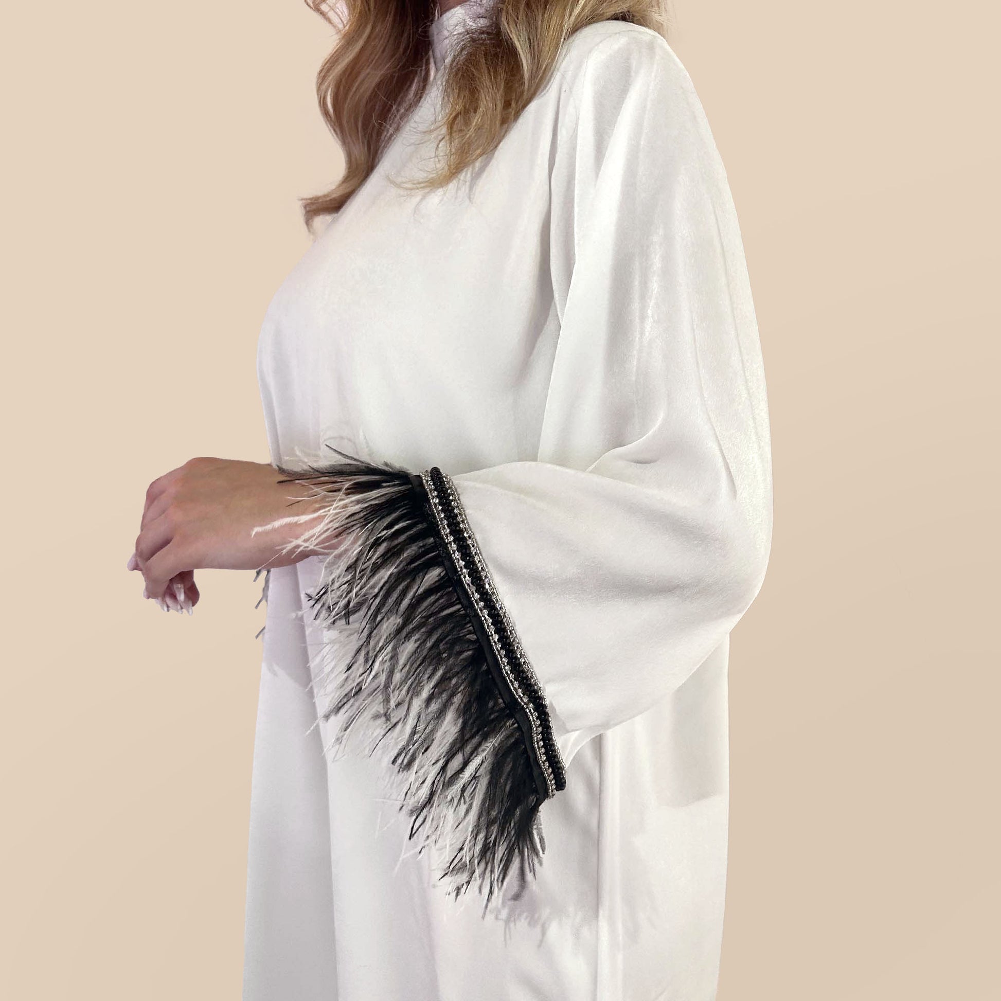 Crafted from a lightweight and airy silk fabric. Adorning the sleeves are delicate feathers that add a touch of whimsy and playfulness to the dress. The sleeves are designed to be slightly voluminous, adding to the flowy nature of the dress. The high neckline is kept simple and elegant, allowing the focus to remain on the feather detailing and the dress's effortless silhouette.