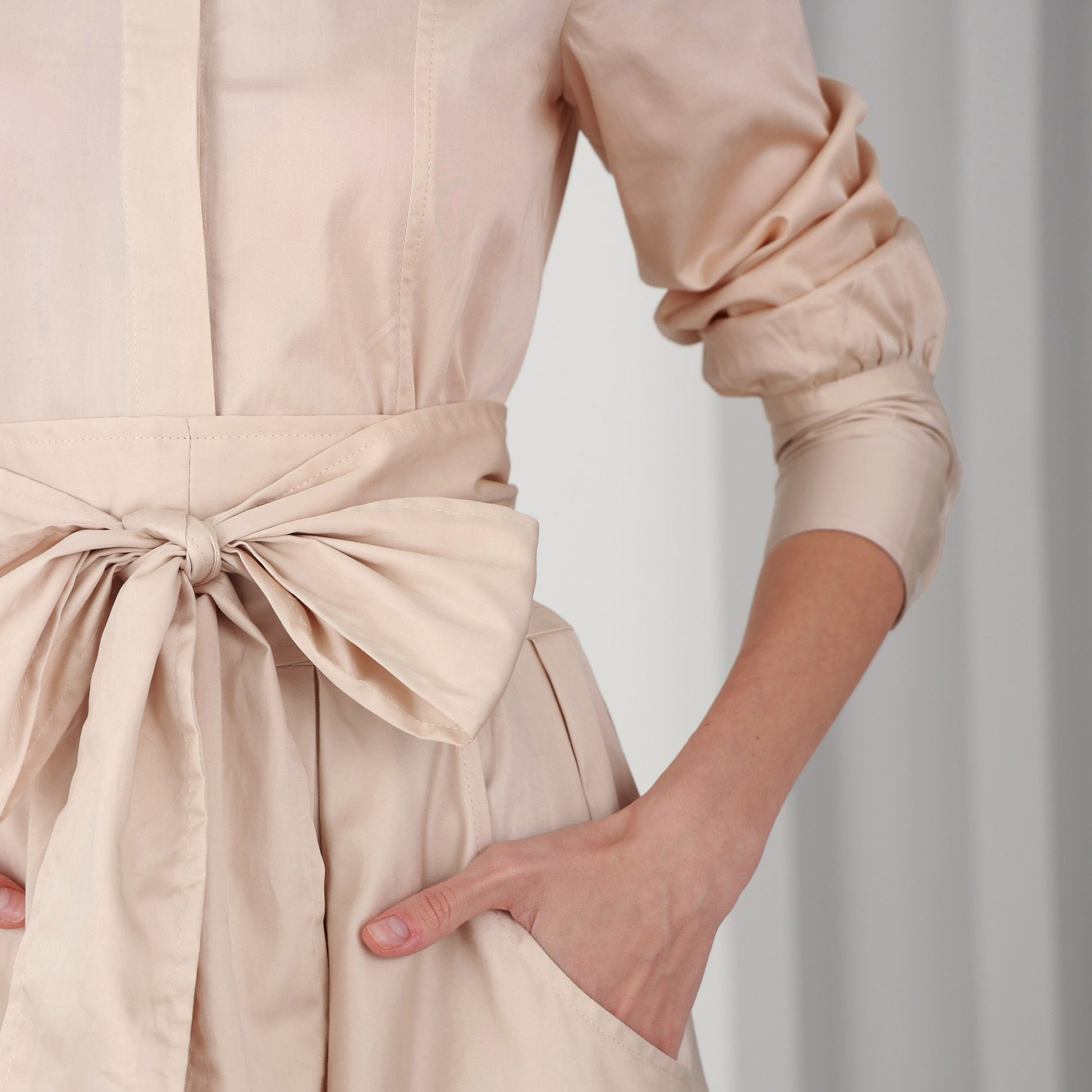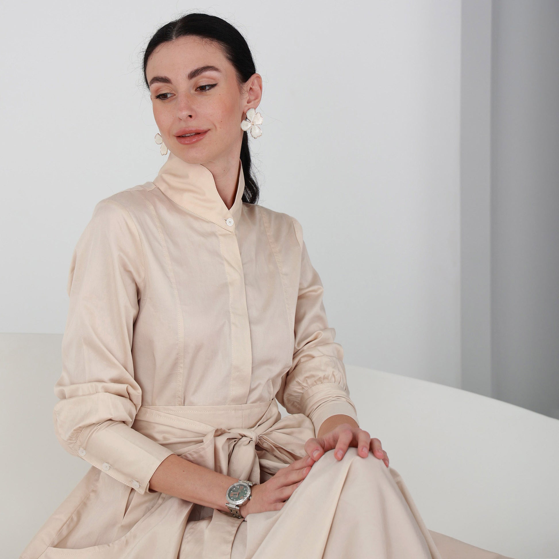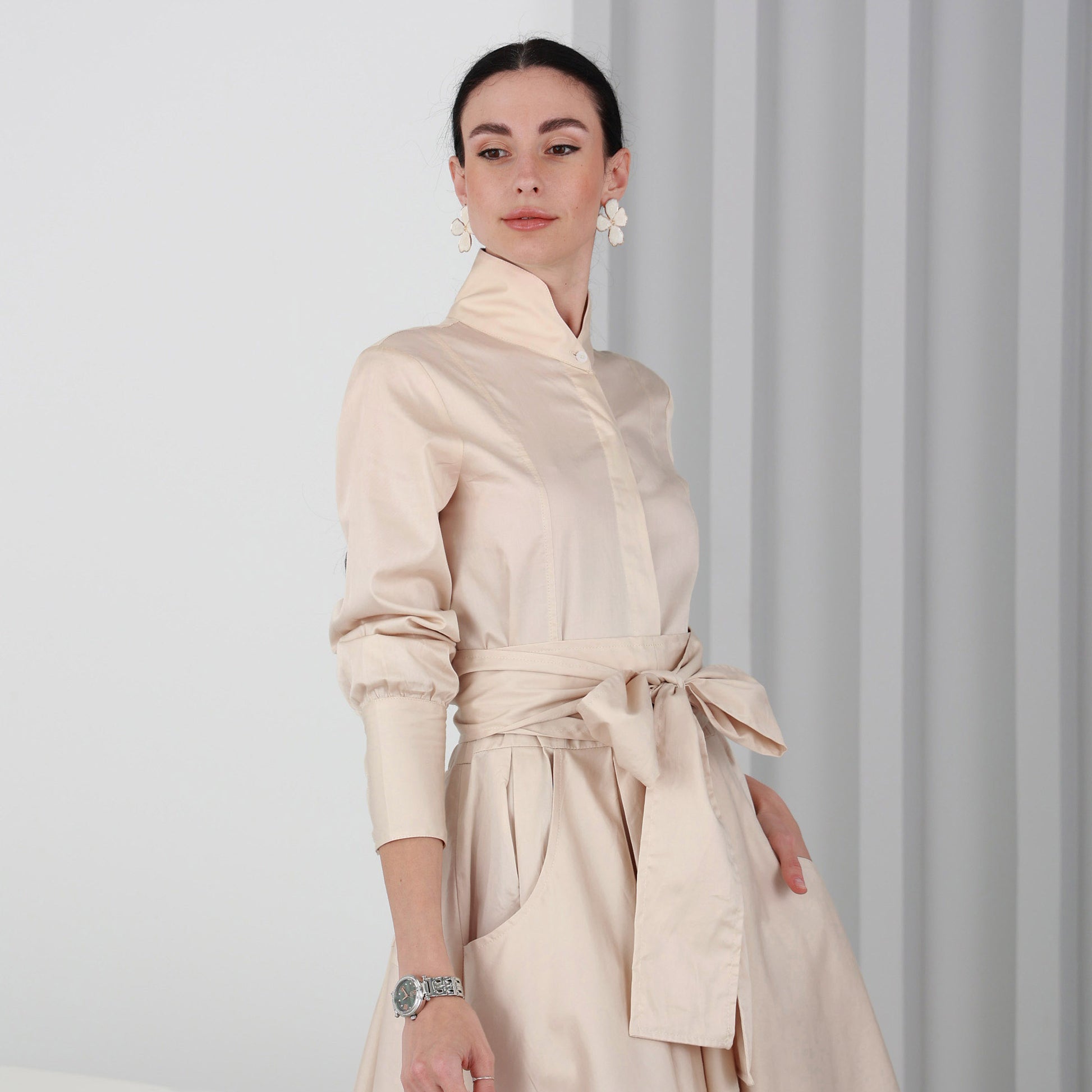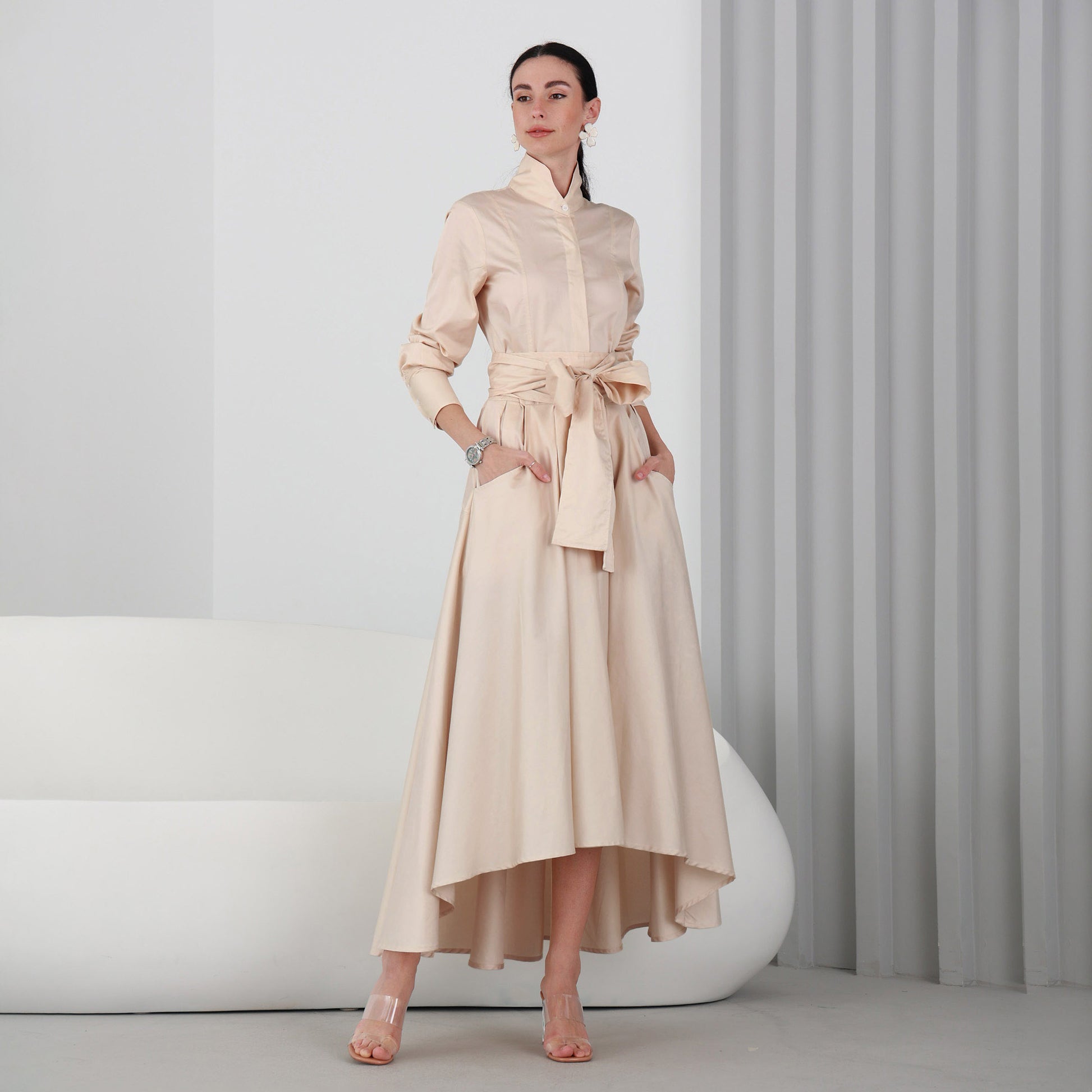 High neck with inside front buttons and extra flow skirt. Back longer than front. Long sleeves with 3 buttons on the wide collar, 2 pockets on the sides and it comes with long belt.
