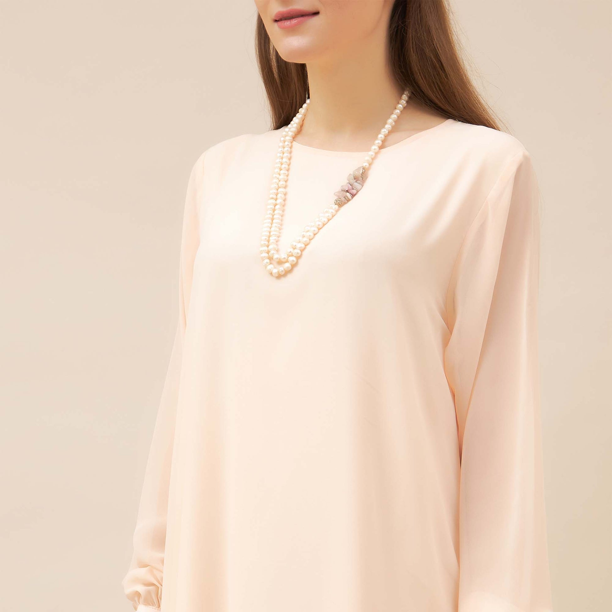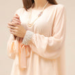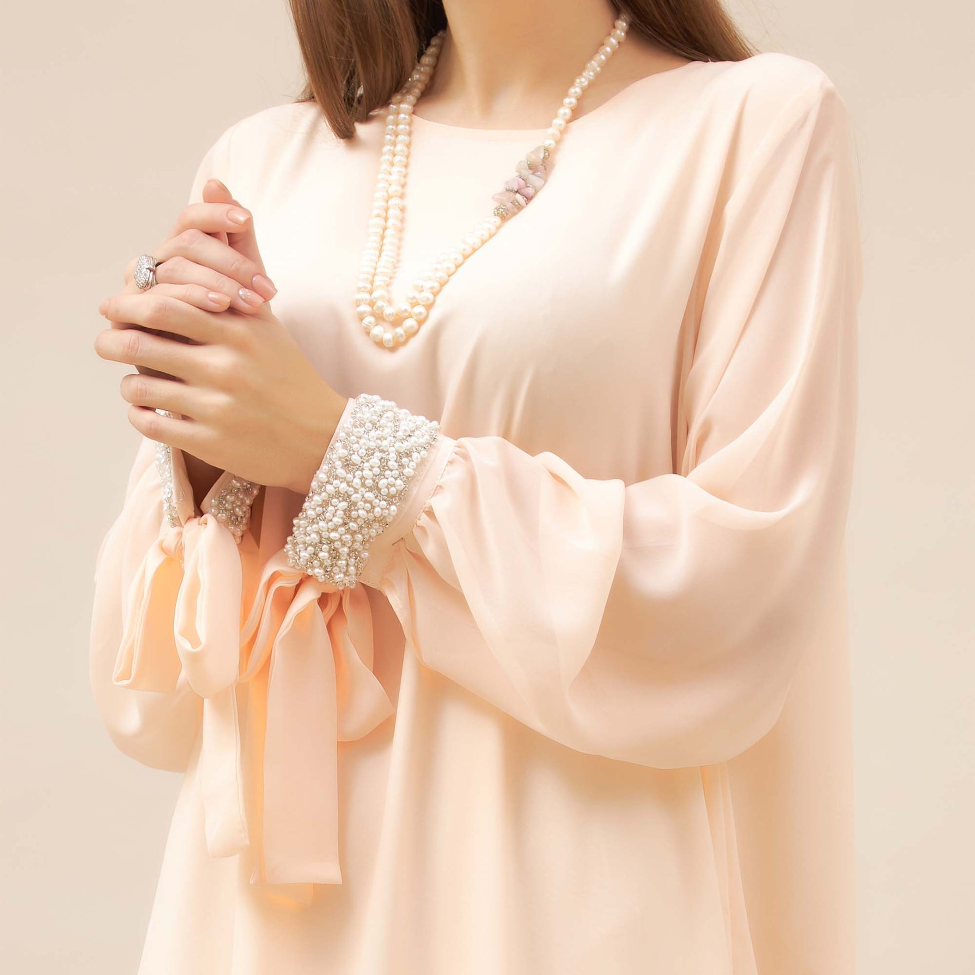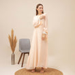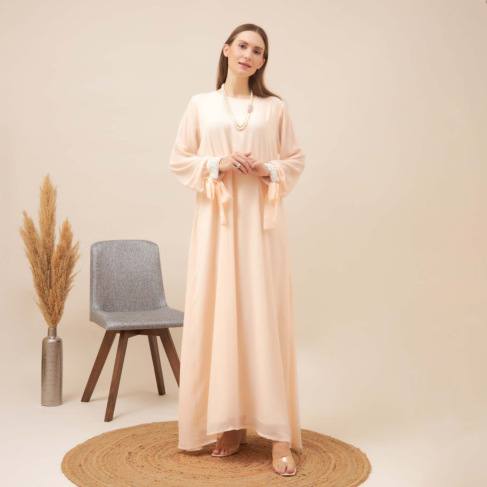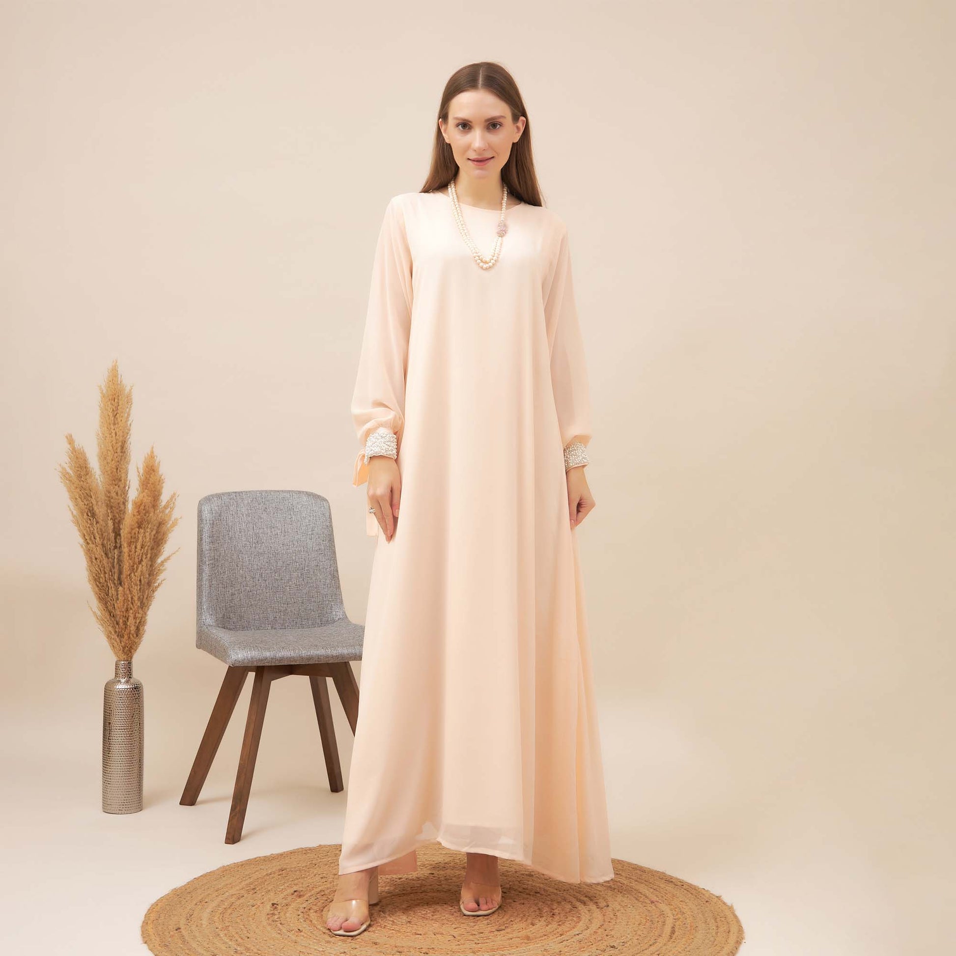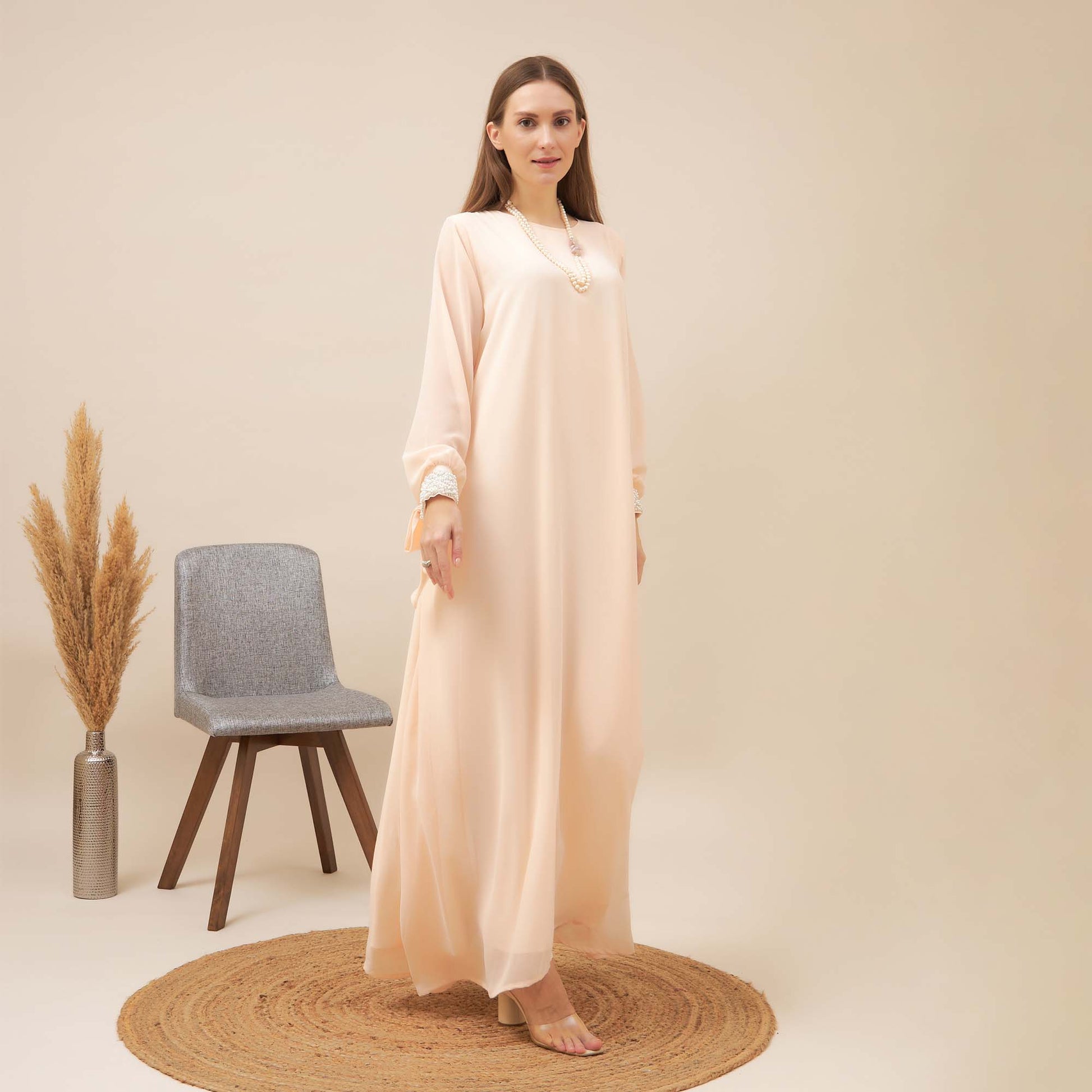 Layali dress is a Luxurious long chiffon dress, with long decorated sleeves and a tie on the wrist.