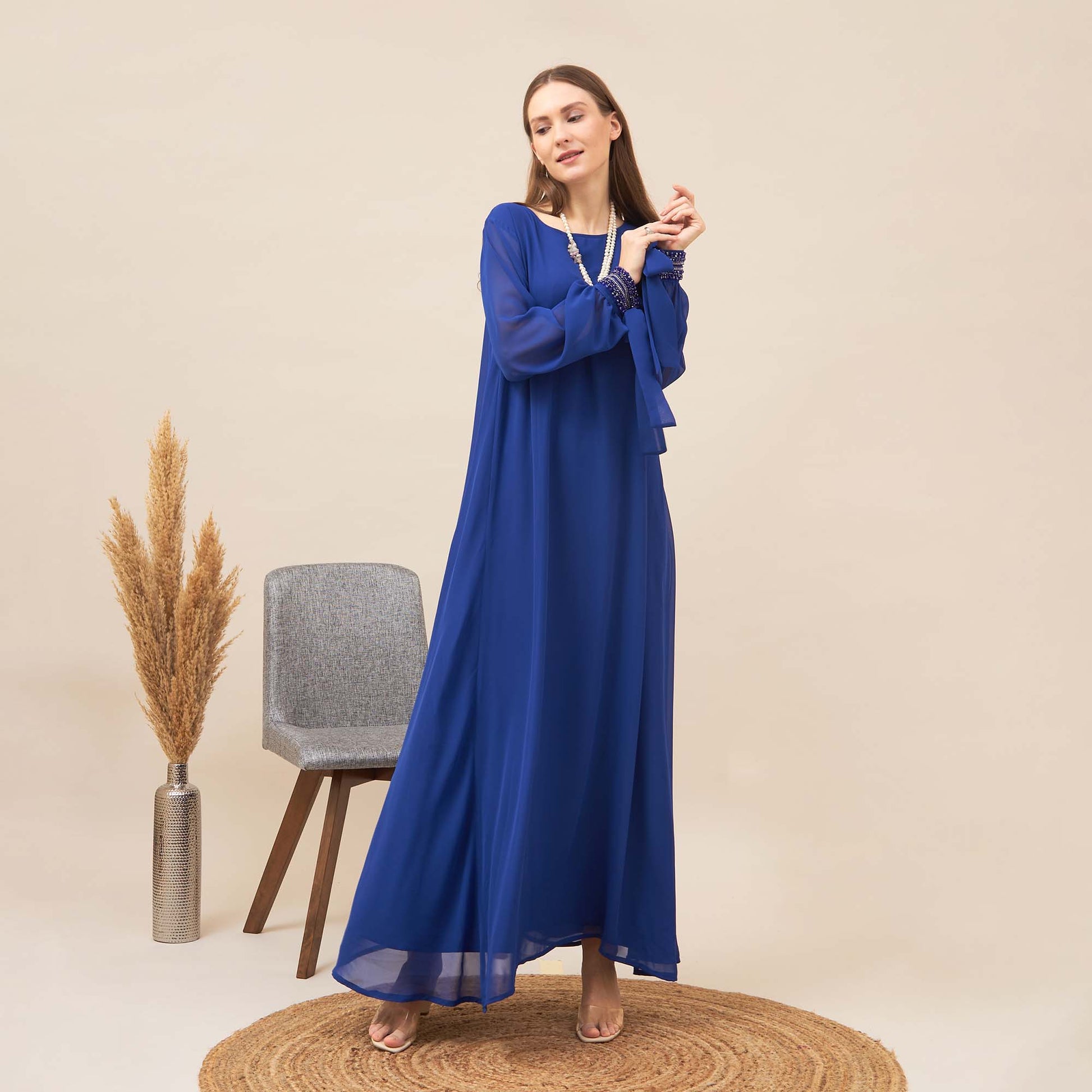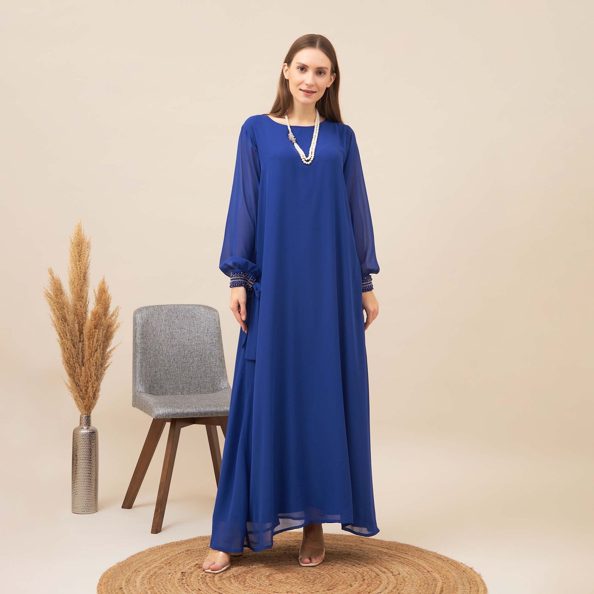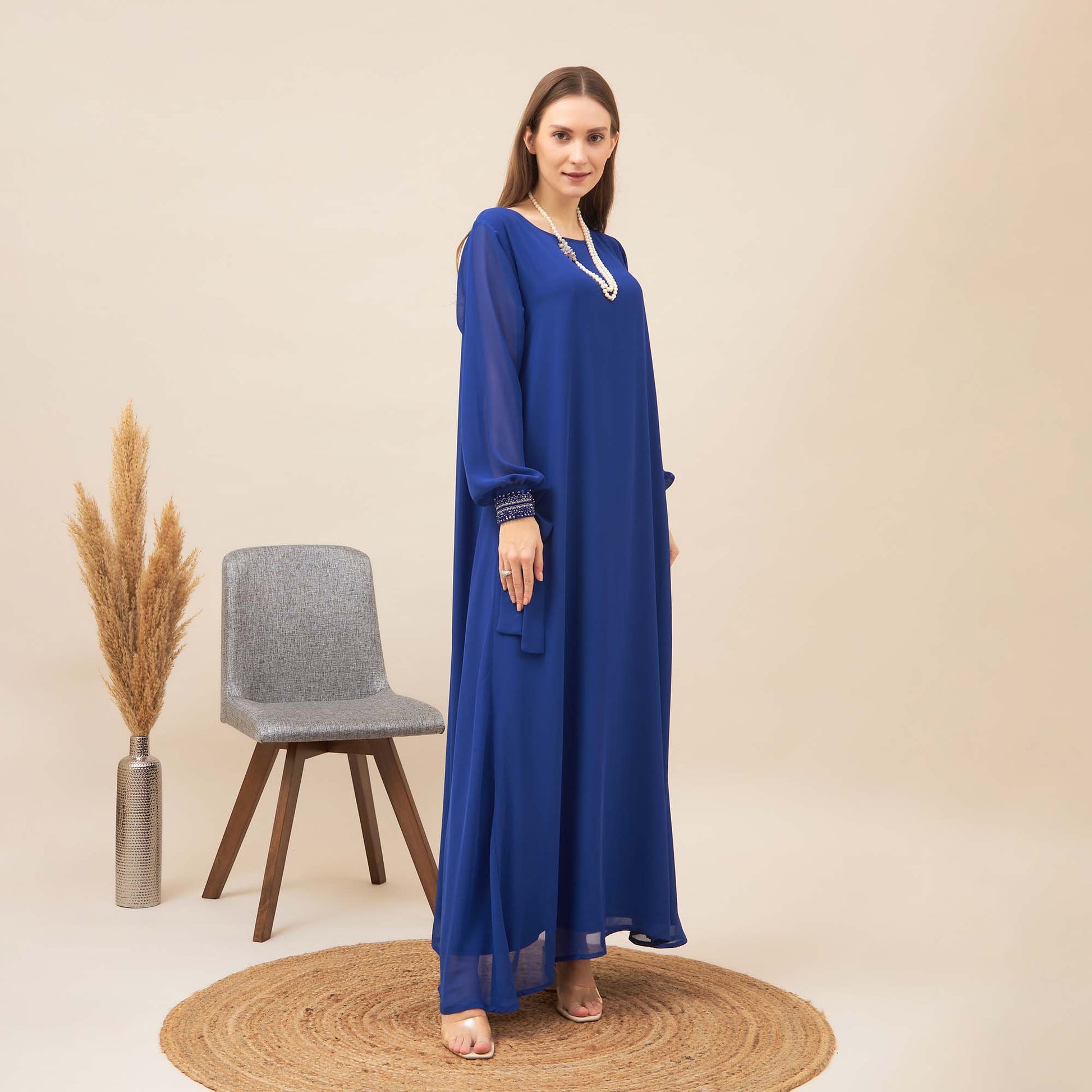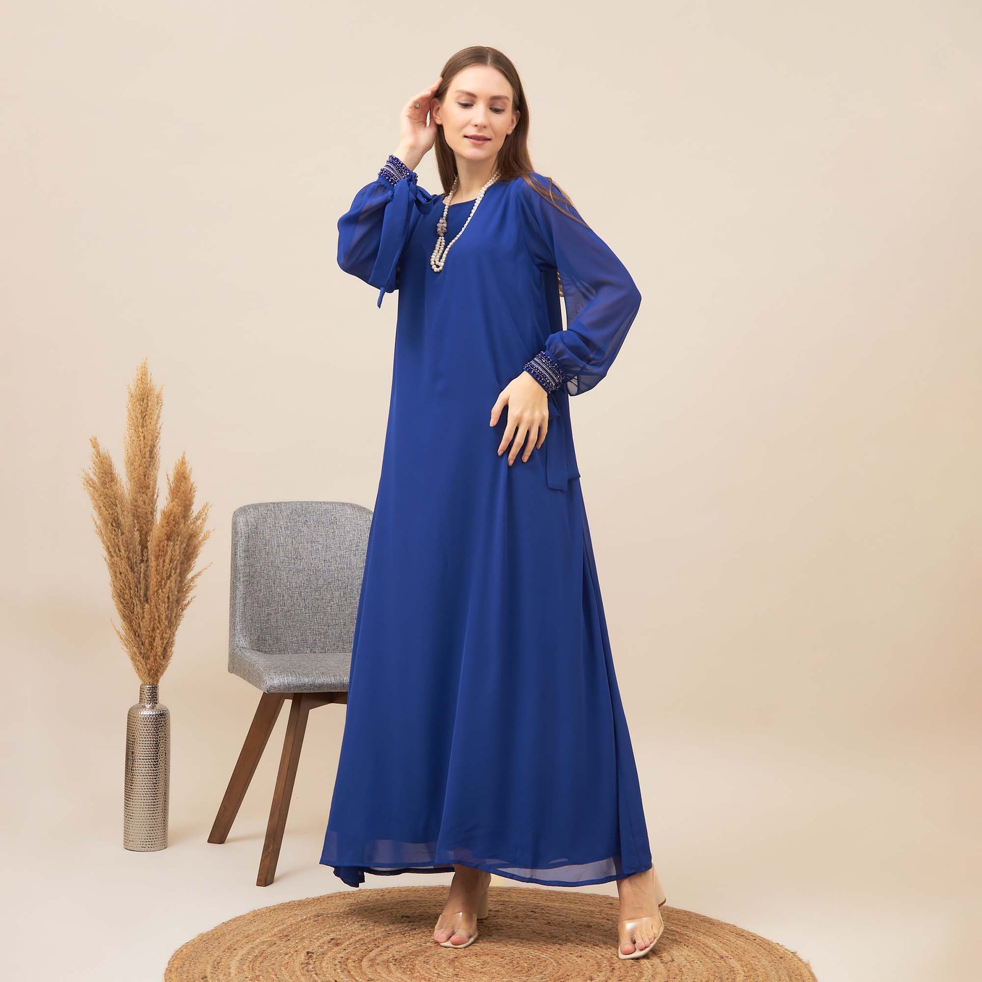 Layali dress is a Luxurious long chiffon dress, with long decorated sleeves and a tie on the wrist.