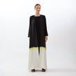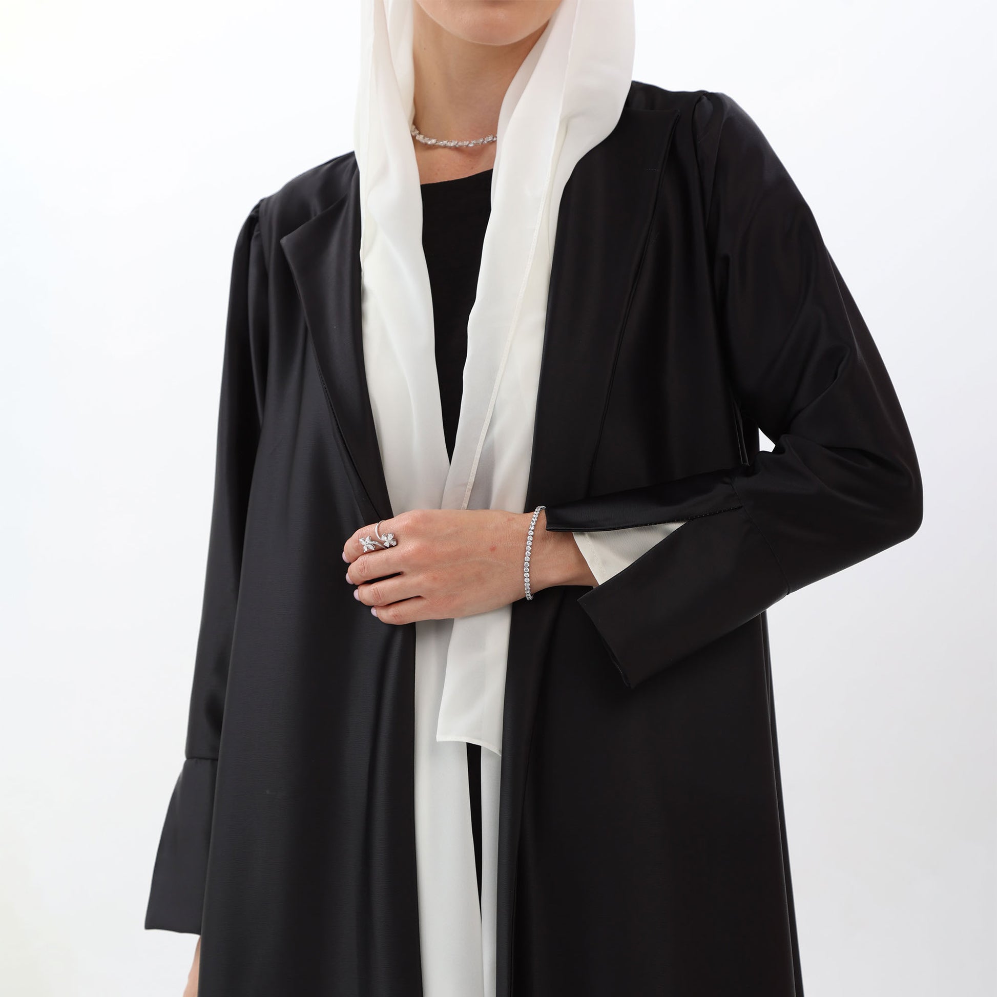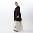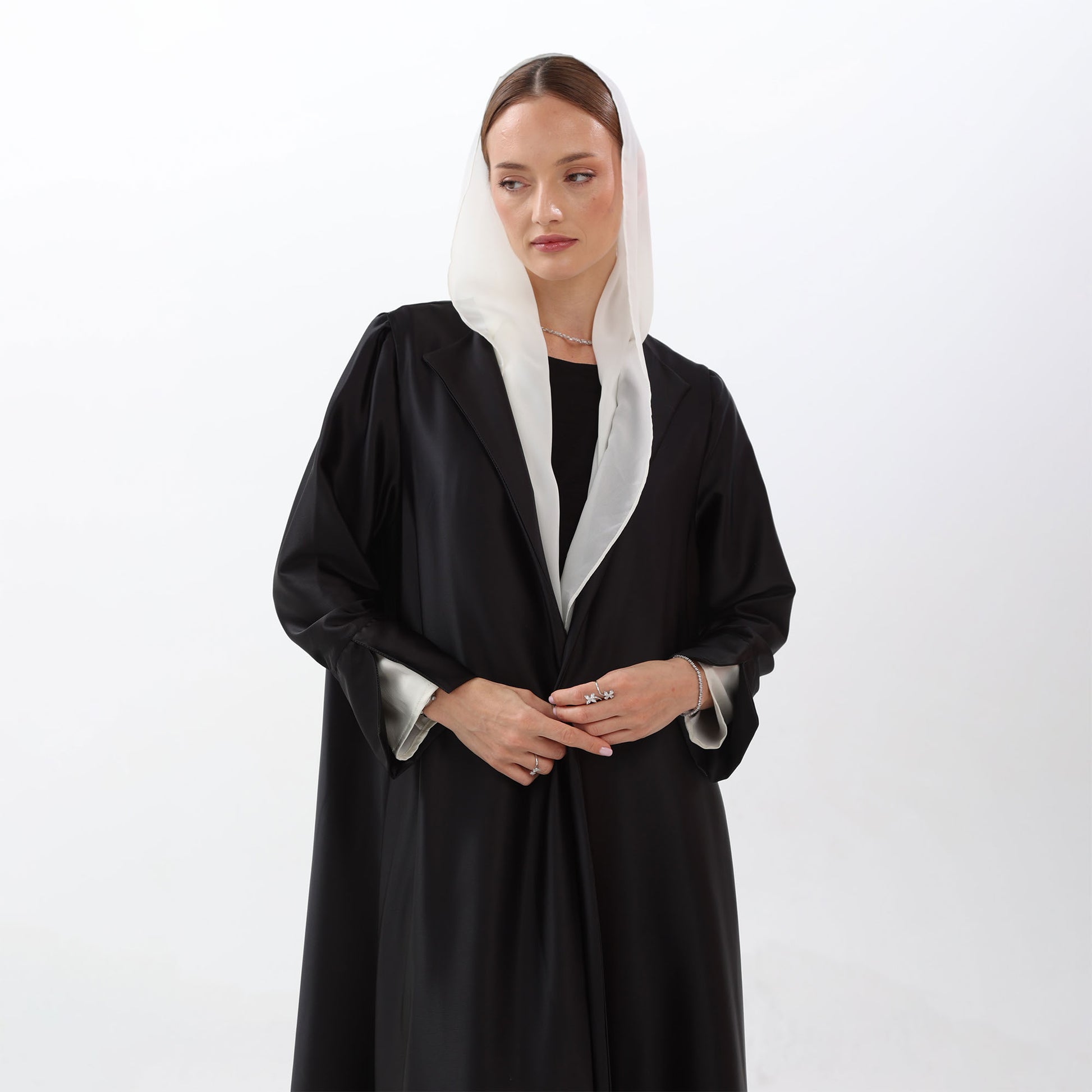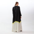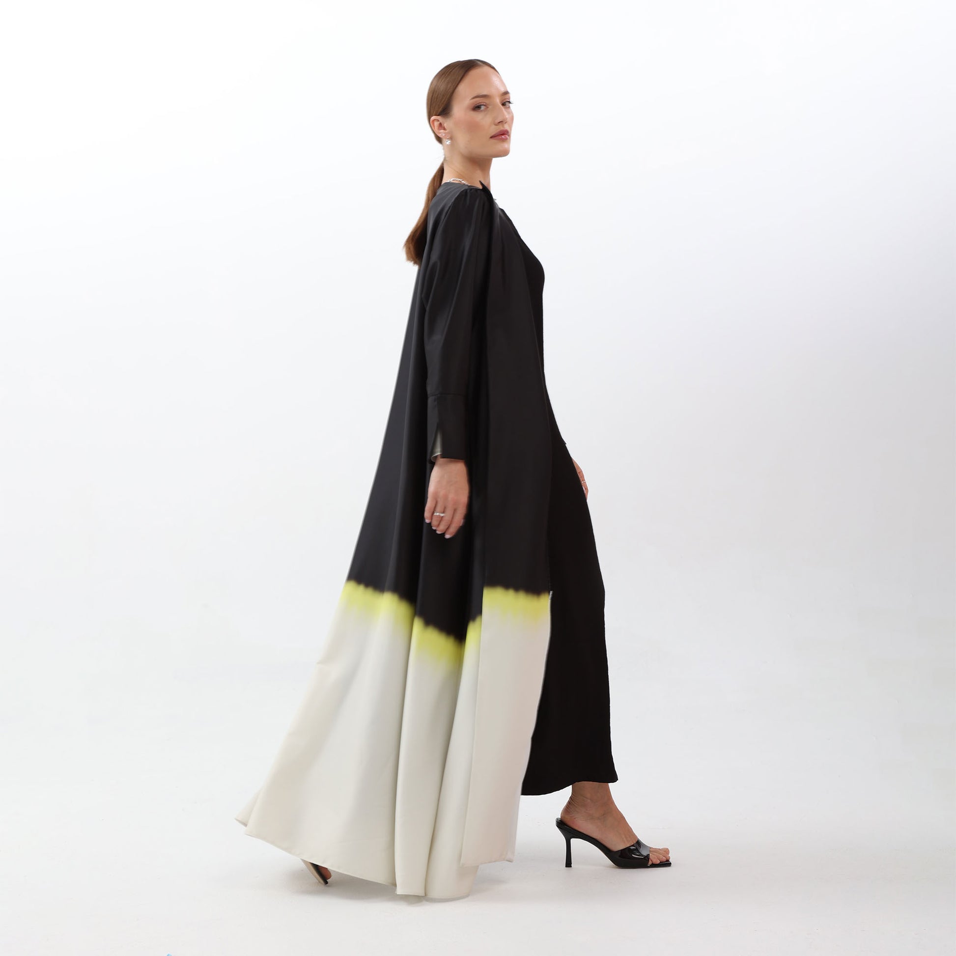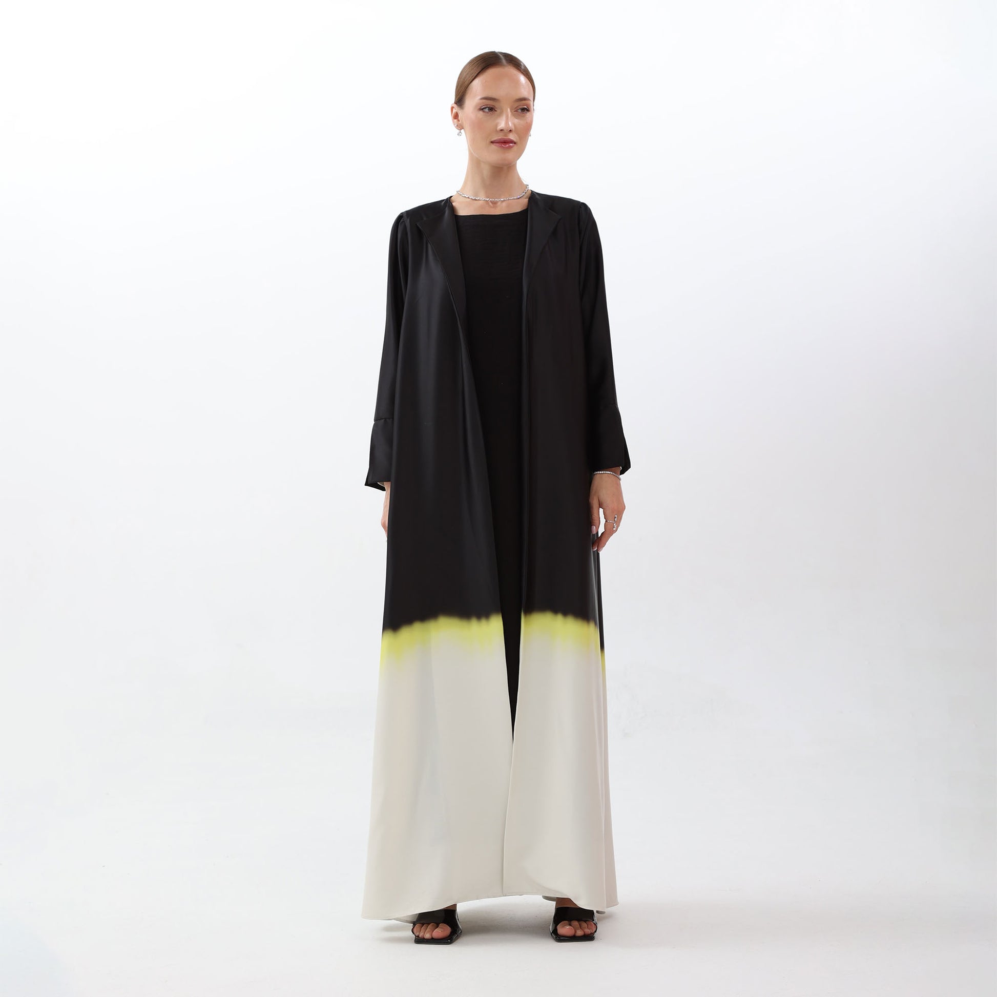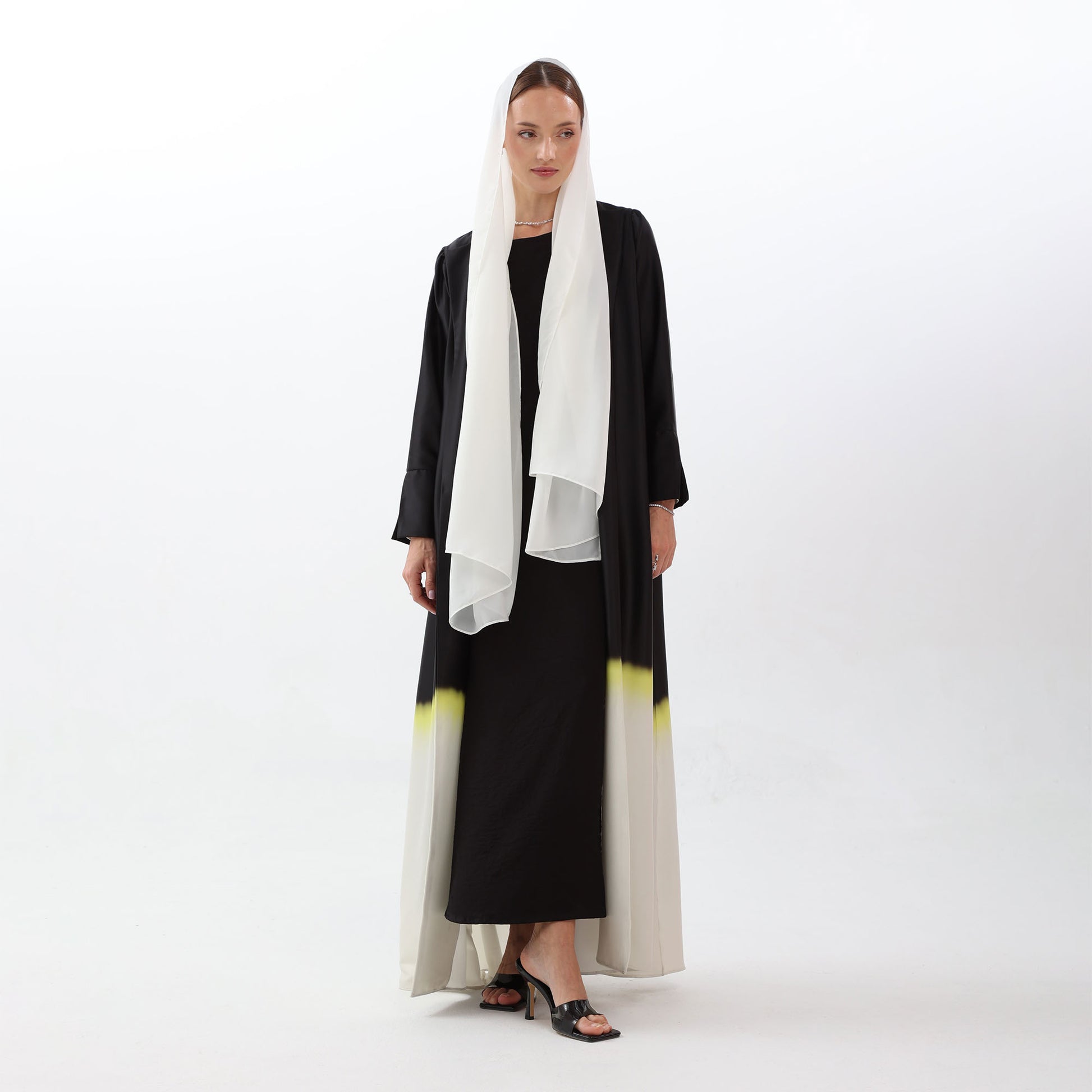 Embrace a touch of modern elegance with this stunning abaya. This abaya features a sleek black upper that gracefully transitions to a soft white hem, accented with a subtle yellow hue for a unique twist. The high-quality, soft, and comfortable silk satin fabric ensures a luxurious feel, while the open-front design allows for effortless layering. Perfect for both formal occasions and casual outings, this abaya offers a versatile and stylish addition to your wardrobe.