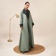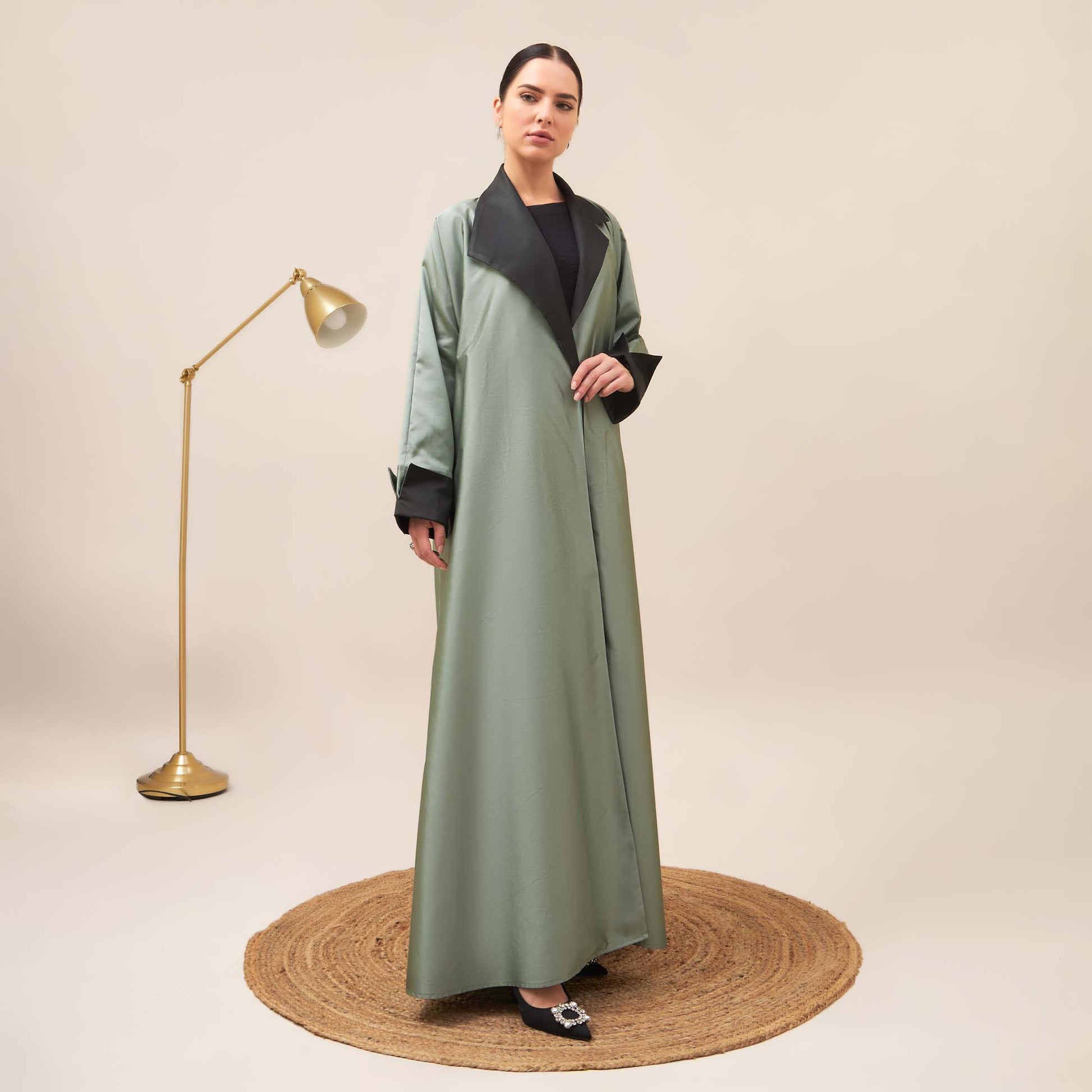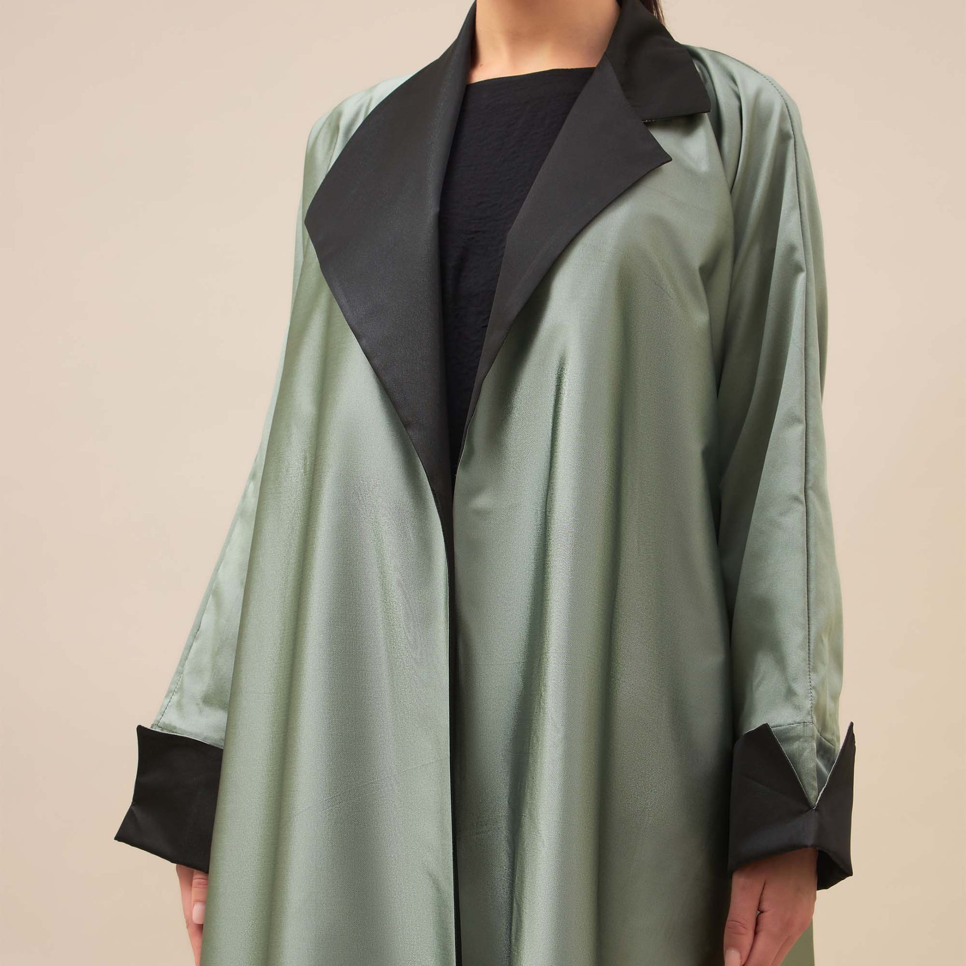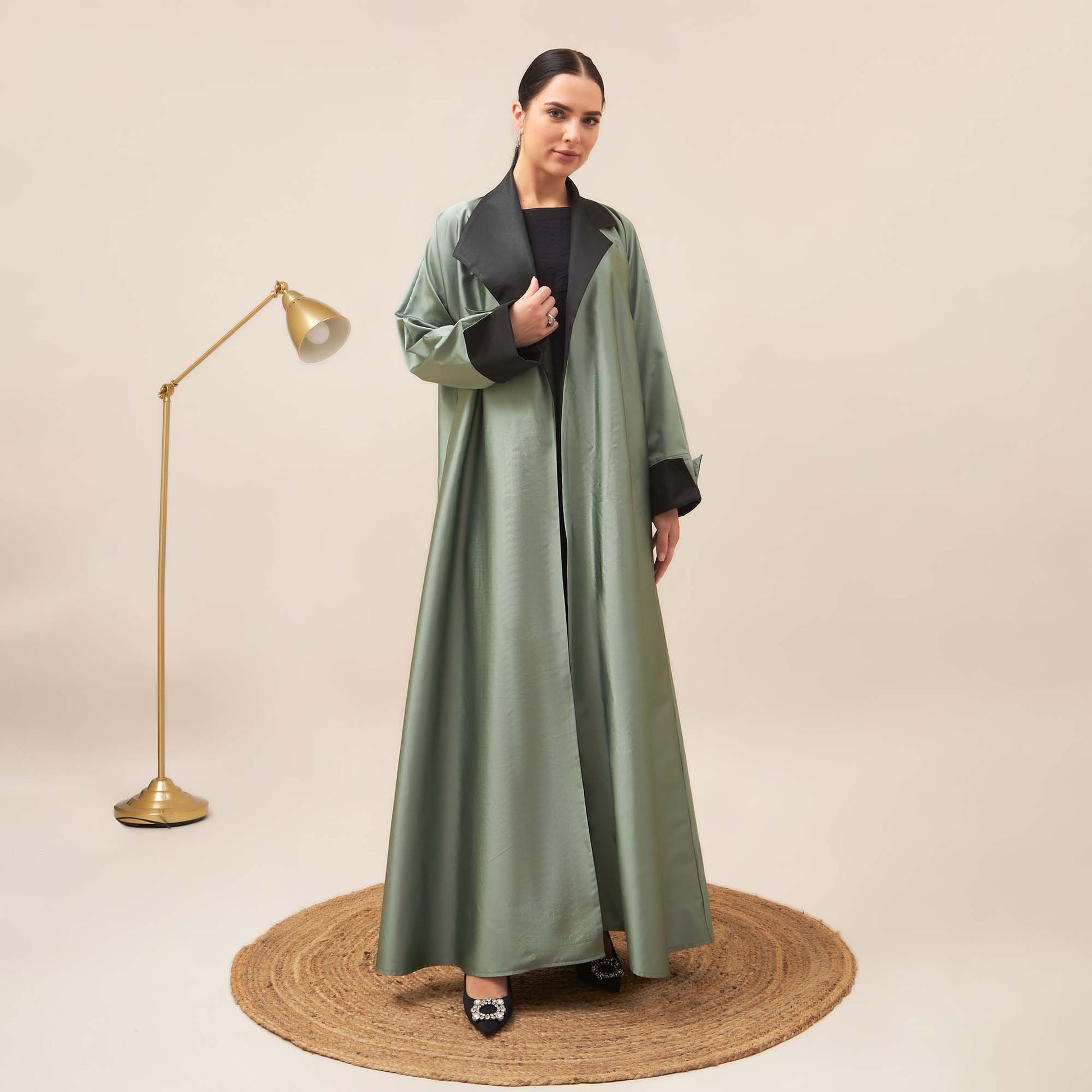 This exquisite piece combines the traditional abaya silhouette with a contemporary coat-style design, with two shades of color, offering a perfect blend of modesty and modernity. The satin fabric provides a smooth, lustrous finish that catches the light beautifully, adding a touch of sophistication to any outfit. The tailored cut ensures a flattering fit, while the open-front design allows for versatile styling. Ideal for formal events or elevating everyday wear, this abaya is a statement of refined grace and timeless fashion.