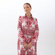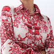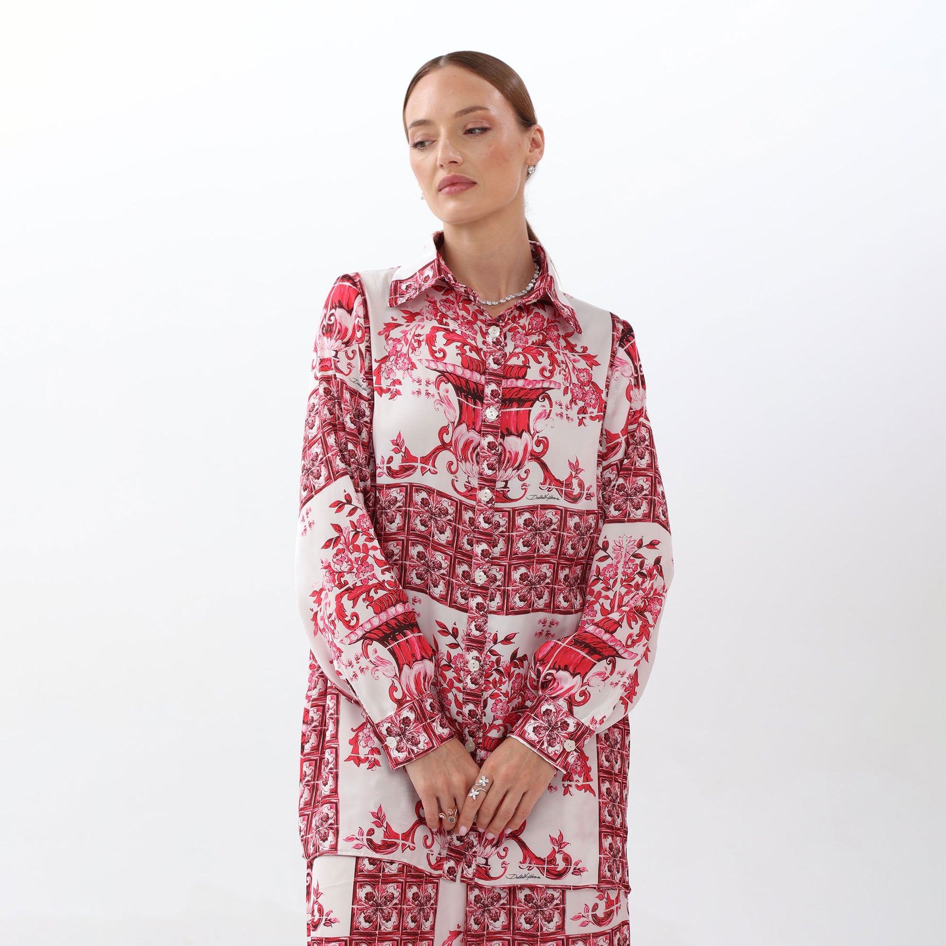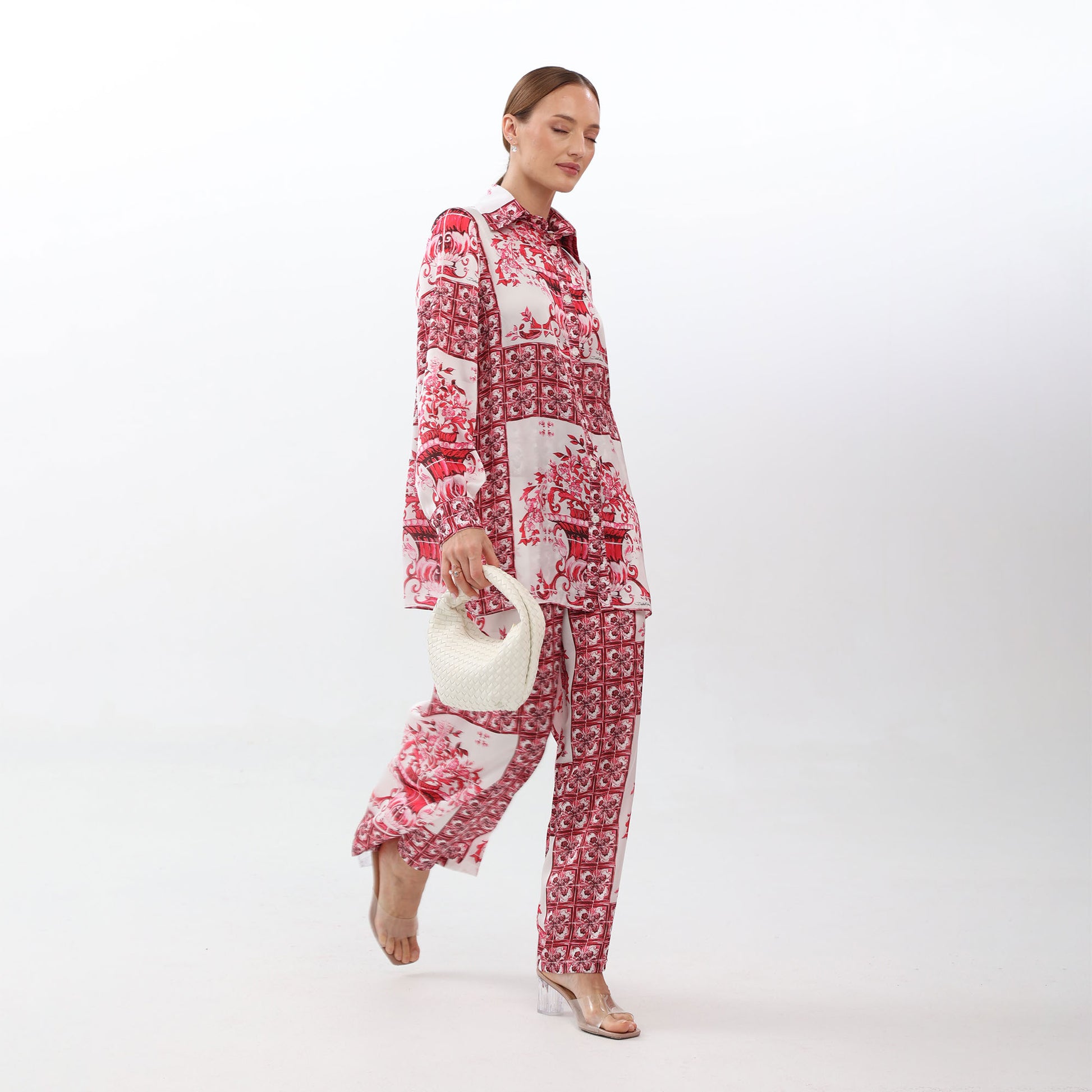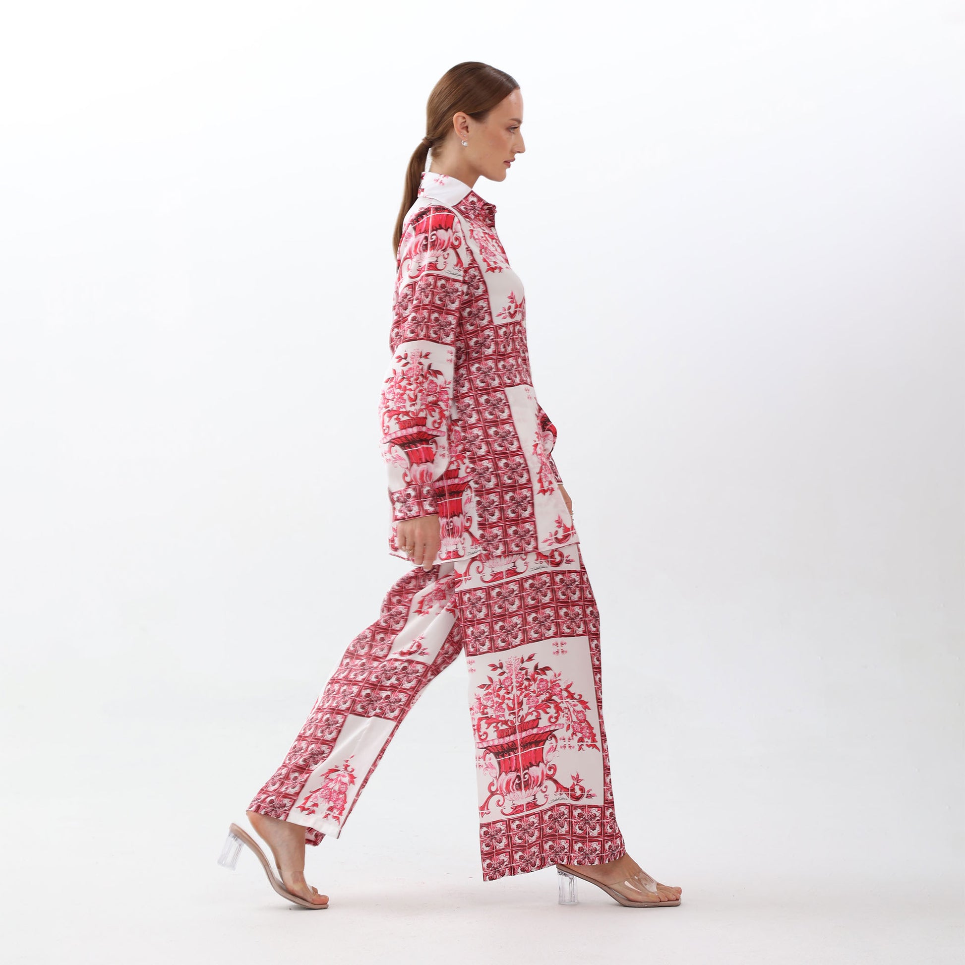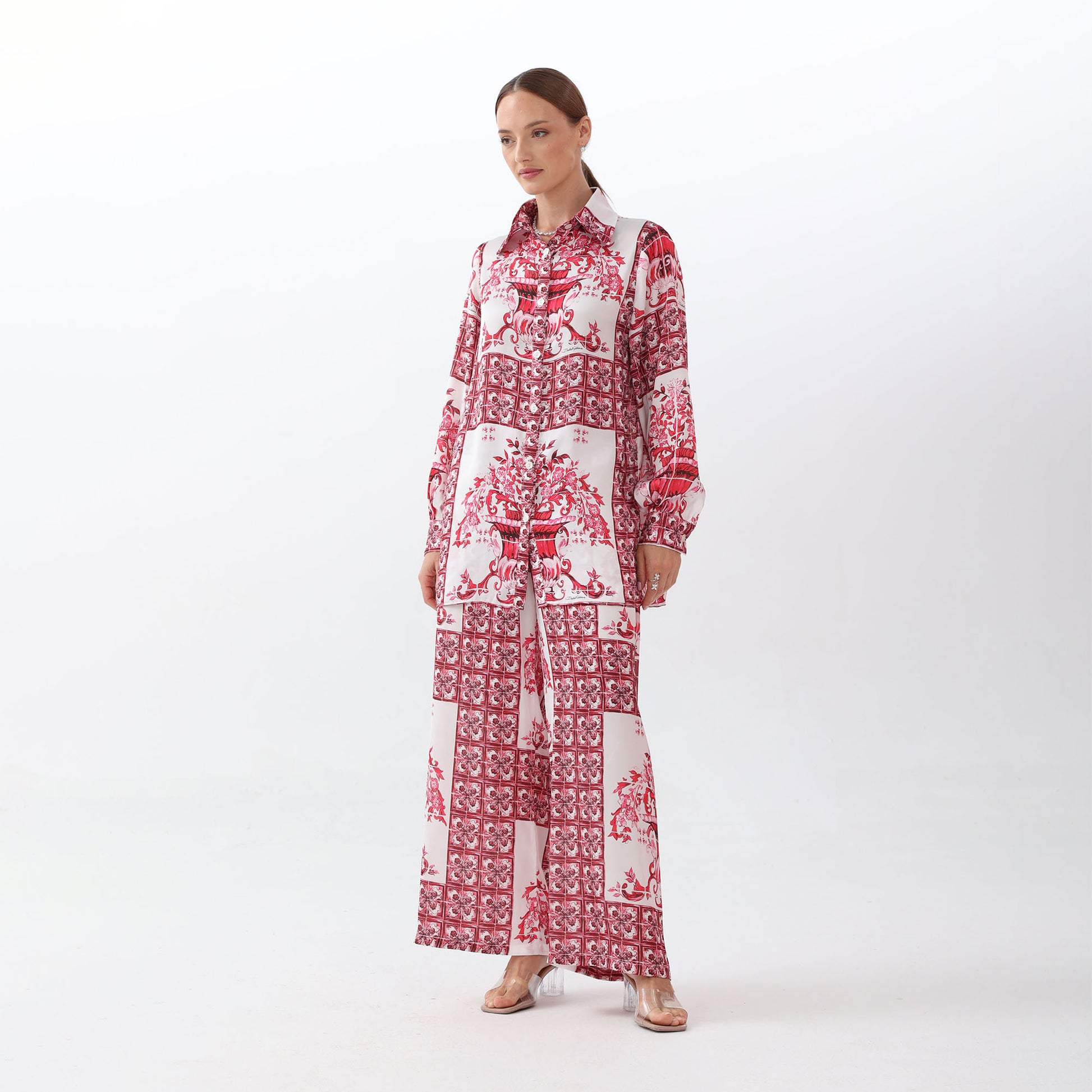 Enhance your wardrobe with this elegant and comfortable two-piece set, perfect for any occasion .This stylish ensemble showcases a striking blue and white pattern inspired by Baroque fashion, exuding timeless sophistication and charm. Made from high-quality silk chiffon fabric, it provides exceptional comfort and freedom of movement. The set includes a long-sleeve button-down top and matching wide-leg pants, creating a seamless and chic look. this outfit effortlessly combines practicality with modern fashion.