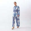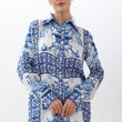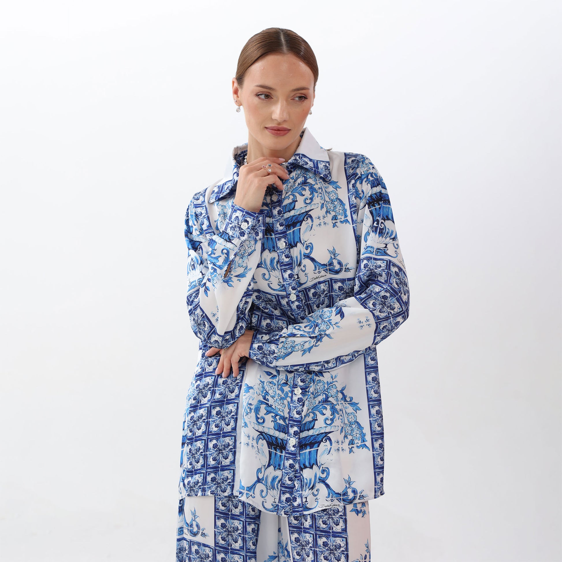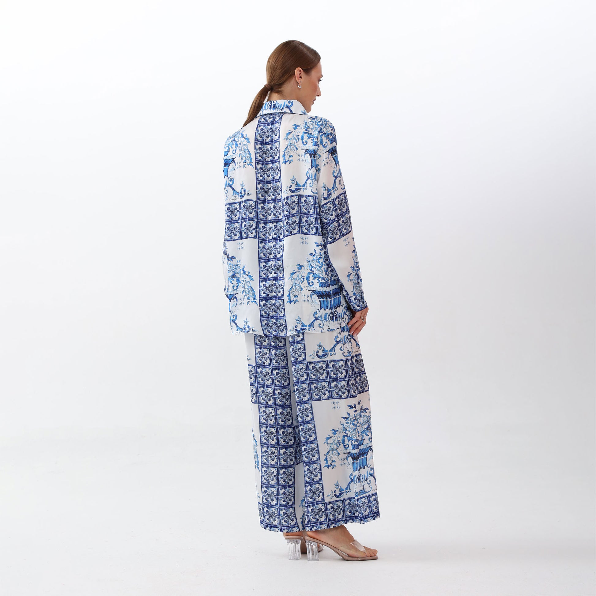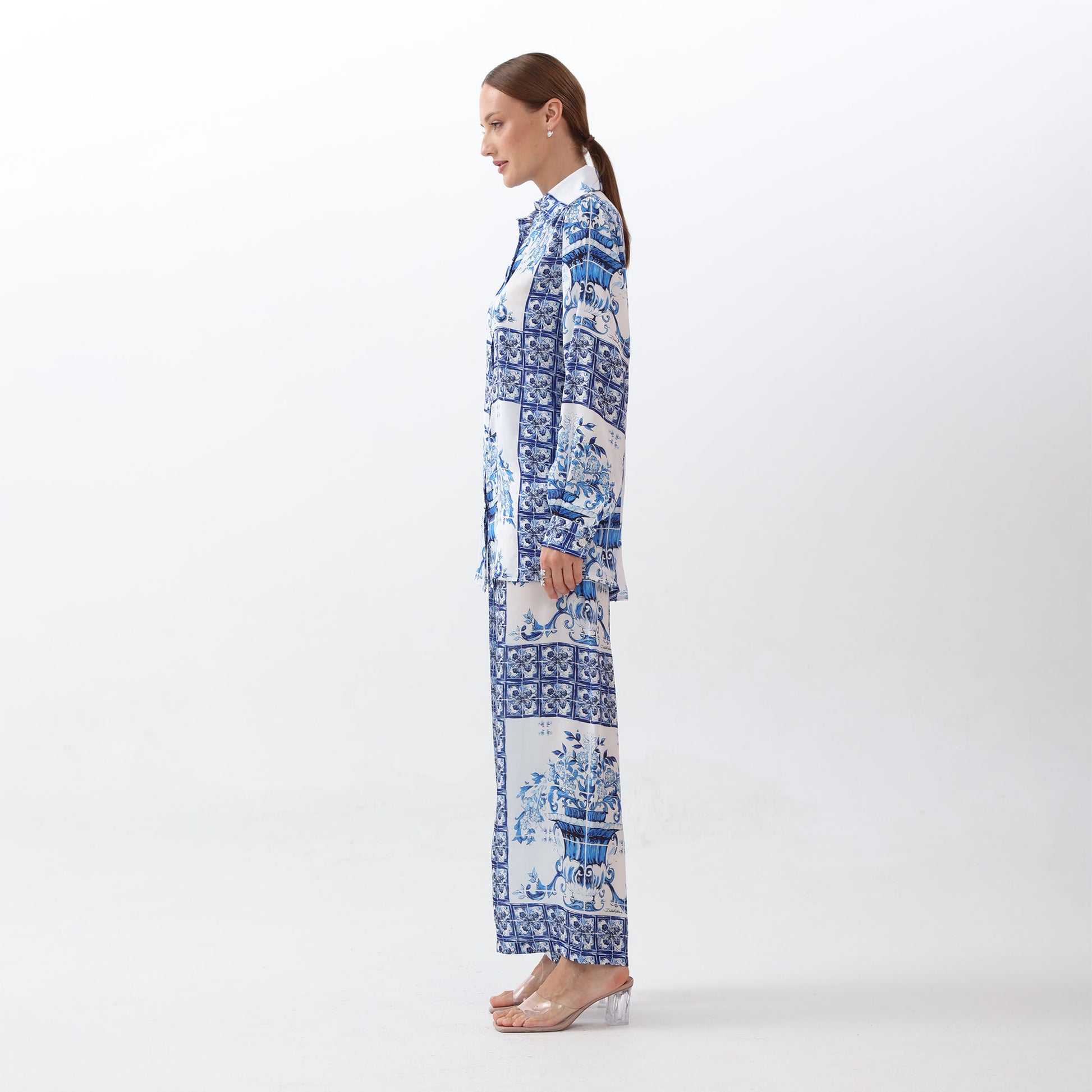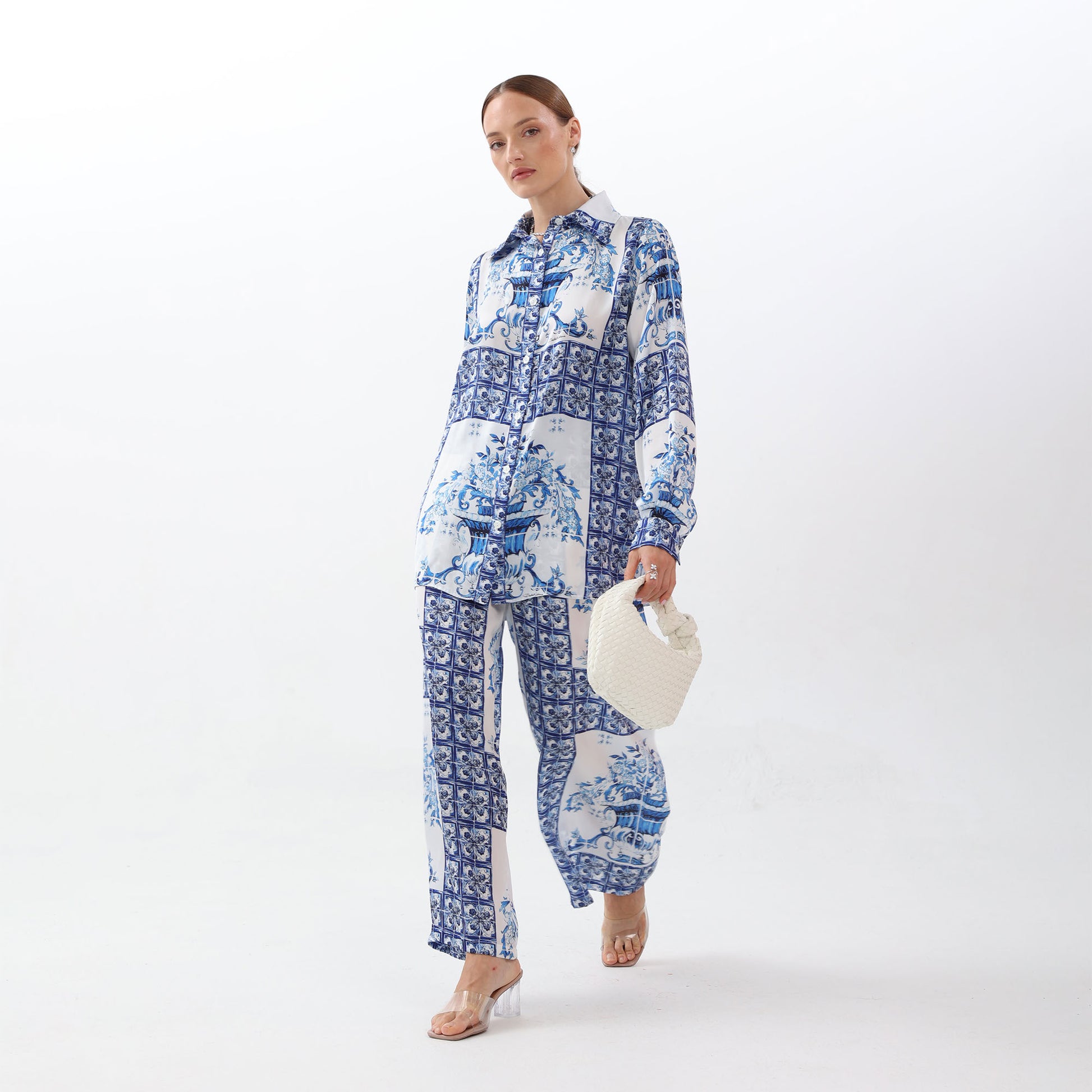 Enhance your wardrobe with this elegant and comfortable two-piece set, perfect for any occasion .This stylish ensemble showcases a striking blue and white pattern inspired by Baroque fashion, exuding timeless sophistication and charm. Made from high-quality silk chiffon fabric, it provides exceptional comfort and freedom of movement. The set includes a long-sleeve button-down top and matching wide-leg pants, creating a seamless and chic look. this outfit effortlessly combines practicality with modern fashion.