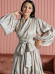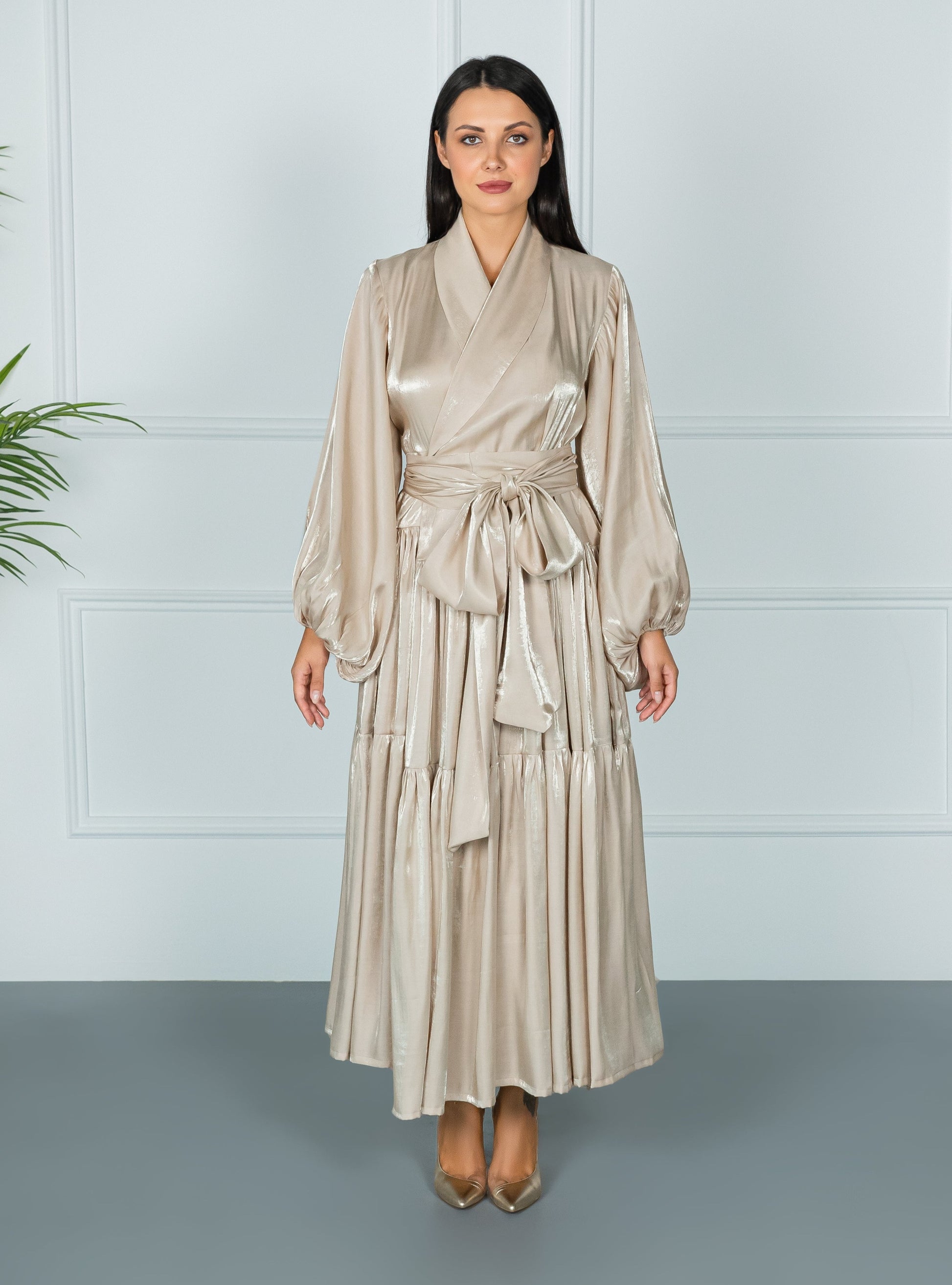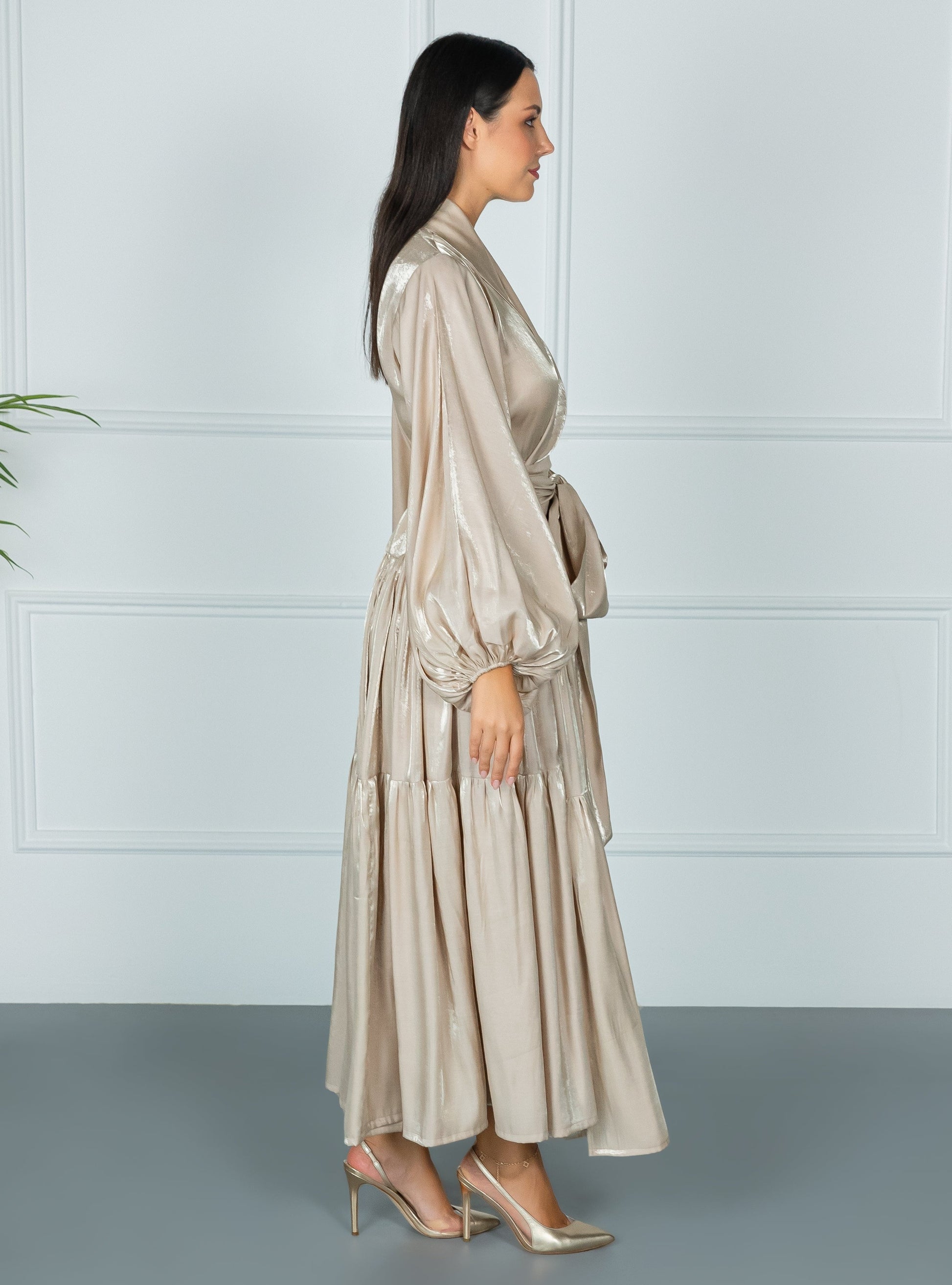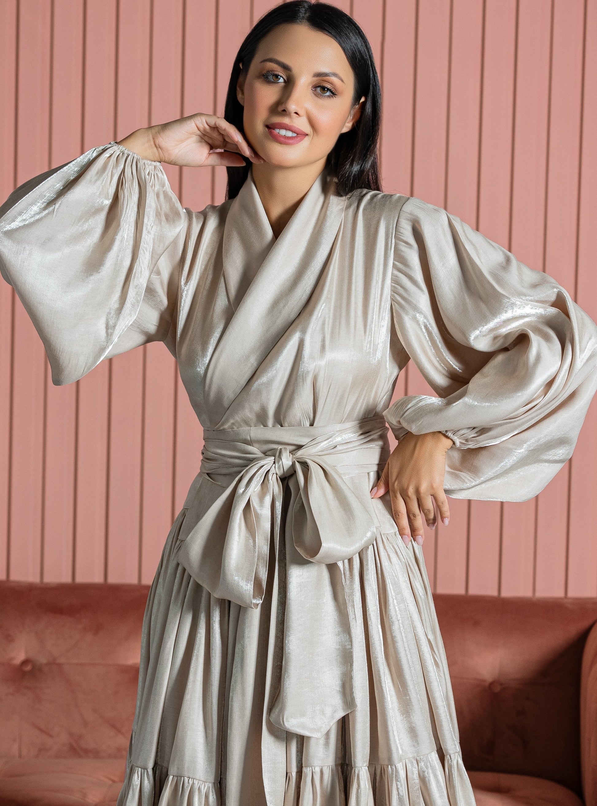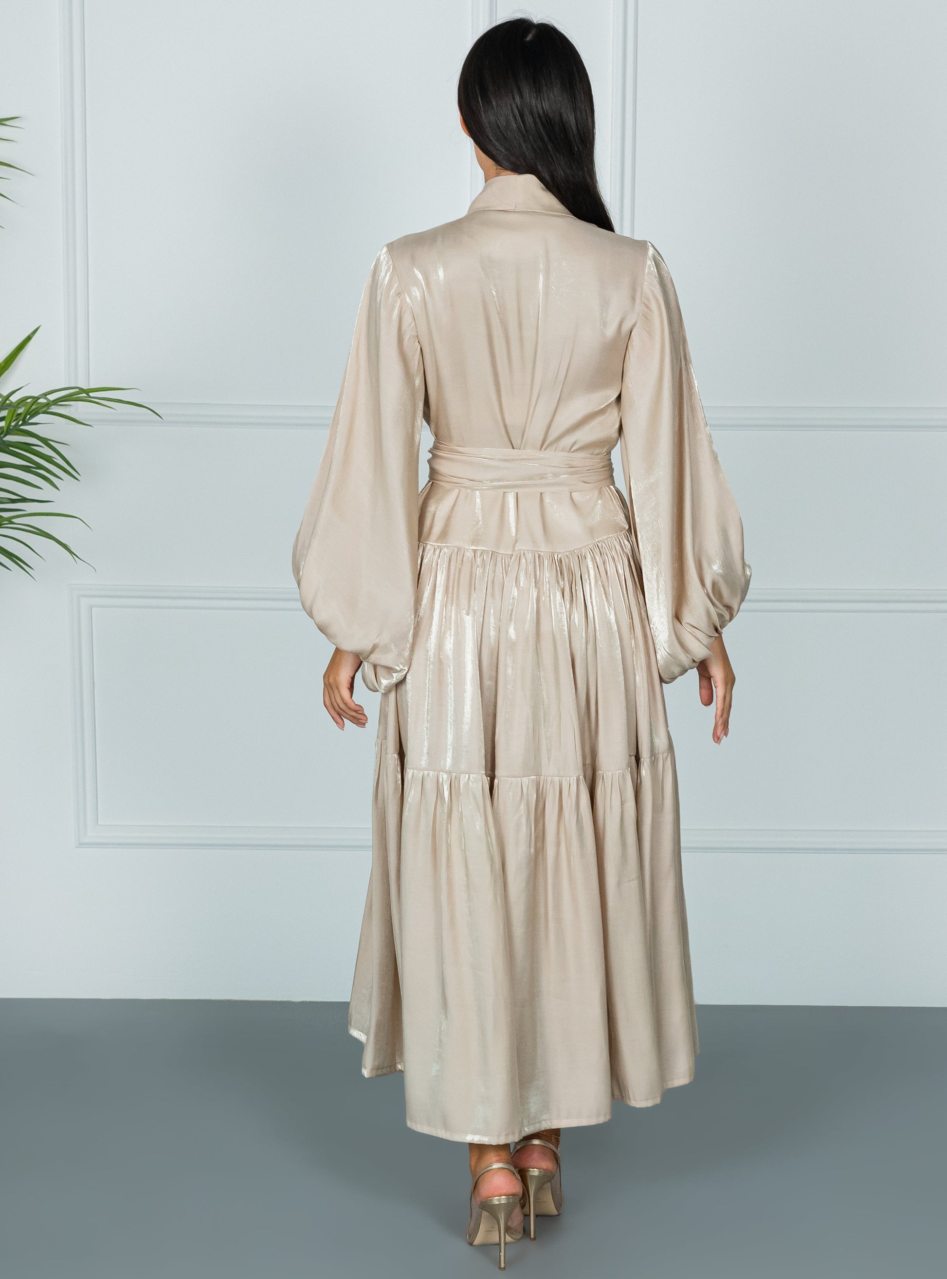 Make a spectacular entrance at the next important event when you wear FLORENCE DRESS. Showcasing the label's couture craftsmanship, its faux wrap bodice is styled with Belt and Long Buffy sleeves, and set above a tiered Rotana skirt. Complement this exquisitely feminine design with a gold clutch bag .