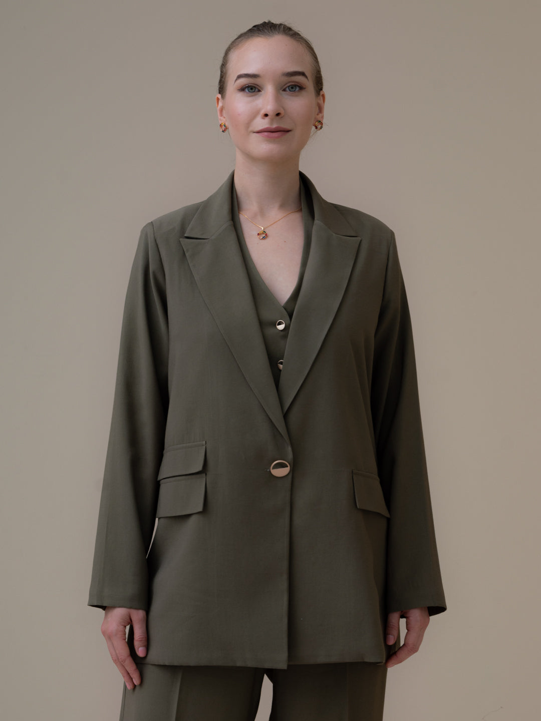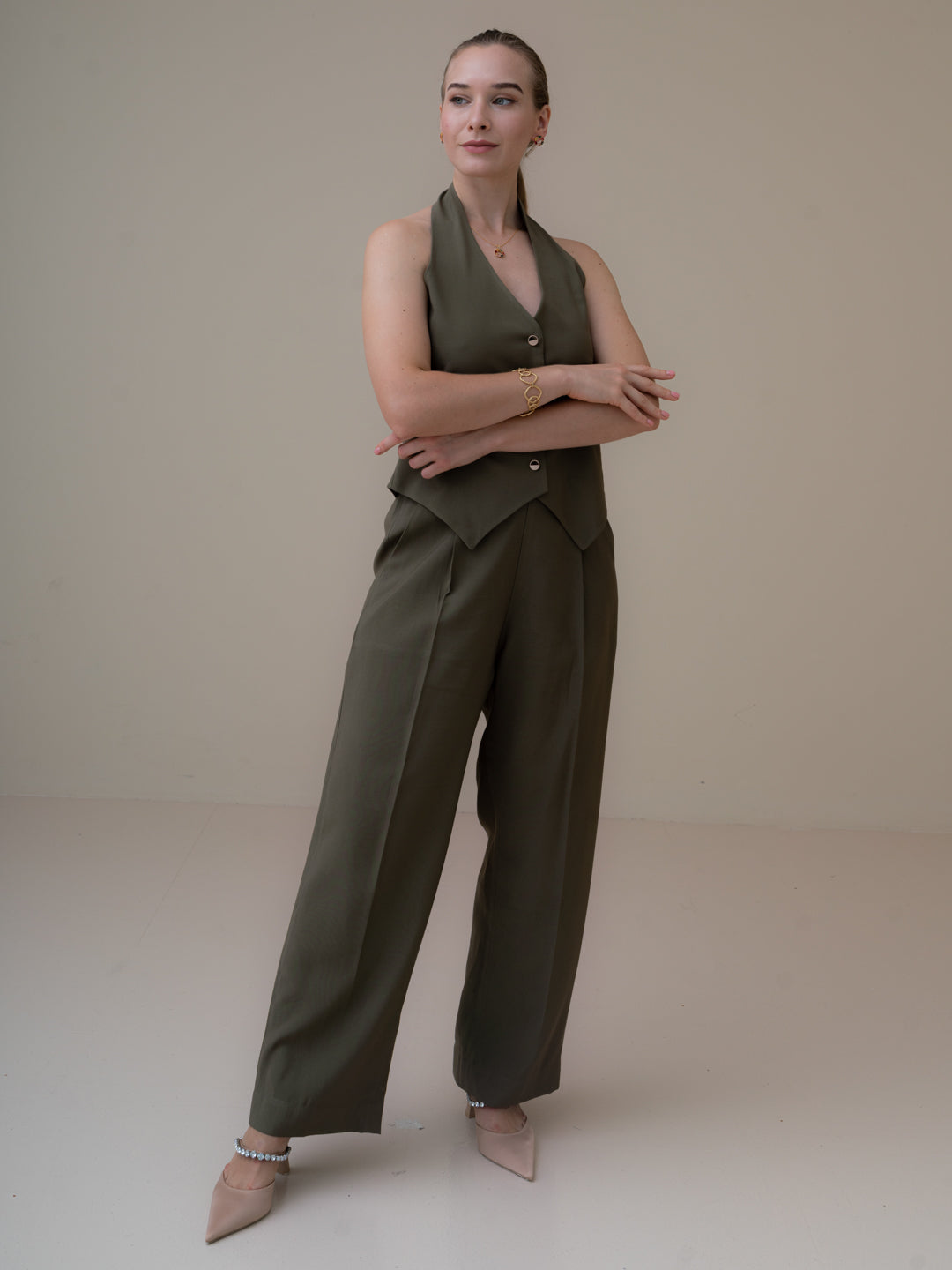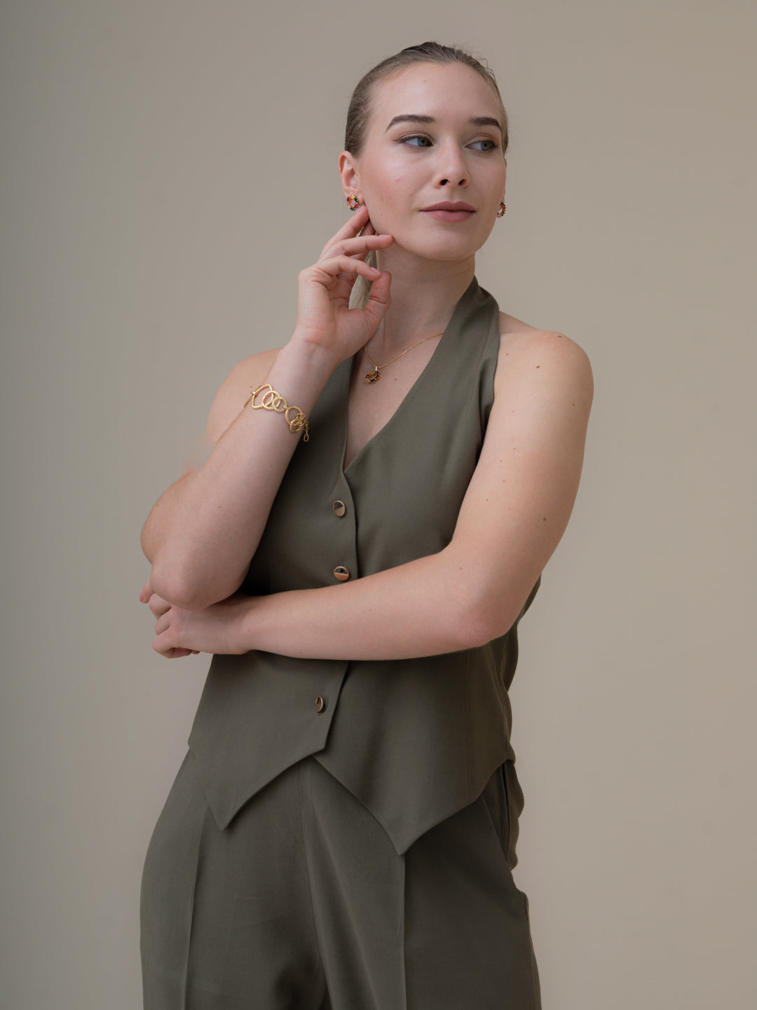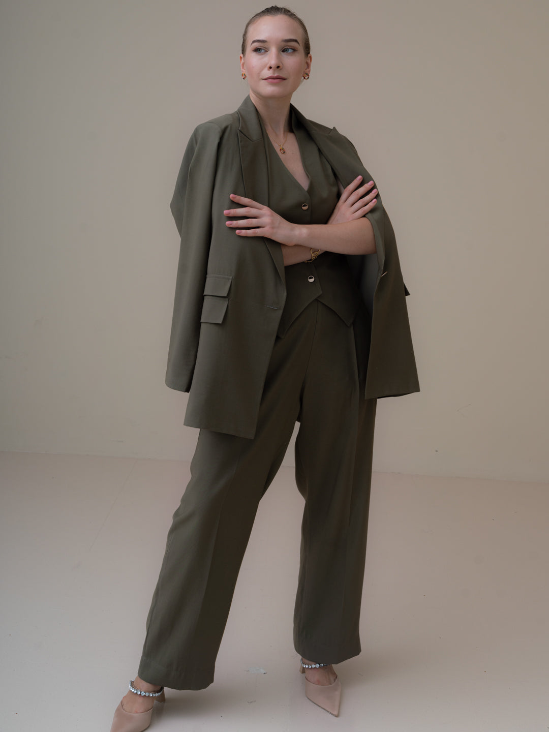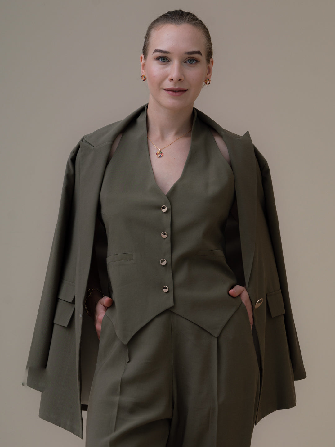 Creative, feminine and bold business suite made of three pieces. Tailored from Japanese Tencel fabrics for comfort and durability. Inspired by successful business women.