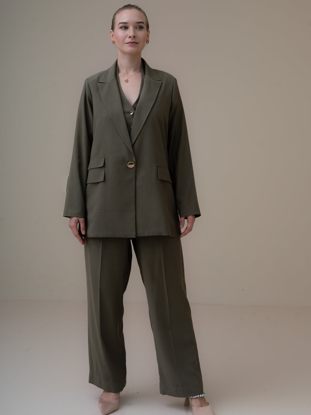 اطلالة ذكية وحازمة وملؤها الانوثة مع هذه البدلة المكونة من 3 قطع المصنوعه بعناية من قماش التنسل الياباني الفاخر, نقدمها لك لنكون شركائك في النجاح