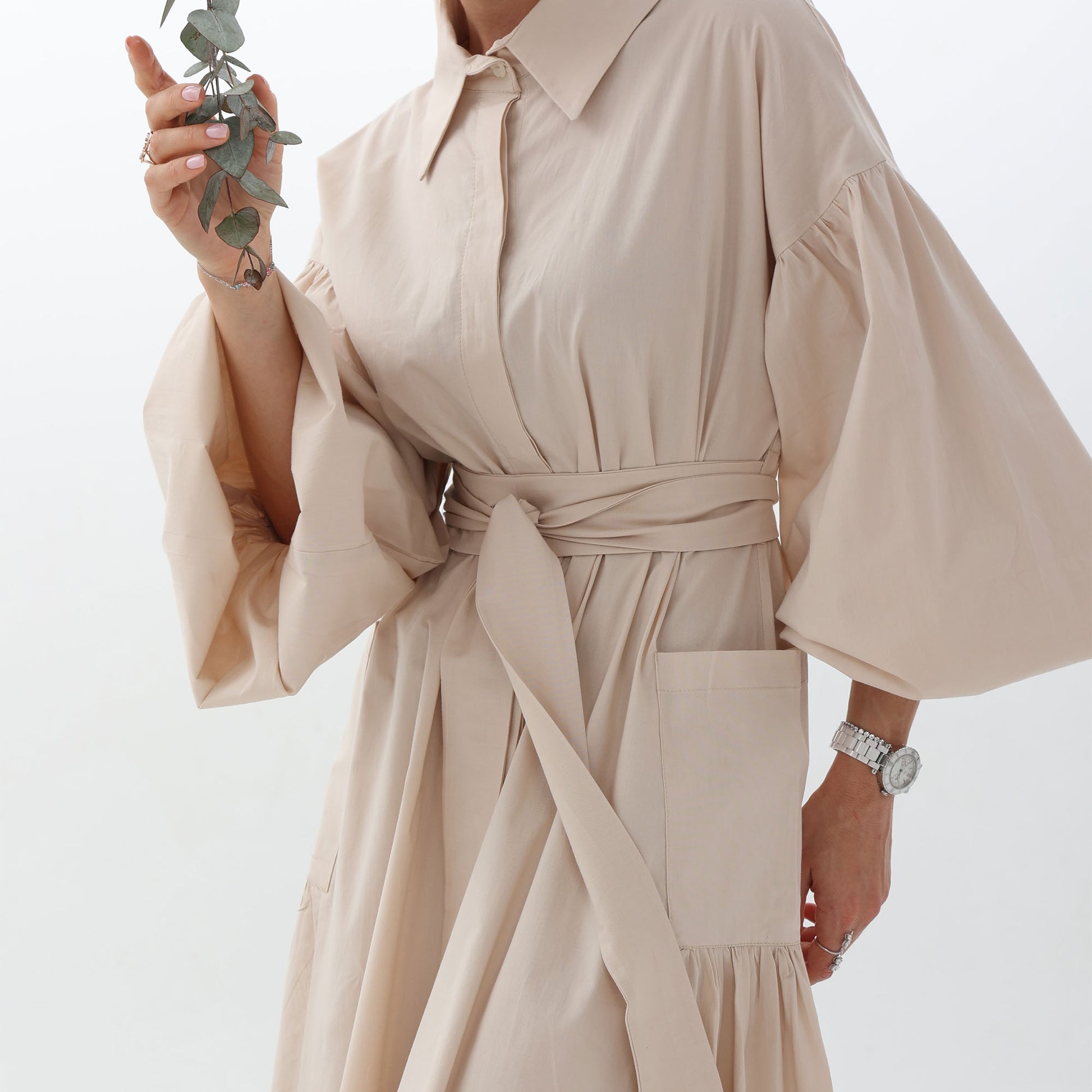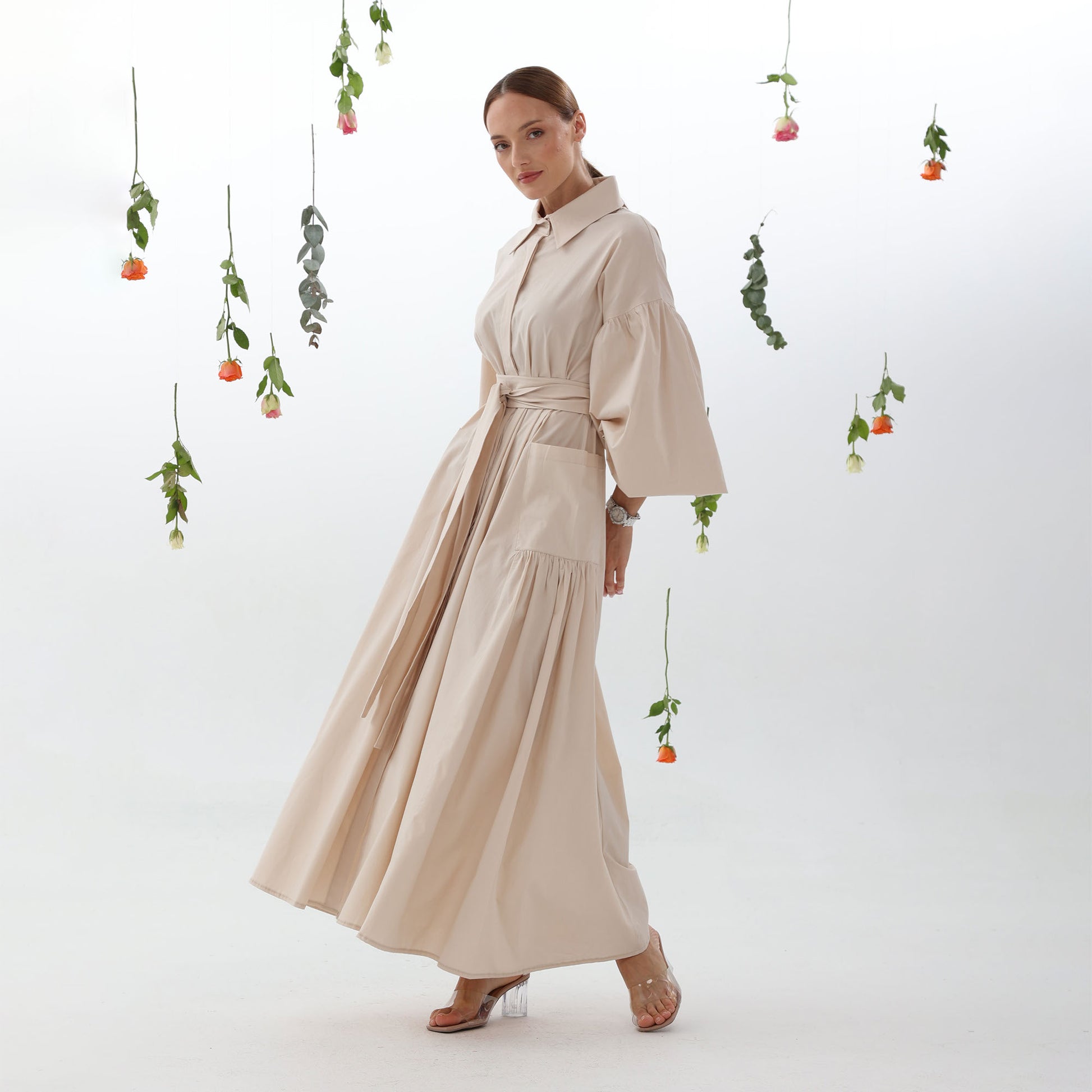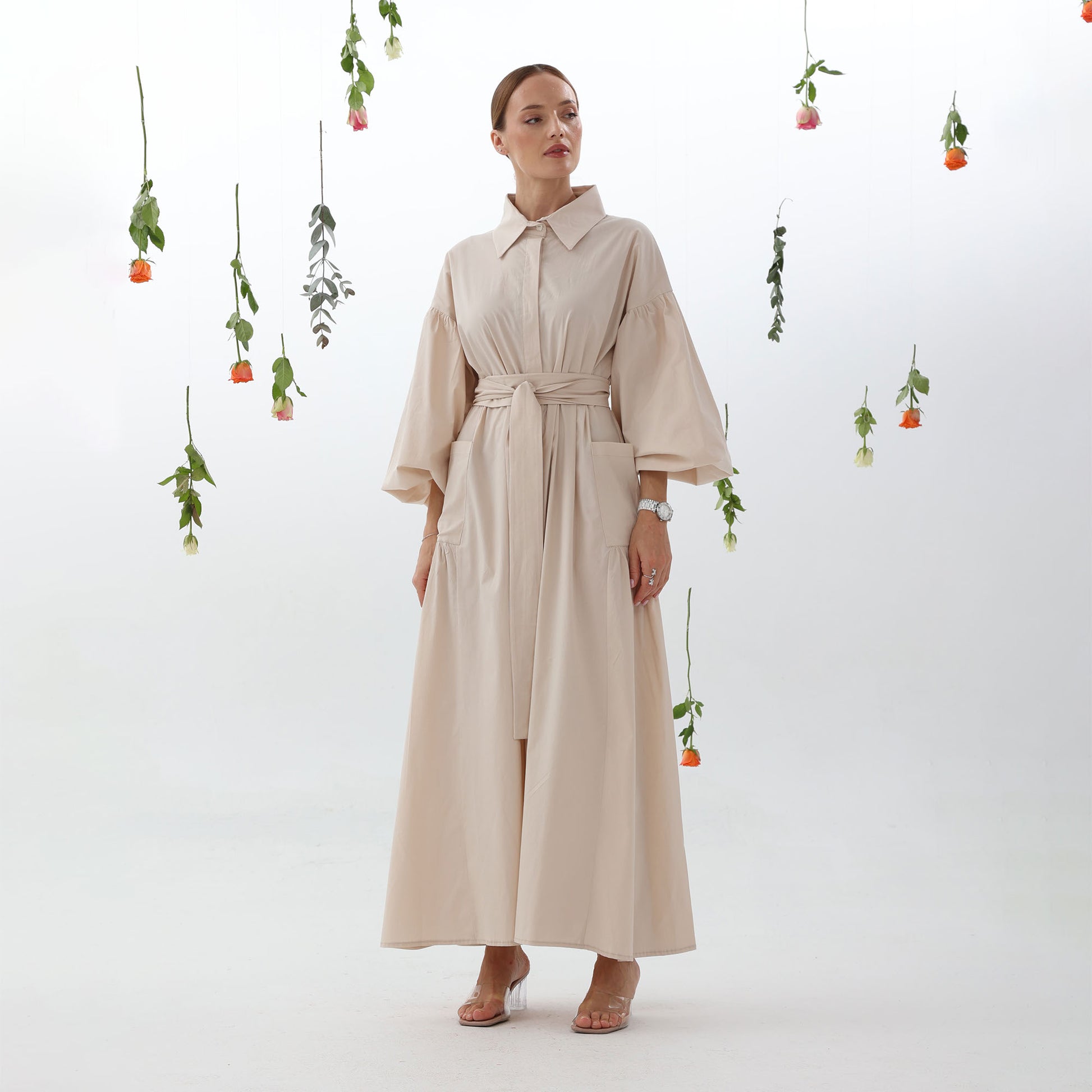 The integrated side pockets maintain the dress's elegant silhouette, while the buff sleeves add femininity and charm. The adjustable belt cinches the waist for a flattering fit.
