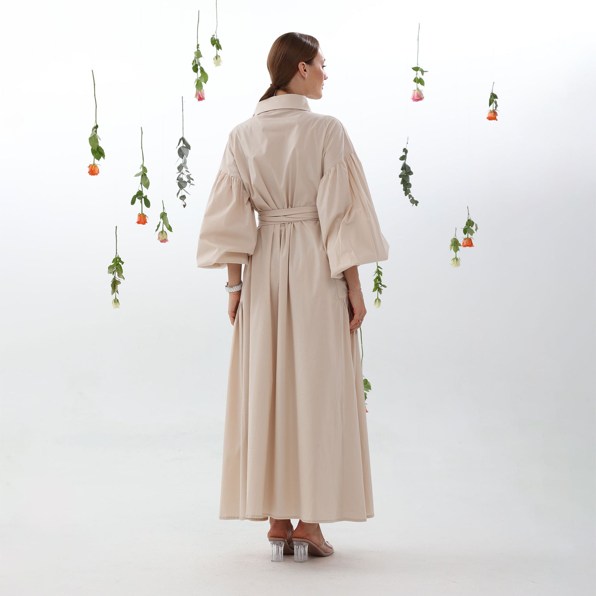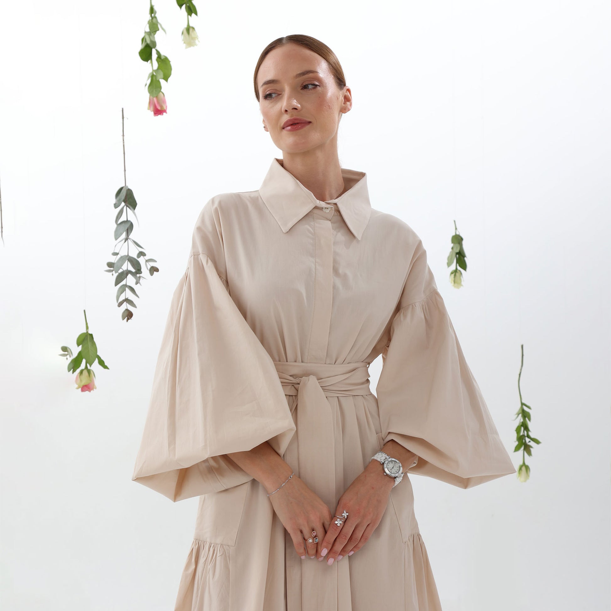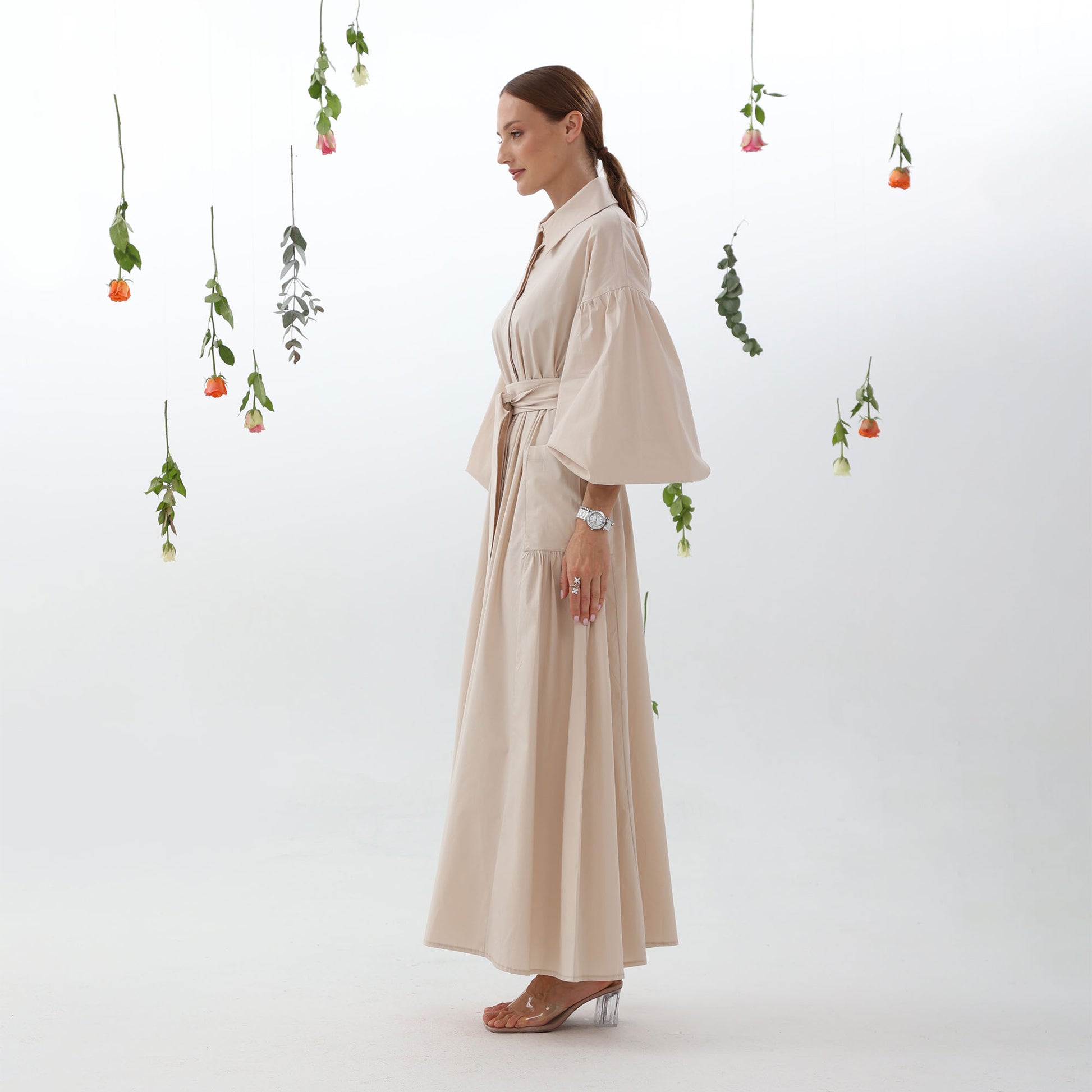 The integrated side pockets maintain the dress's elegant silhouette, while the buff sleeves add femininity and charm. The adjustable belt cinches the waist for a flattering fit.