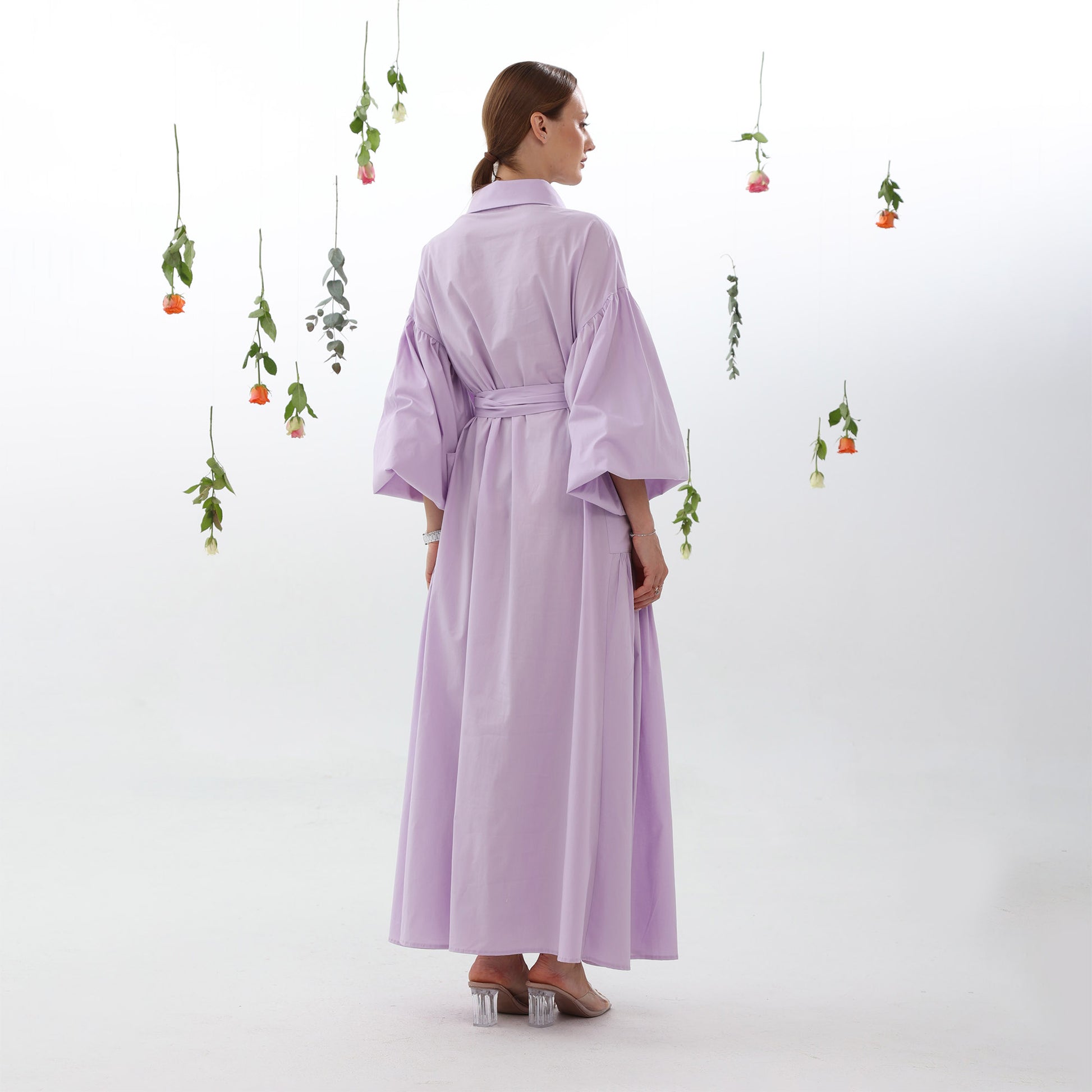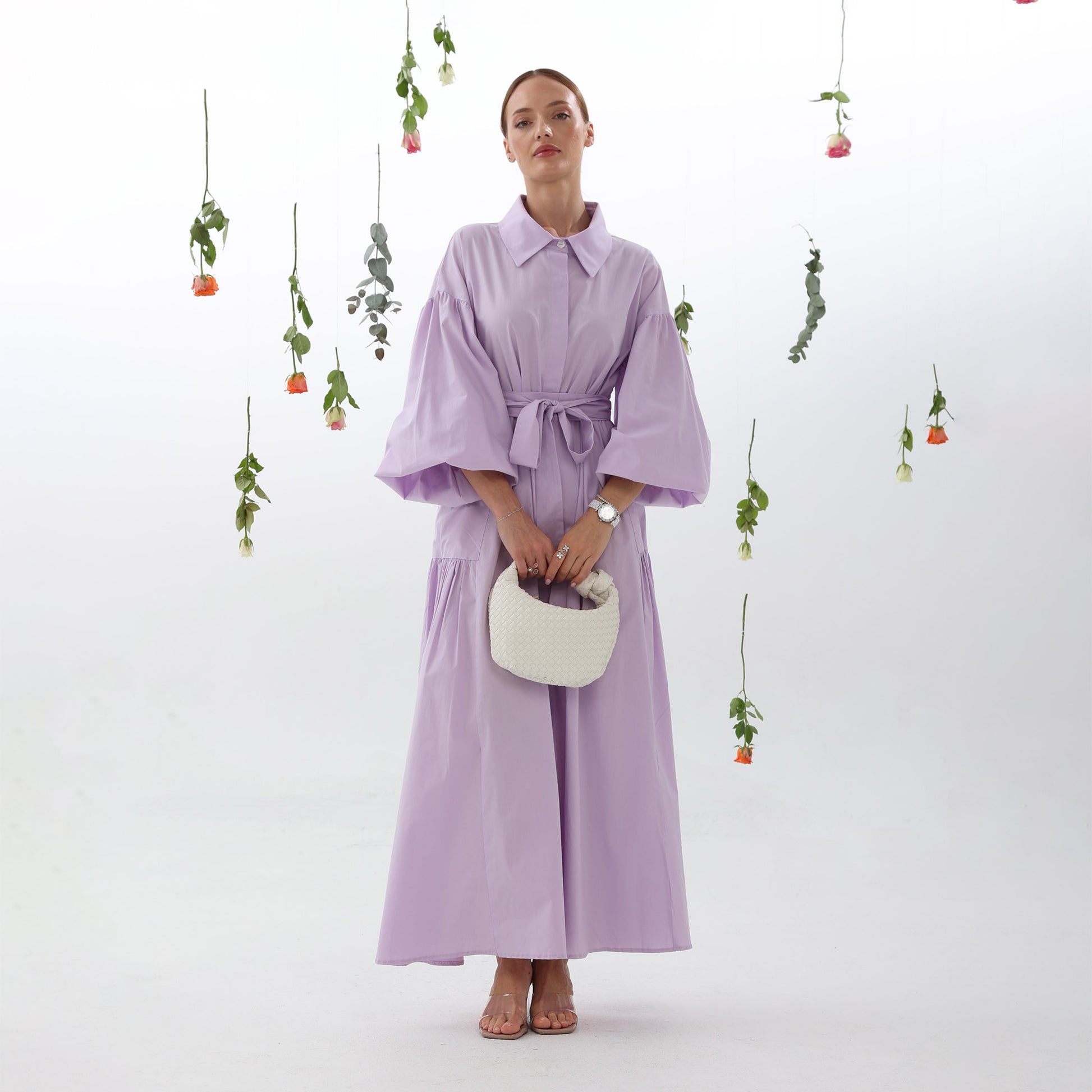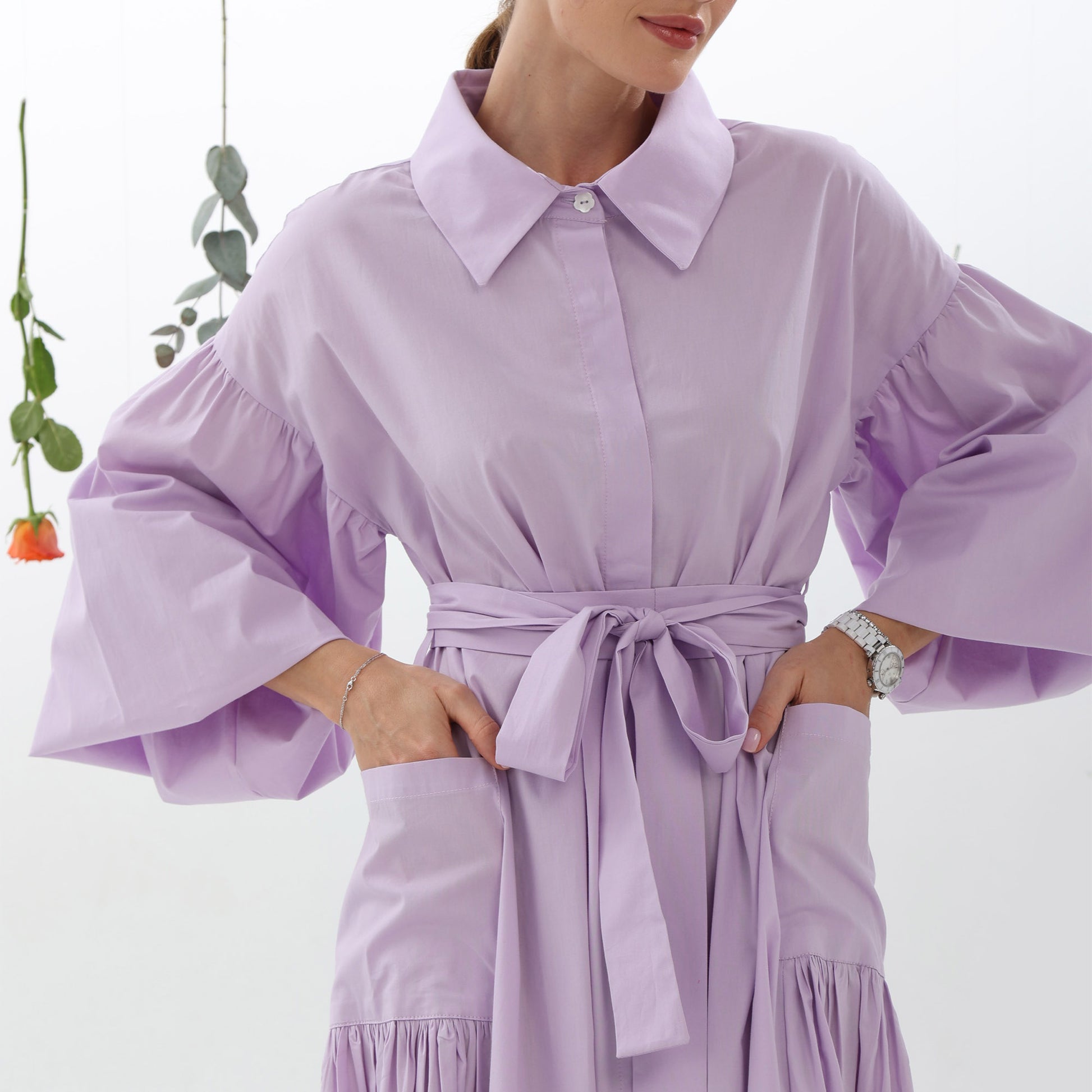 The integrated side pockets maintain the dress's elegant silhouette, while the buff sleeves add femininity and charm. The adjustable belt cinches the waist for a flattering fit.