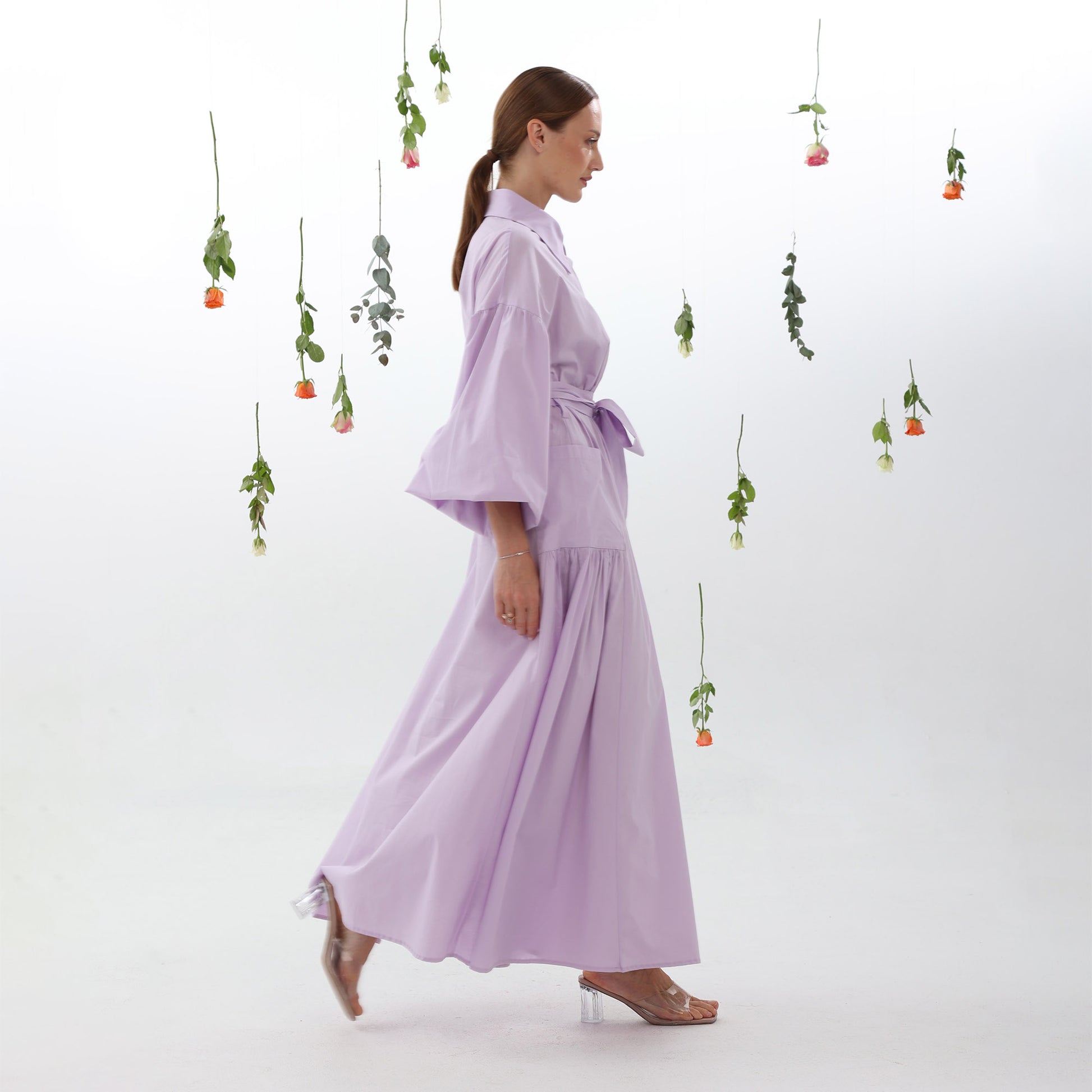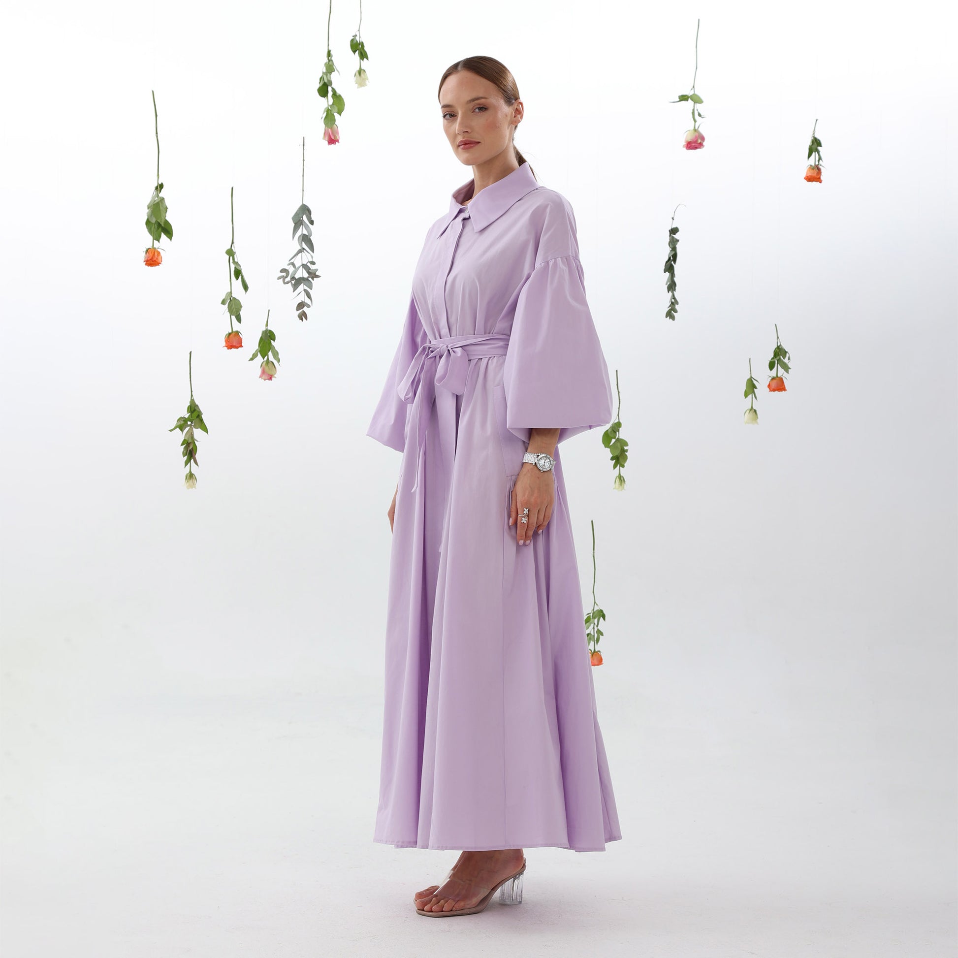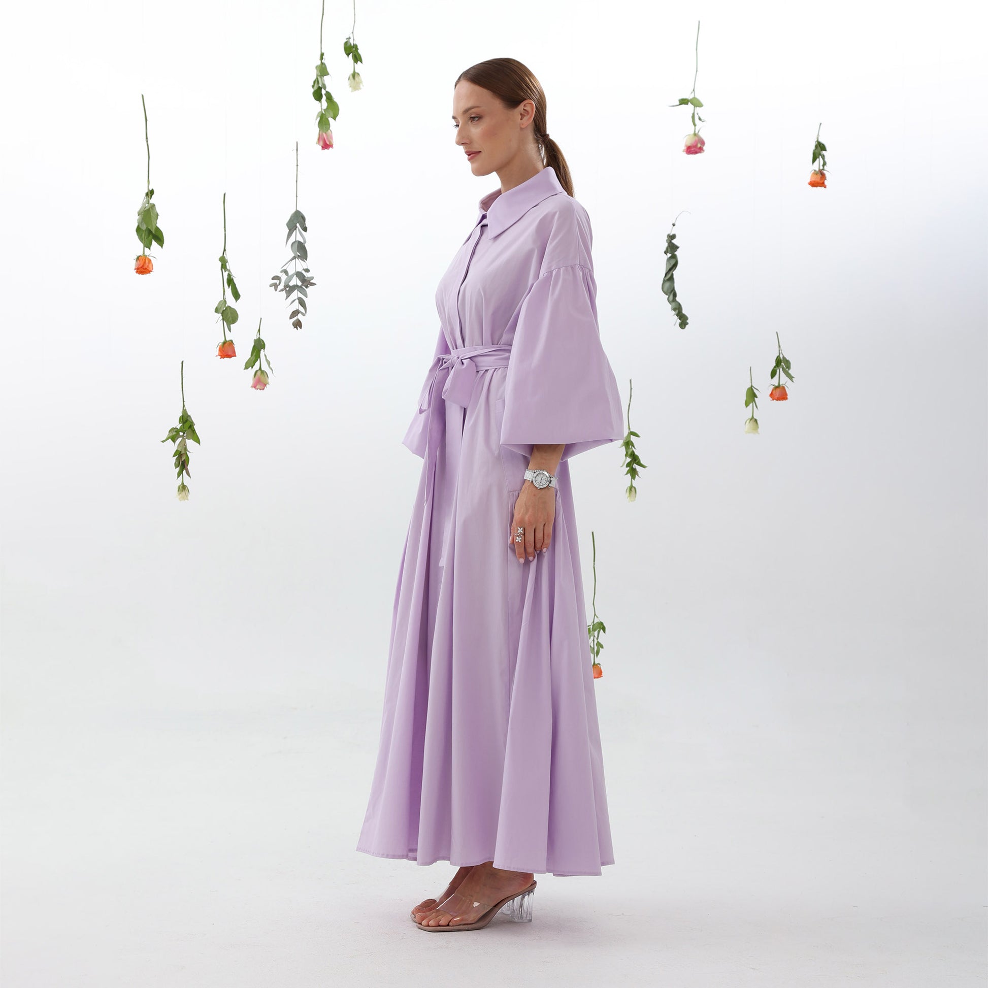 The integrated side pockets maintain the dress's elegant silhouette, while the buff sleeves add femininity and charm. The adjustable belt cinches the waist for a flattering fit.