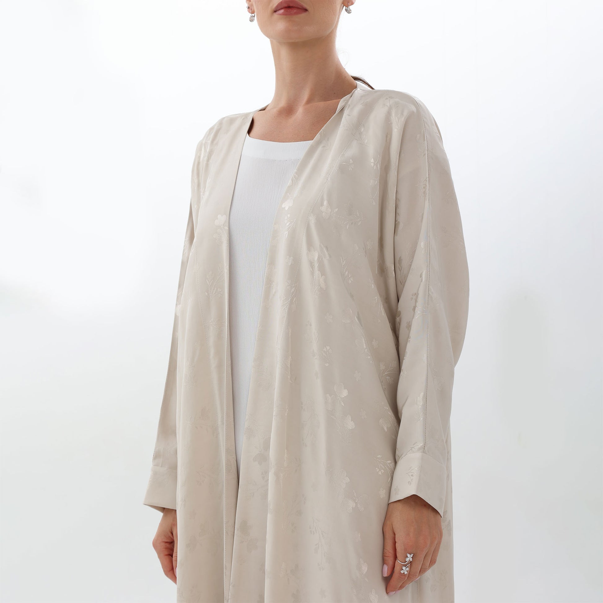 Embrace timeless elegance with our Blossom Abaya in beige. This exquisite piece features a flowing beige-hued overlay, crafted from high-quality fabric that ensures both comfort and style. The subtle floral patterns with delicate small flowers and graceful silhouette evoke a sense of romance and sophistication, perfect for any elegant occasion. the Blossom Abaya ensures you make a statement with effortless grace. Whether you're attending a garden party or an evening soirée, let the soft, flowing fabric and refined design transport you to a world of serene beauty.