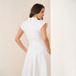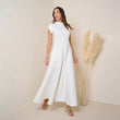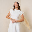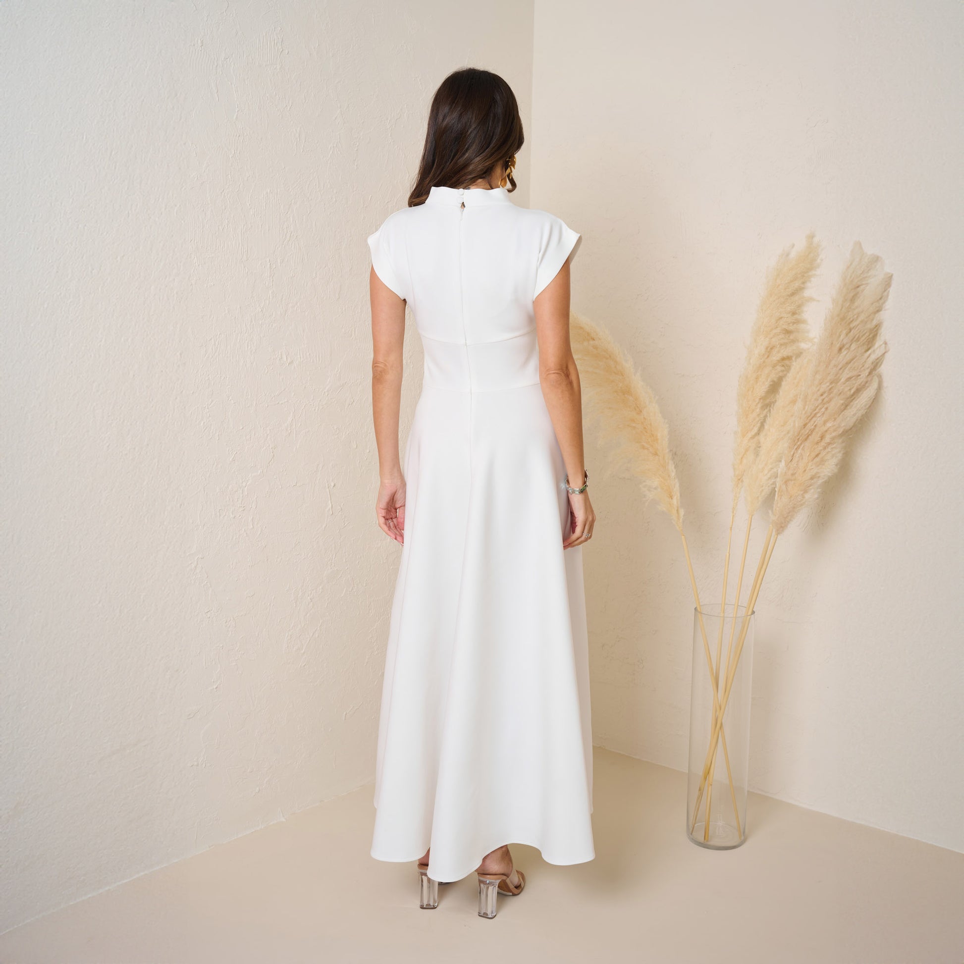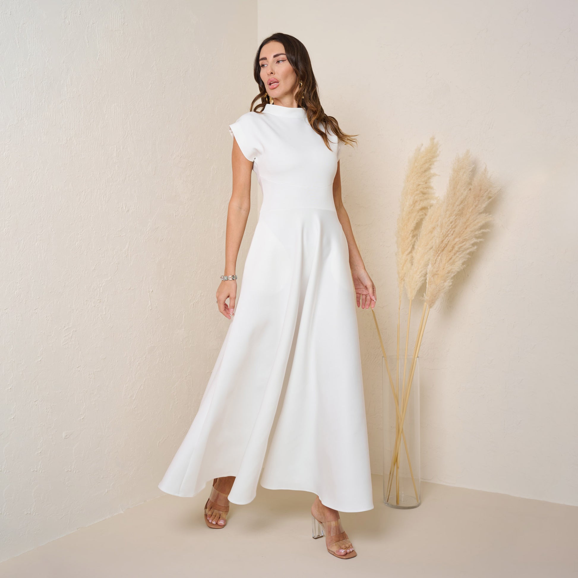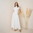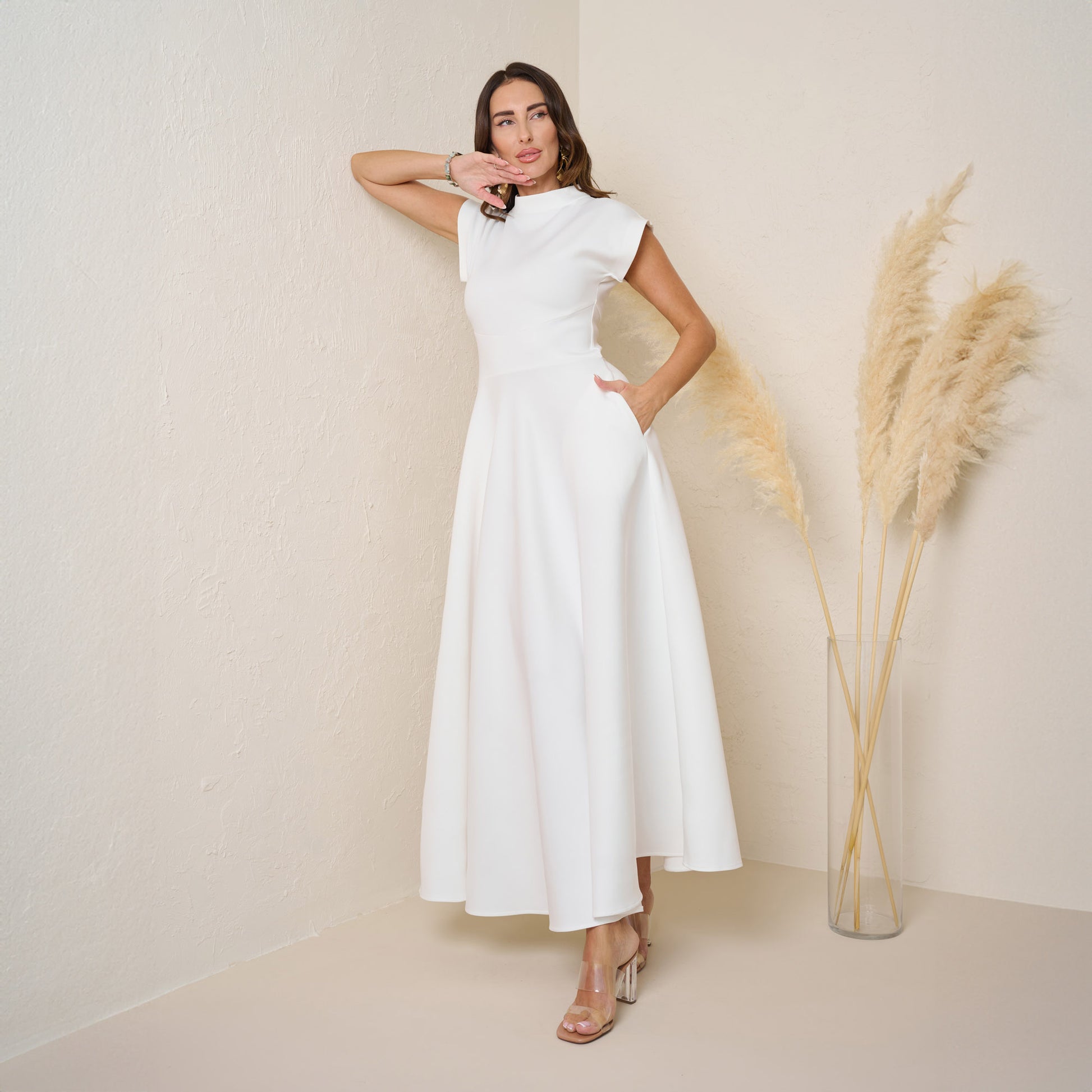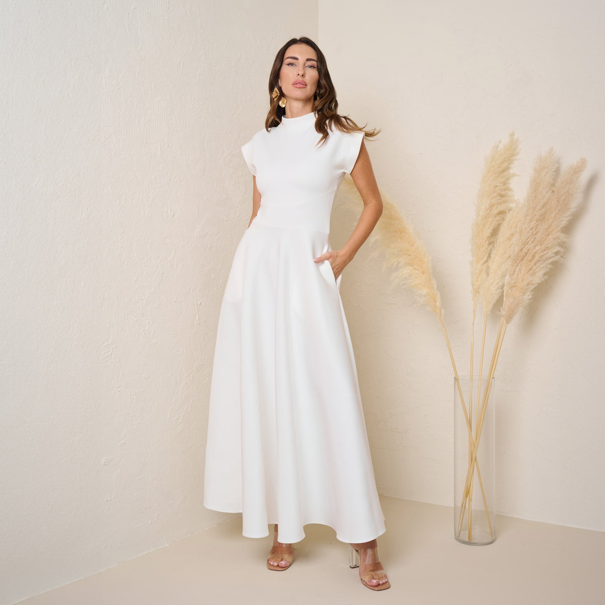 Elevate your fall wardrobe with this elegant off white maxi dress, crafted from a high-quality stretch fabric that combines comfort and style. Featuring a modest high neckline and cap sleeves, this dress offers a sophisticated look perfect for any occasion. The flowing skirt adds a graceful touch, while the fabric provides a flattering fit that moves beautifully with you. Complete with side pockets, this dress is as functional as it is fashionable, making it an ideal choice for a chic and comfortable fall outfit.