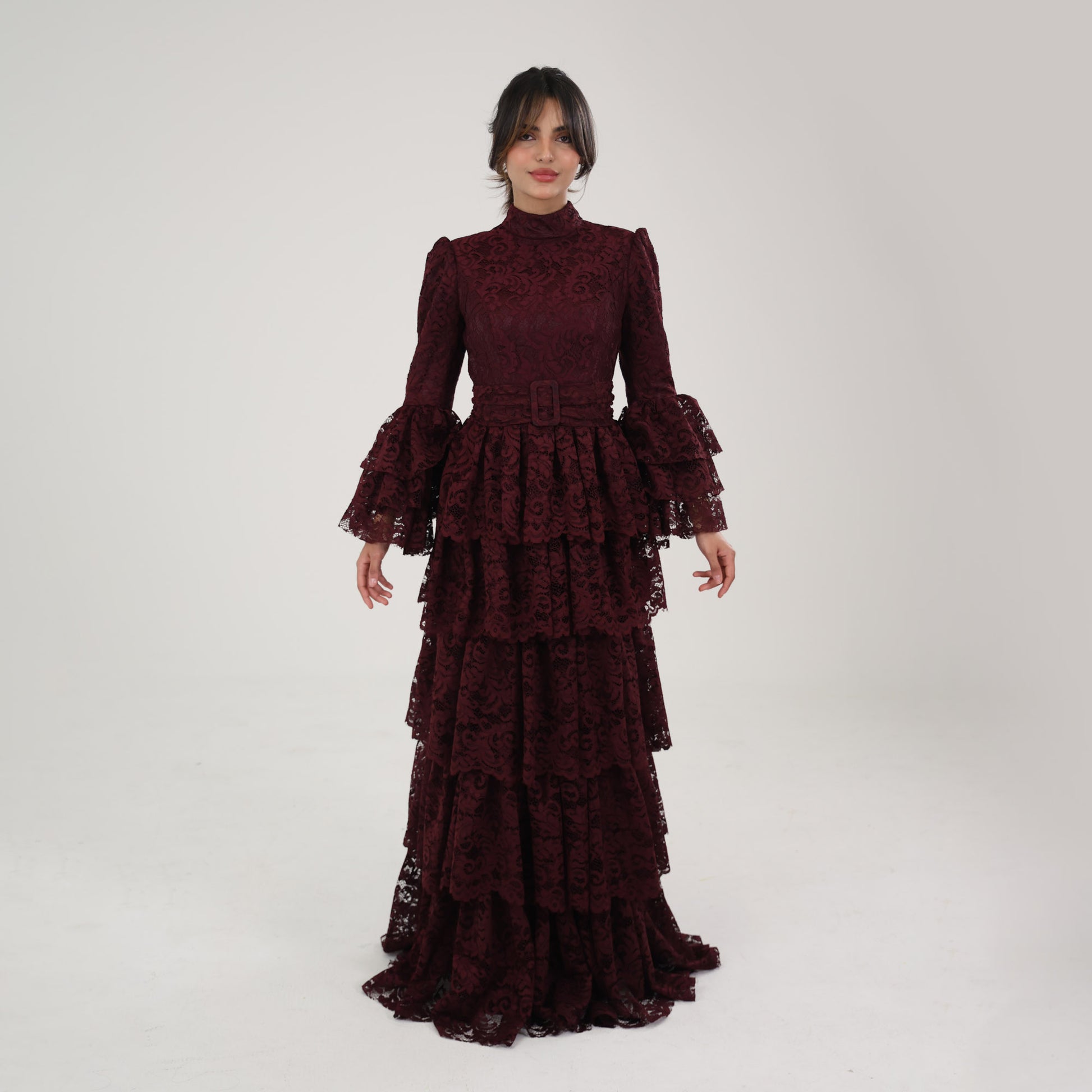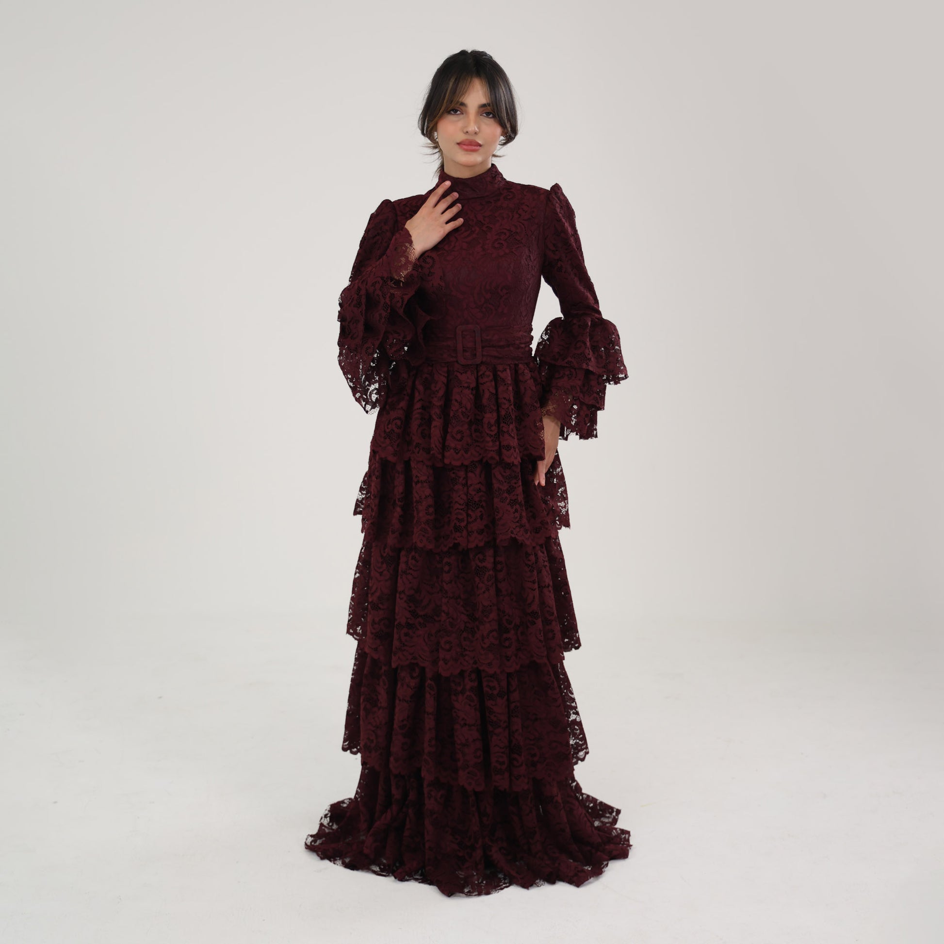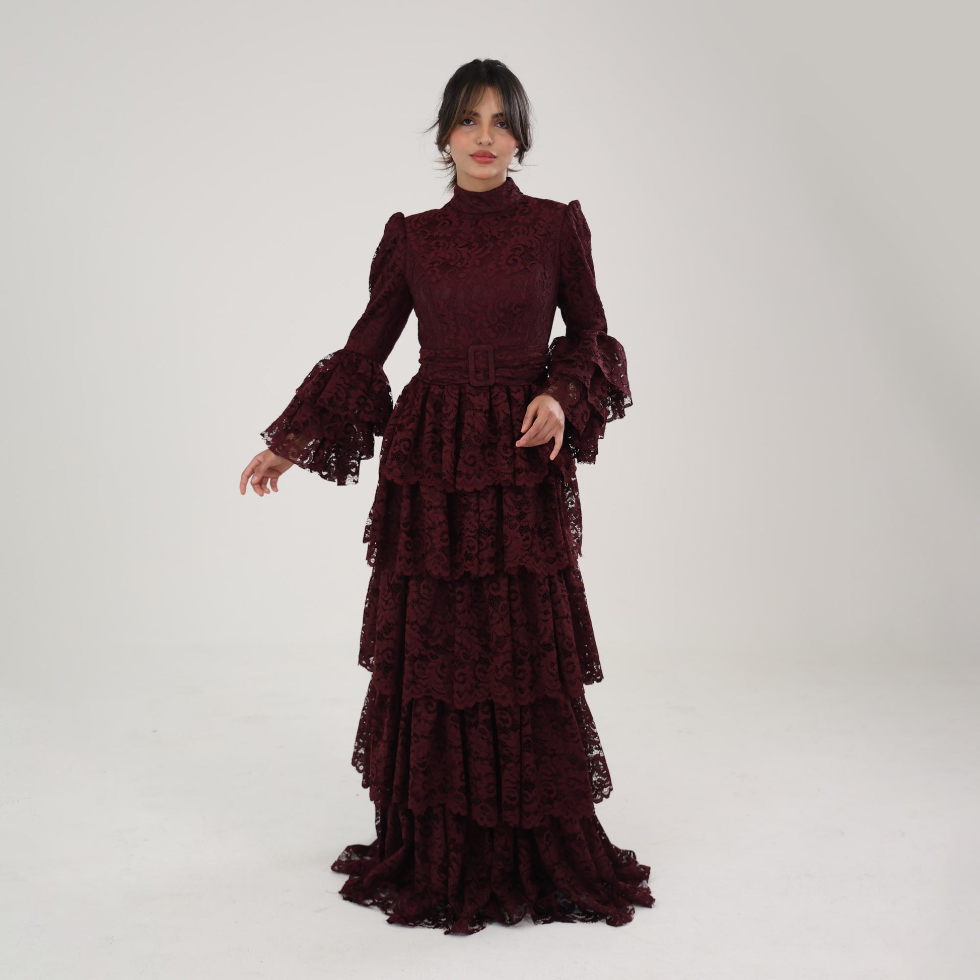This dress is a sophisticated, deep burgundy lace gown, designed with a modest and elegant aesthetic. It features a high neckline and full-length sleeves with flared, layered cuffs, adding a touch of drama and femininity. The bodice and skirt are adorned with intricate lace patterns, while the skirt cascades in multiple tiered layers, creating a flowing, voluminous effect. A tonal belt accentuates the waist, adding structure to the silhouette. This dress would be perfect for formal events, exuding a refined, vintage-inspired charm.