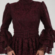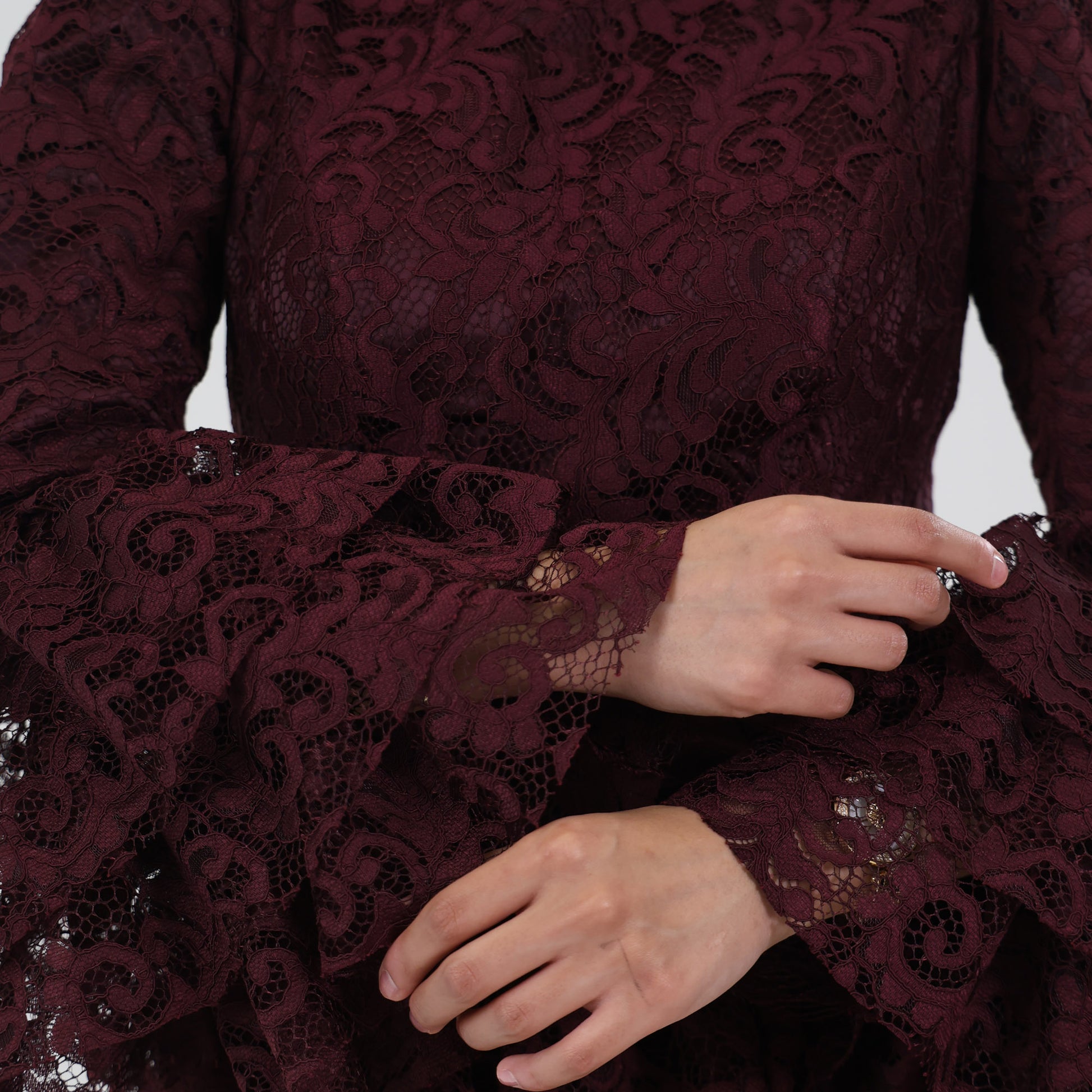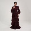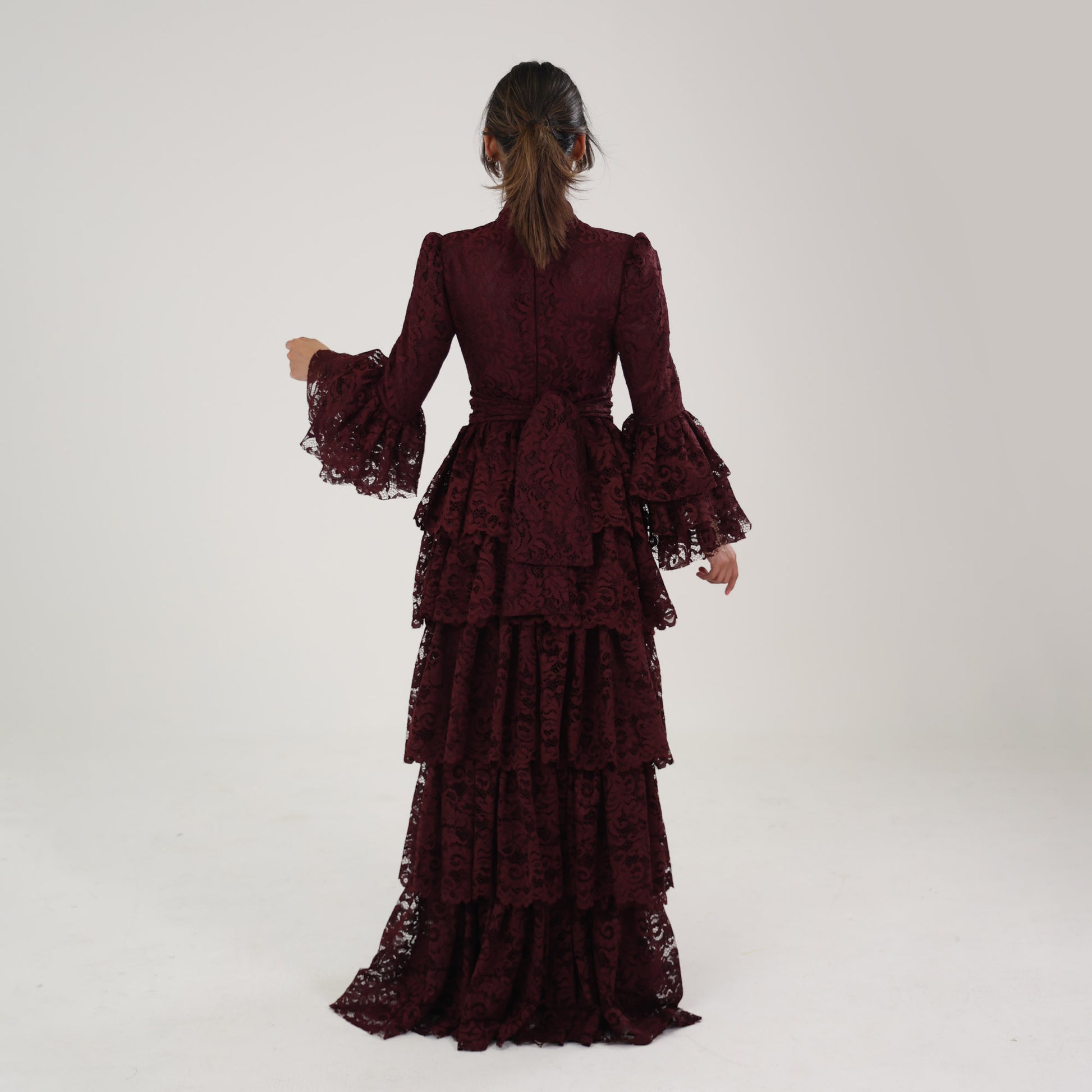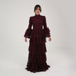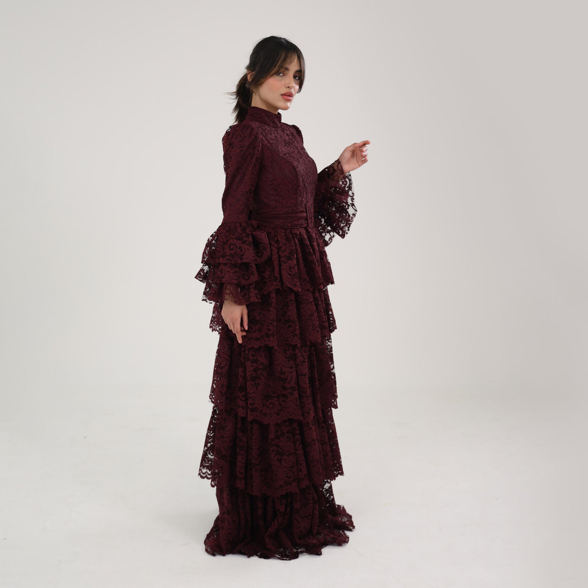 This dress is a sophisticated, deep burgundy lace gown, designed with a modest and elegant aesthetic. It features a high neckline and full-length sleeves with flared, layered cuffs, adding a touch of drama and femininity. The bodice and skirt are adorned with intricate lace patterns, while the skirt cascades in multiple tiered layers, creating a flowing, voluminous effect. A tonal belt accentuates the waist, adding structure to the silhouette. This dress would be perfect for formal events, exuding a refined, vintage-inspired charm.
