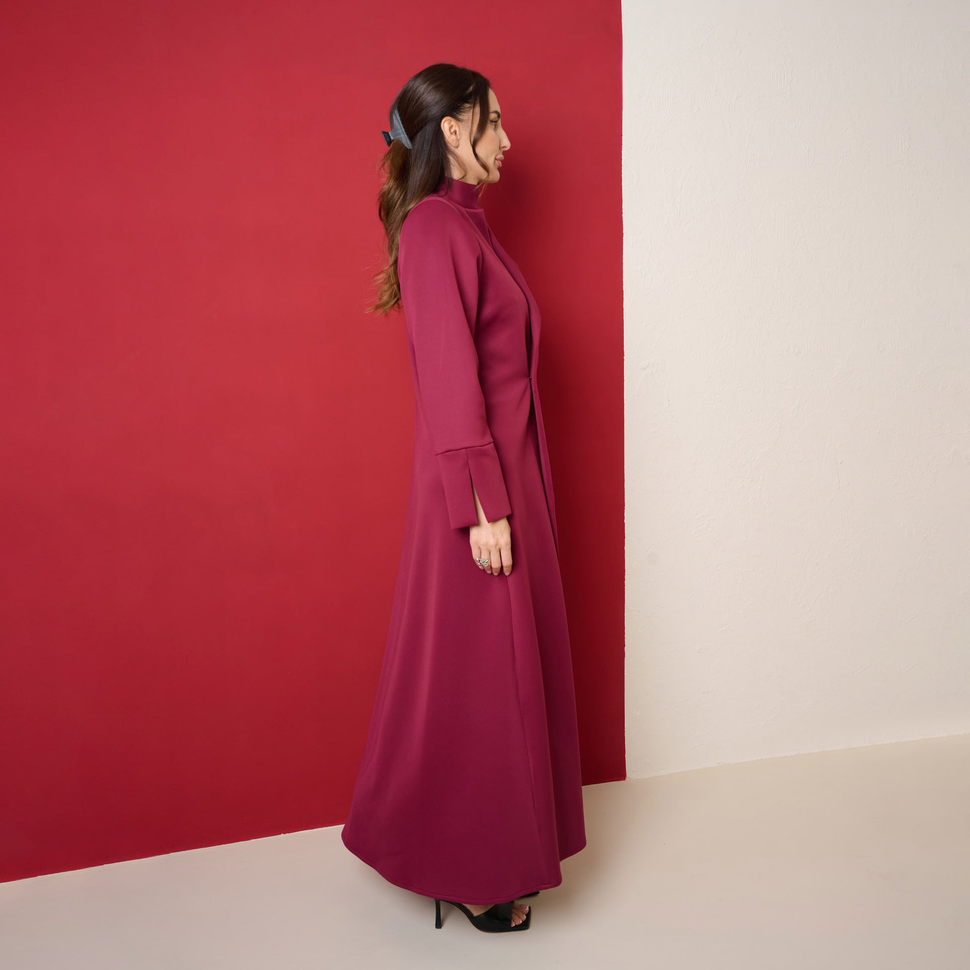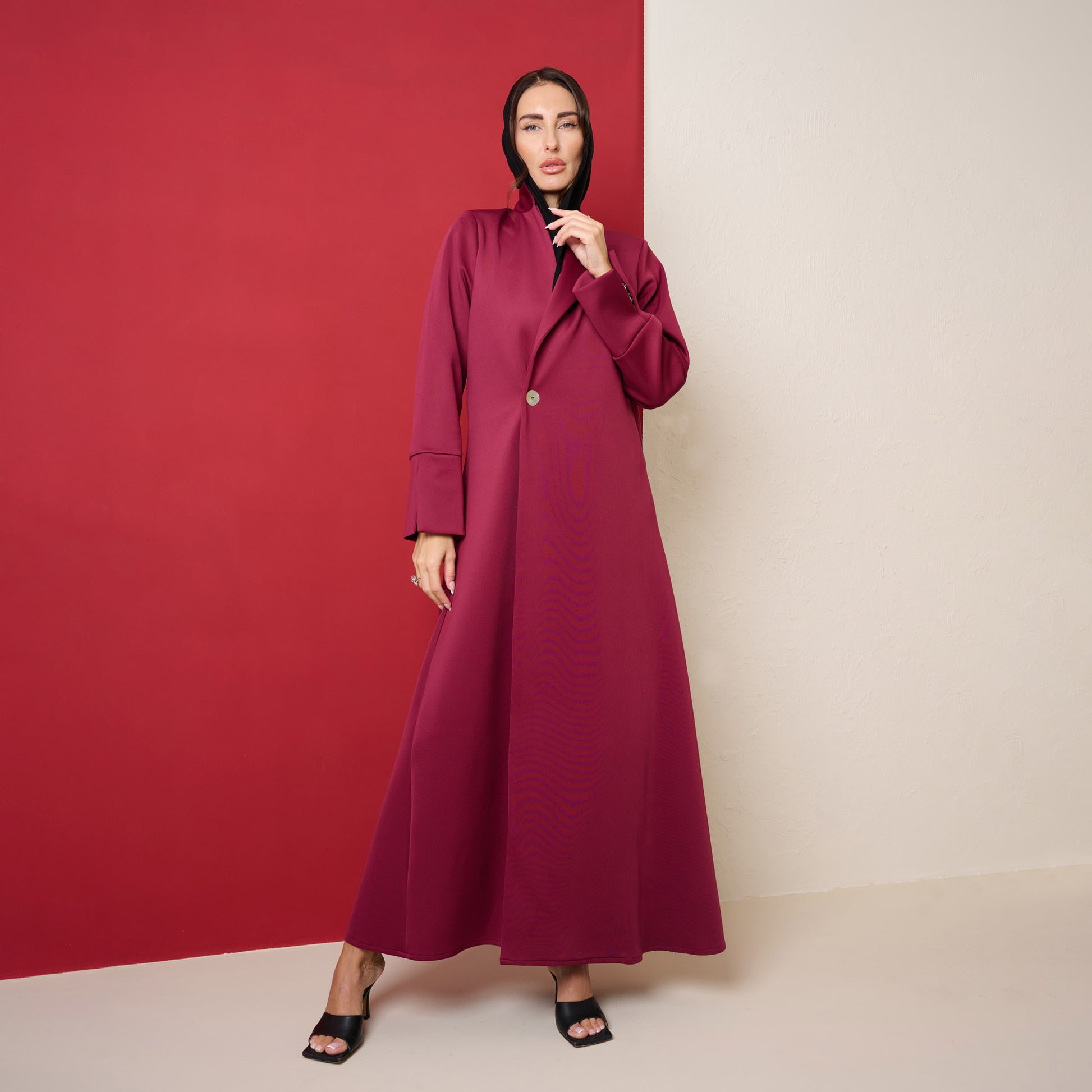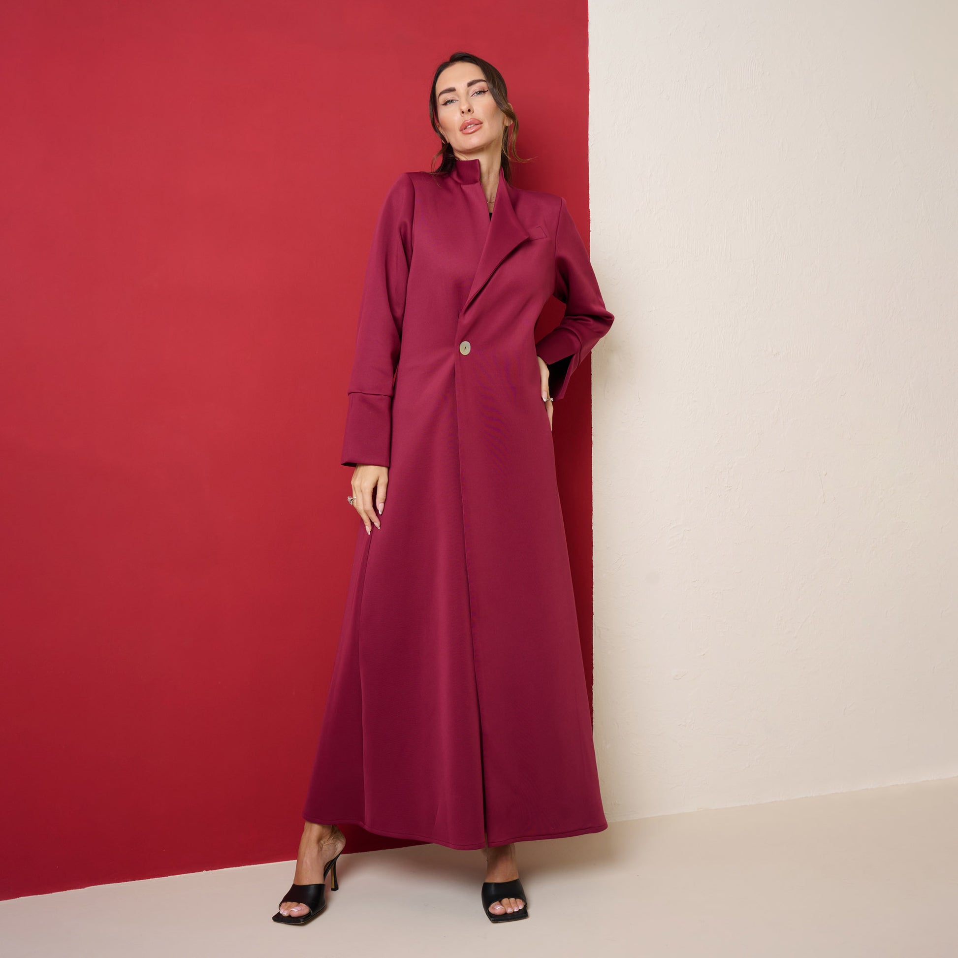 Embrace elegance with this Burgundy abaya crafted from luxury stretch fabric, perfect for the fall season. This modern and modest piece features a structured high collar and long sleeves, offering both sophistication and comfort. The flowy silhouette adds grace to any occasion, making it an essential addition to your wardrobe for effortless style and versatility.