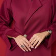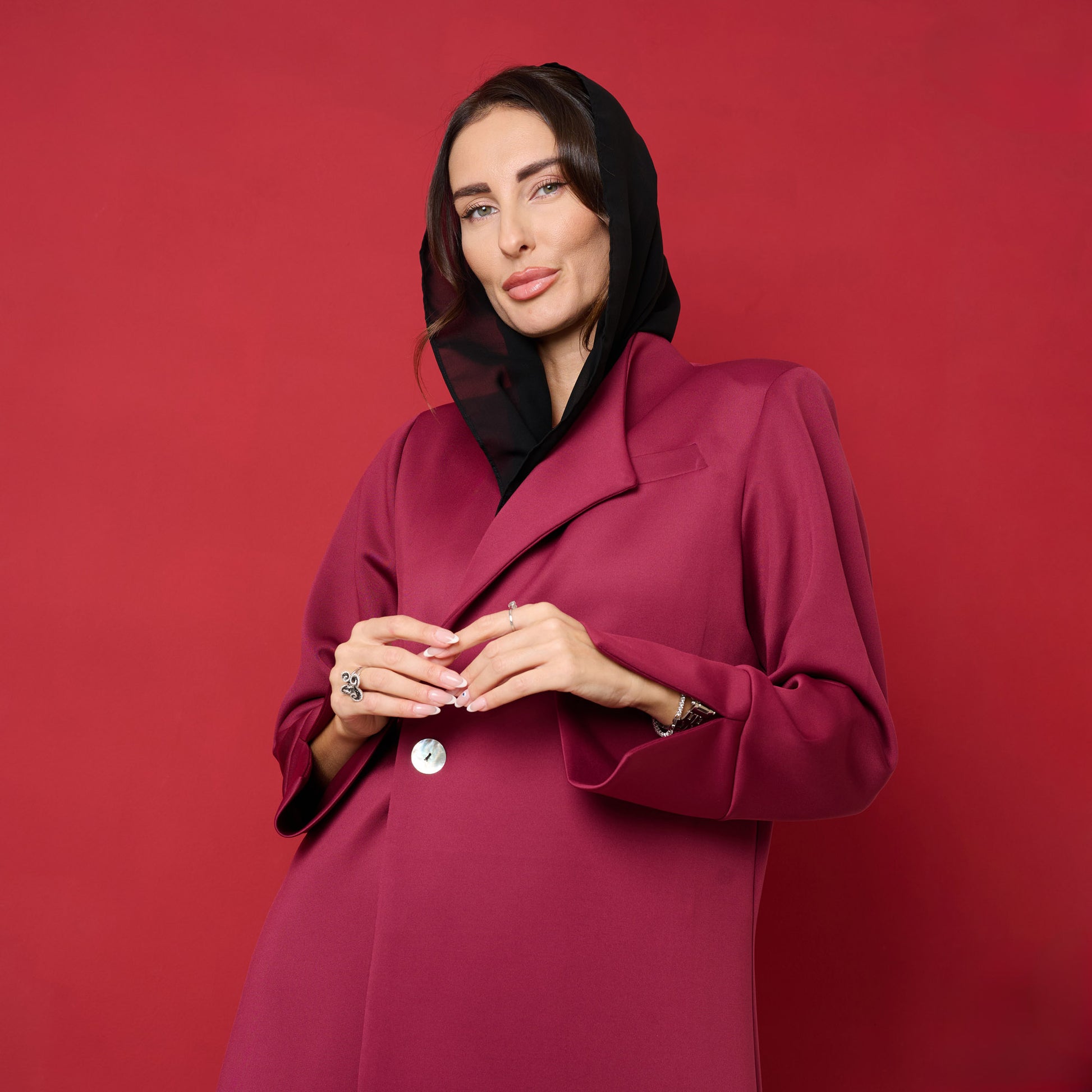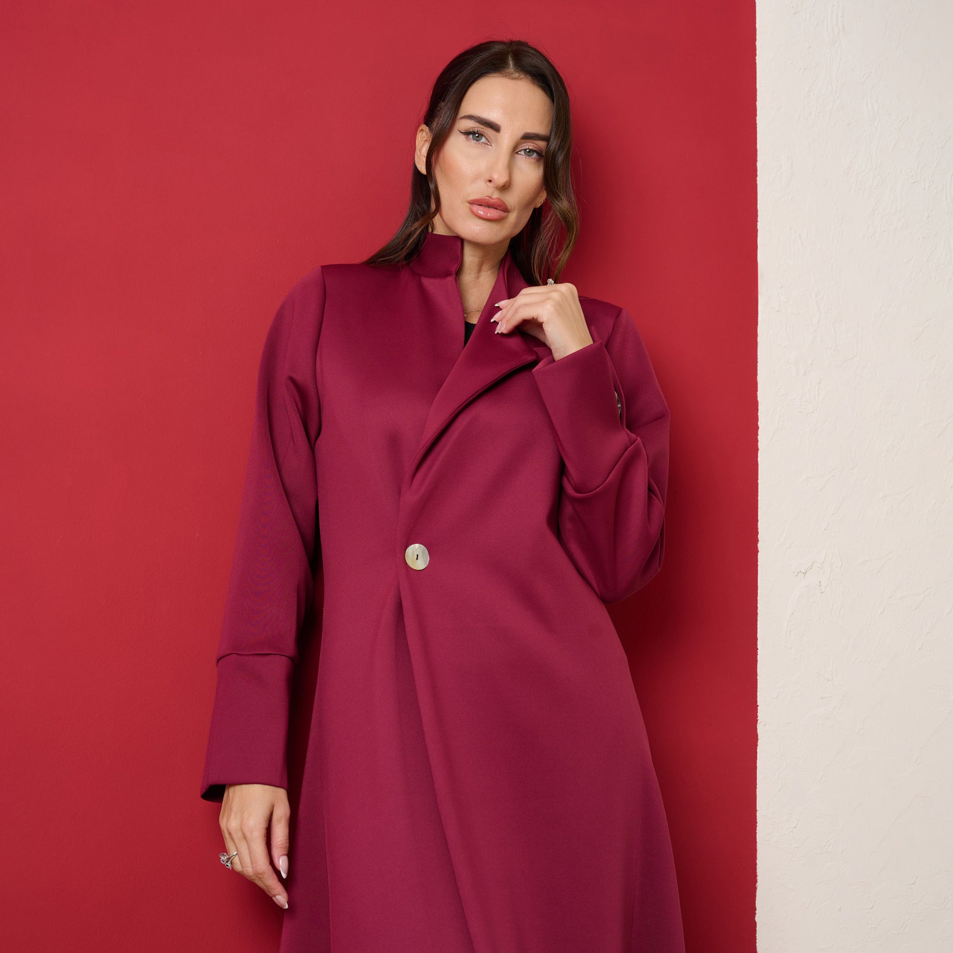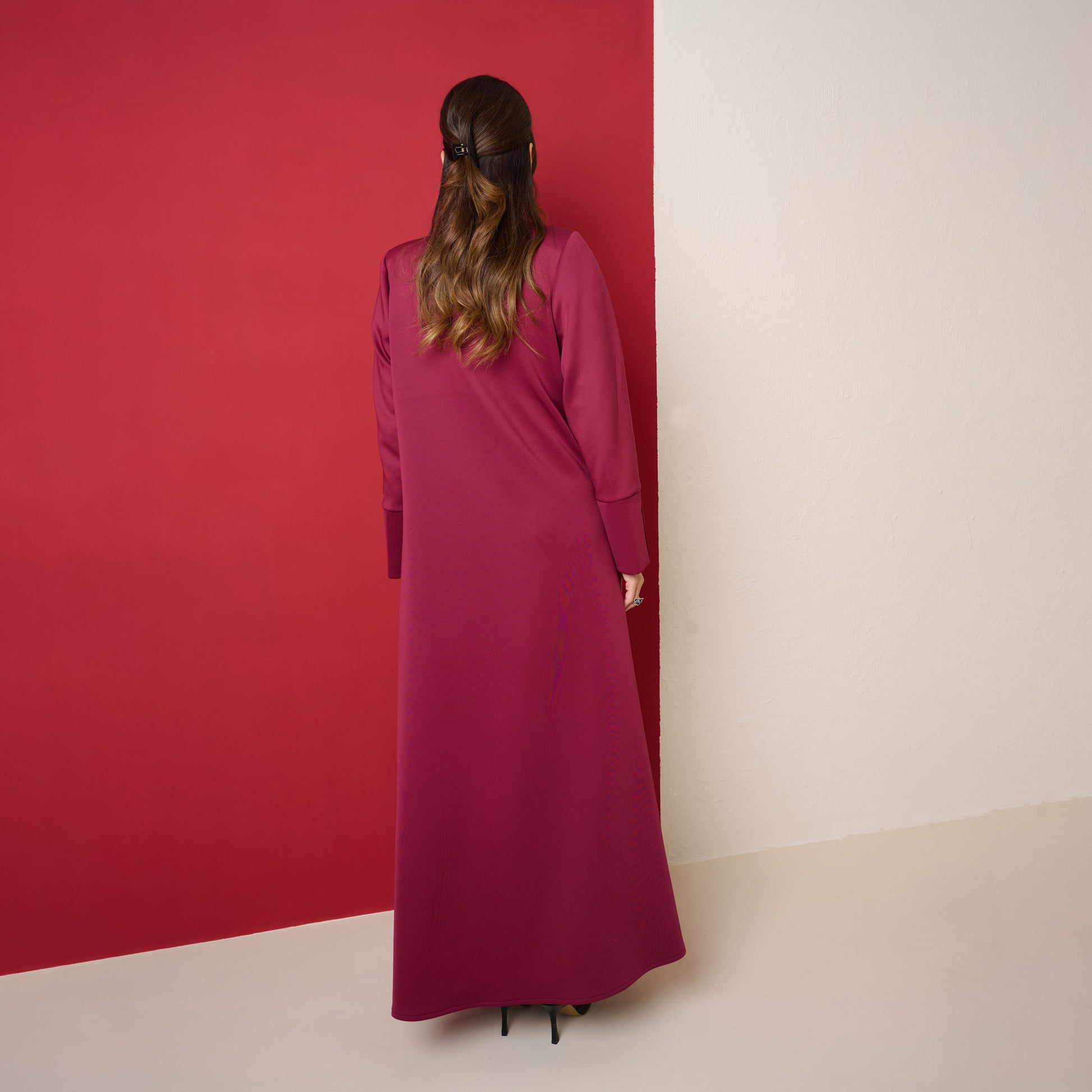 Embrace elegance with this Burgundy abaya crafted from luxury stretch fabric, perfect for the fall season. This modern and modest piece features a structured high collar and long sleeves, offering both sophistication and comfort. The flowy silhouette adds grace to any occasion, making it an essential addition to your wardrobe for effortless style and versatility.