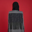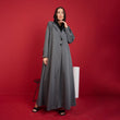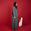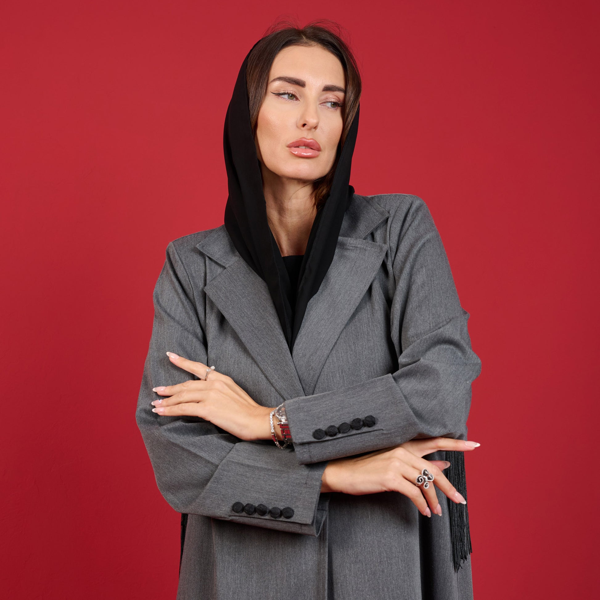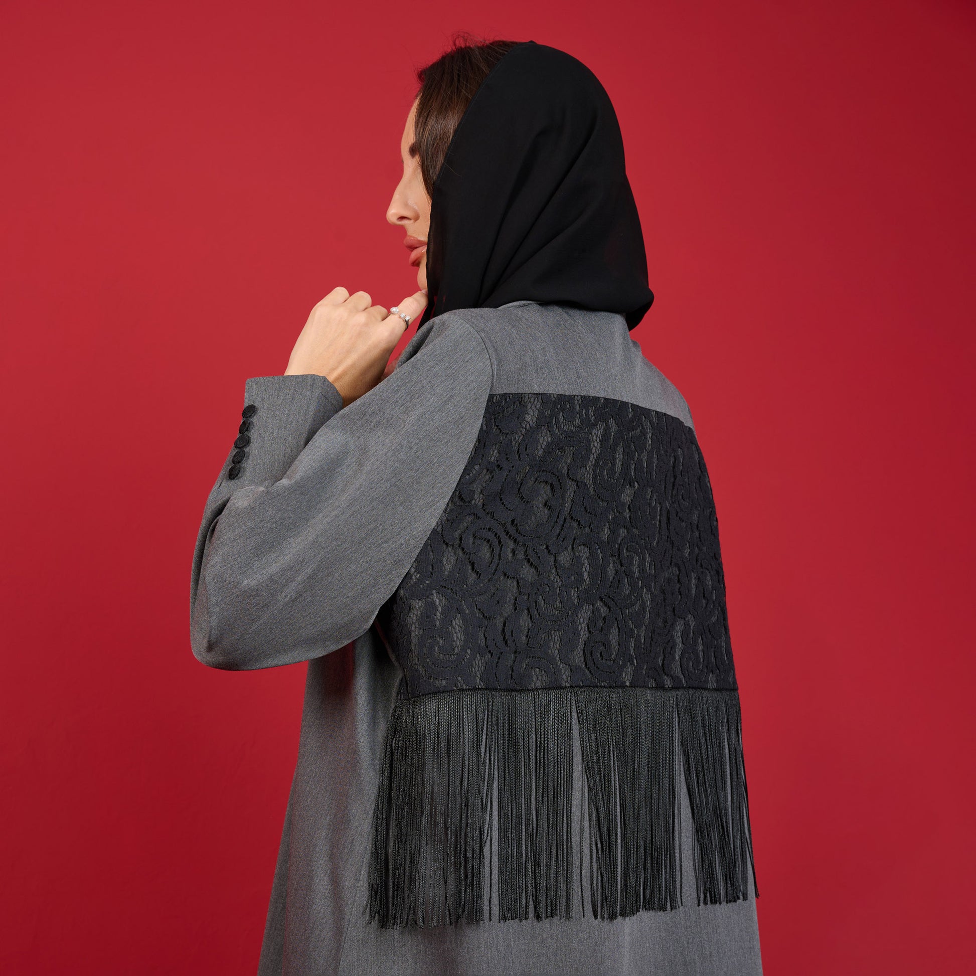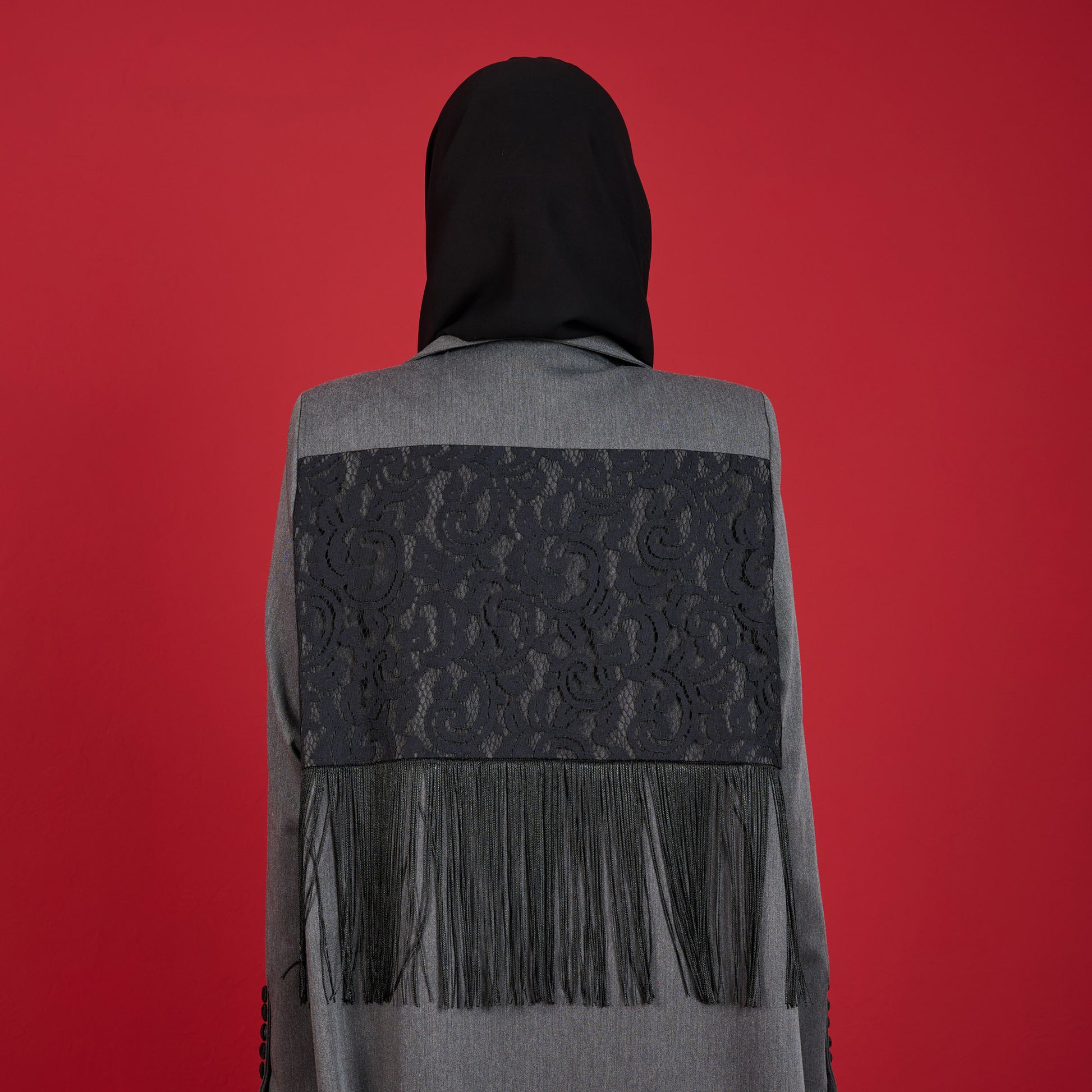 This abaya is a modern and sophisticated piece, combining minimalism with a touch of edge. It features a sleek, tailored silhouette in a deep gray fabric, exuding elegance and professionalism. The back is adorned with a unique black panel that includes black lace and subtle fringed detailing, adding texture and a hint of contemporary flair. The abaya has a cote cut, with button accents at the cuffs for a refined finish. This abaya is perfect for both formal and casual settings, offering a chic and versatile look.