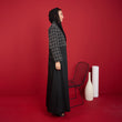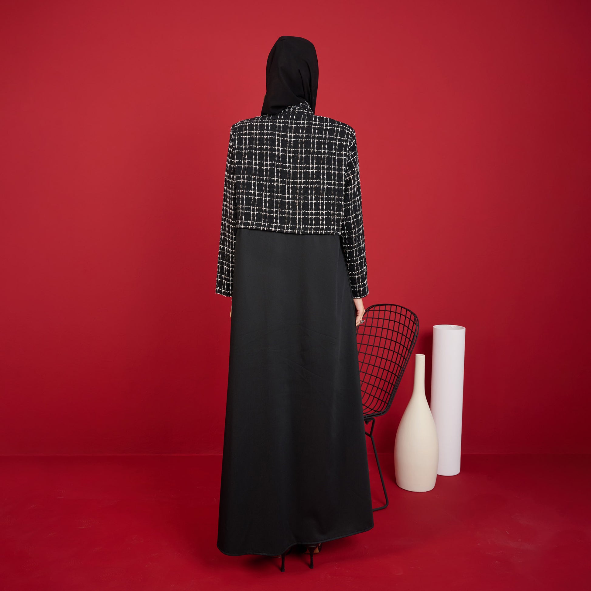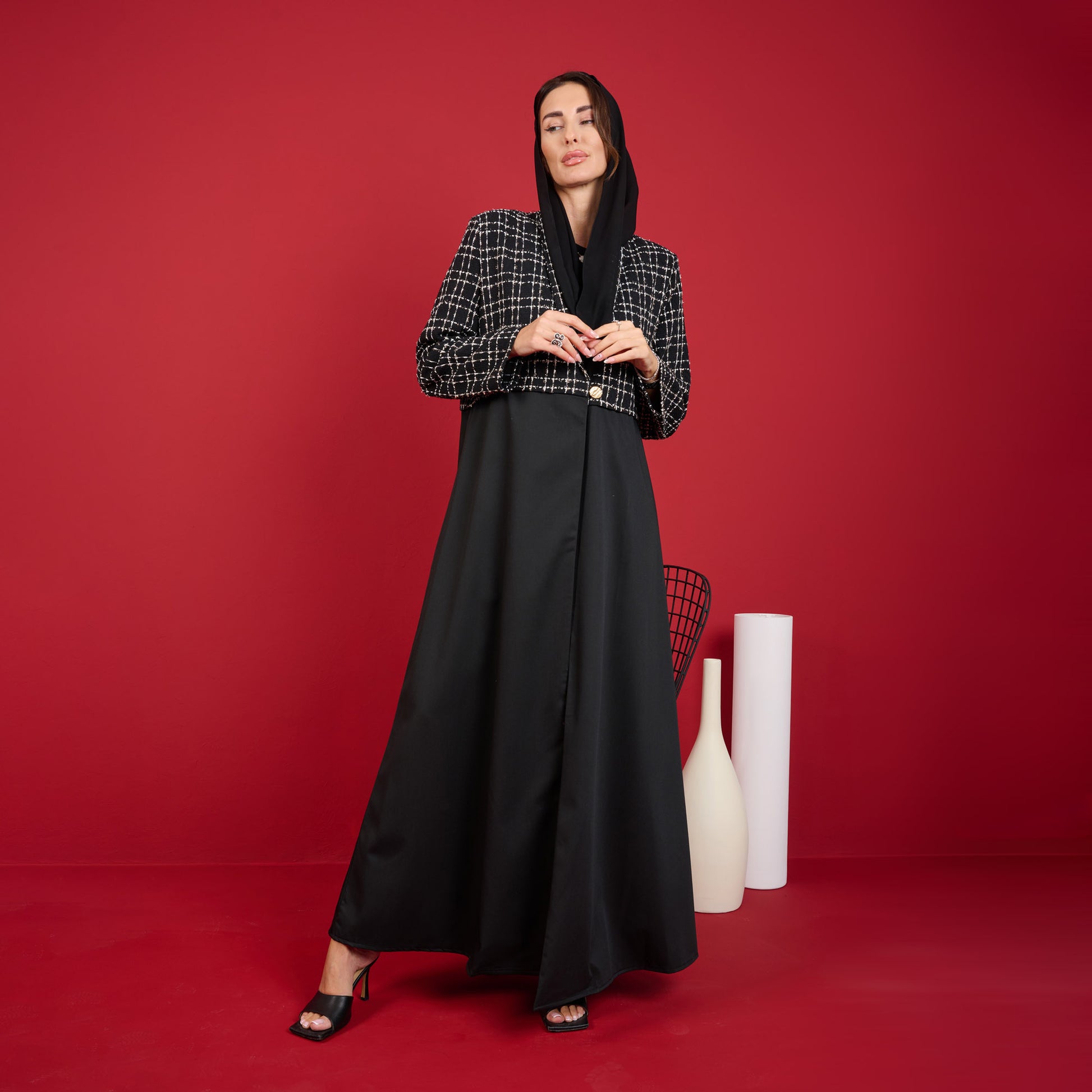 This abaya features a refined combination of classic and contemporary elements. The top half has a cropped jacket-style overlay in a luxuries tweed fabric, adding structure and elegance to the design. The lower half flows gracefully in a crepe black fabric, creating a chic, elongated silhouette. A single button closure at the top adds a hint of detail, while the simplicity keeps the look sleek and timeless. This abaya is ideal for formal gatherings or special occasions, balancing modern style with timeless grace.