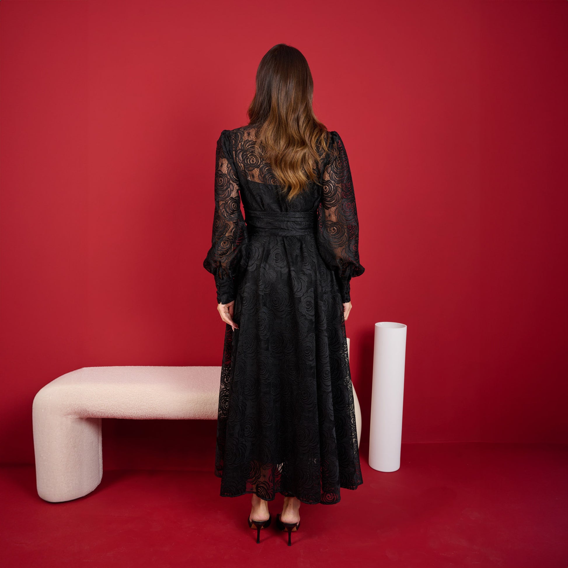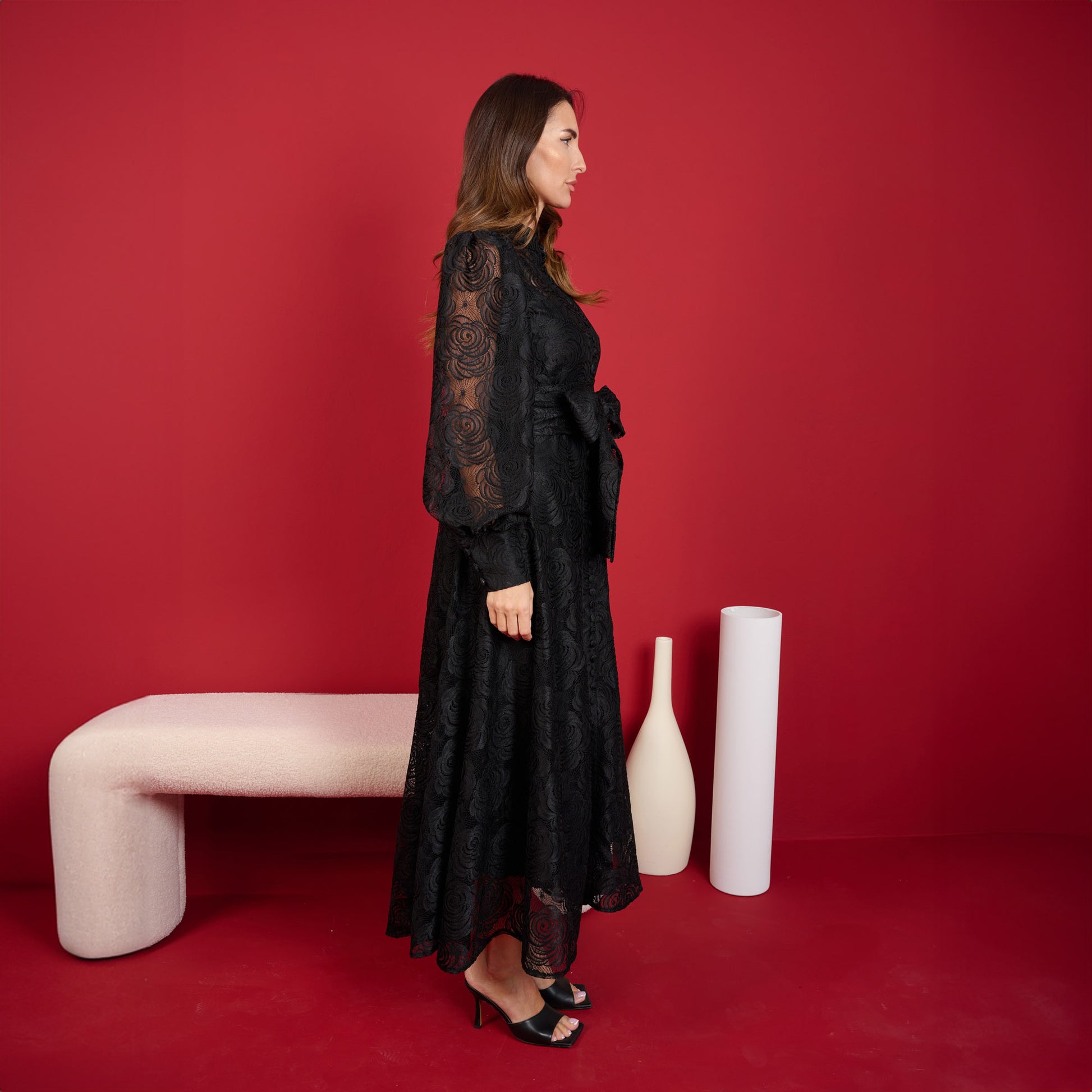 يتميز هذا الفستان الأنيق بطوله وتصميم الدانتيل الفرنسي الفاخر بلون أسود كلاسيكي. يحتوي على أكمام طويلة ومنتفخة بنمط دانتيل دقيق، مما يضيف لمسة من الجمال الكلاسيكي. يتميز بياقة عالية وجزء علوي ضيق يبرز الإطلالة الراقية، مع حزام يربط عند الخصر ليحدد القوام ويضفي لمسة أنثوية. يتضمن الفستان أزراراً تمتد على طول الجزء الأمامي، كإضافة أنيقة للتصميم. هذا الفستان مثالي للمناسبات الرسمية أو لإطلالة محتشمة وأنيقة، حيث يعبر عن الجمال الكلاسيكي والرقي.