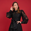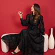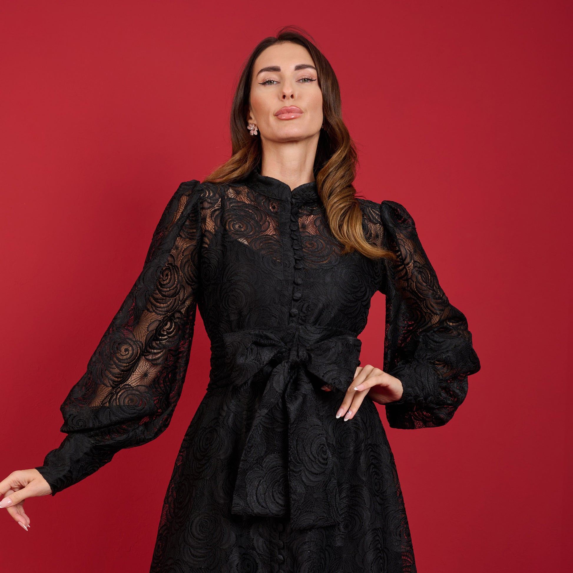 This elegant dress features a length with a beautiful, intricate lace overlay in a classic black color. It has voluminous, puffed long sleeves with a delicate lace pattern, adding a touch of vintage charm. The high neckline and fitted bodice accentuate a sophisticated look, while a tied belt at the waist provides definition and a feminine silhouette. The dress buttons down the front, adding a refined detail. Perfect for formal occasions or a chic, modest look, this design exudes timeless elegance and grace.
