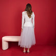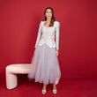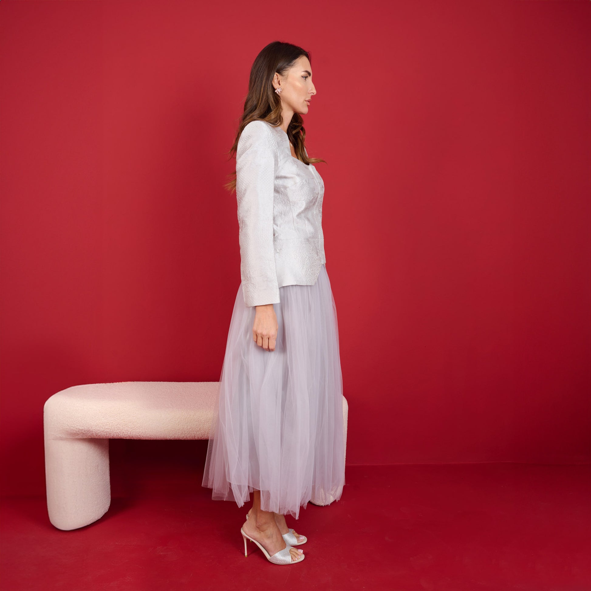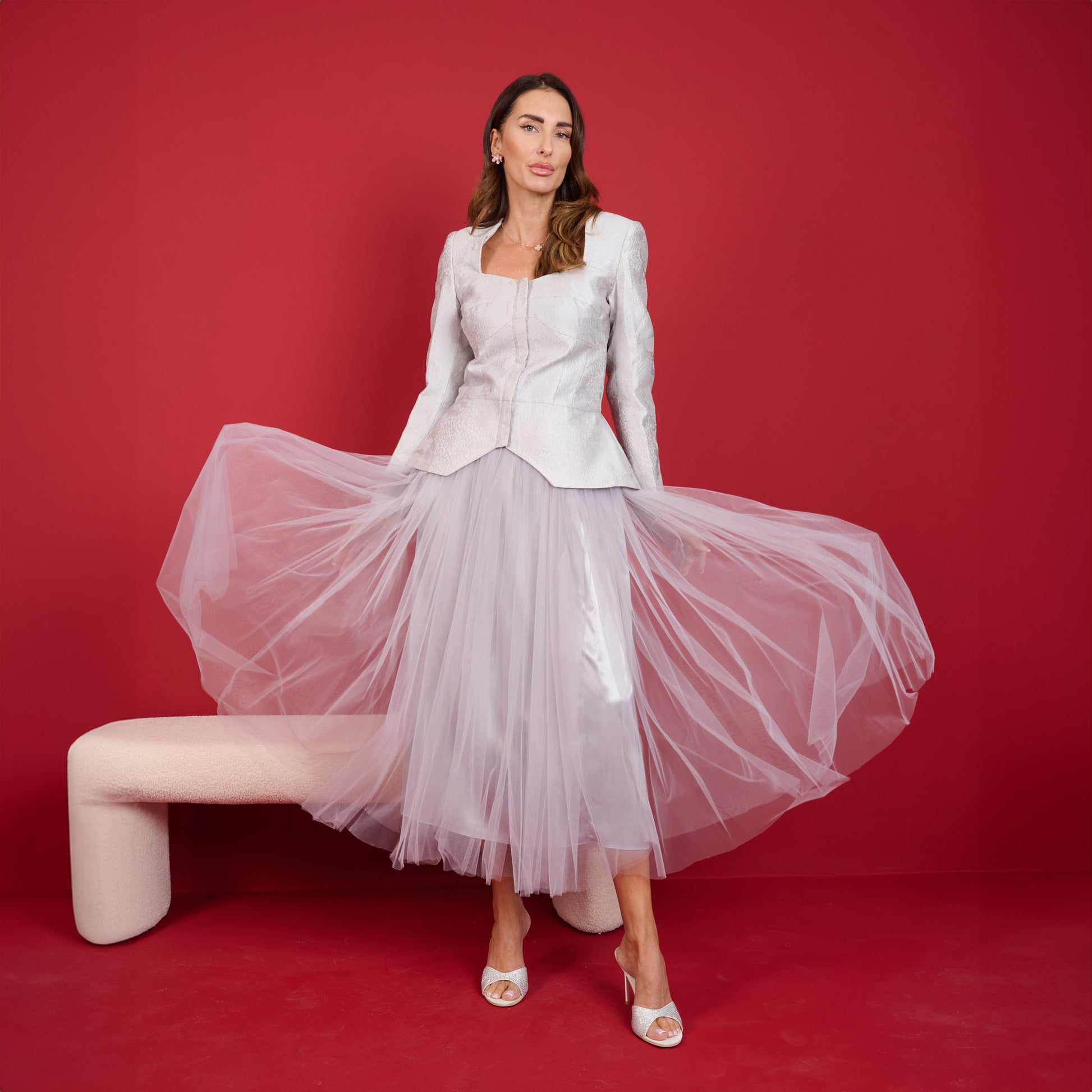 التنورة: مصنوعة من قماش التول الخفيف، مما يمنح الإطلالة مظهرًا حالماً ورقيقًا. تضيف طبقات التول إحساسًا بالحركة والأنوثة.