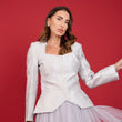 - Jacket: Tailored from luxurious jacquard fabric, offering a structured yet sophisticated silhouette. The intricate texture of the jacquard adds depth and refinement to the design.