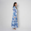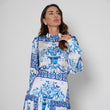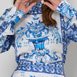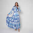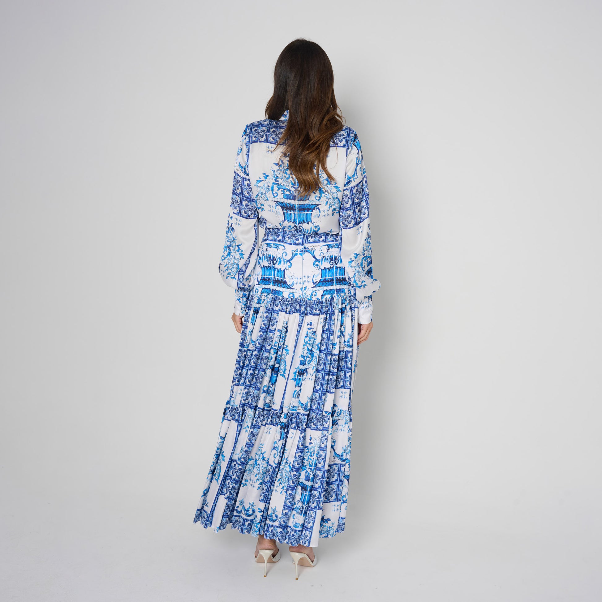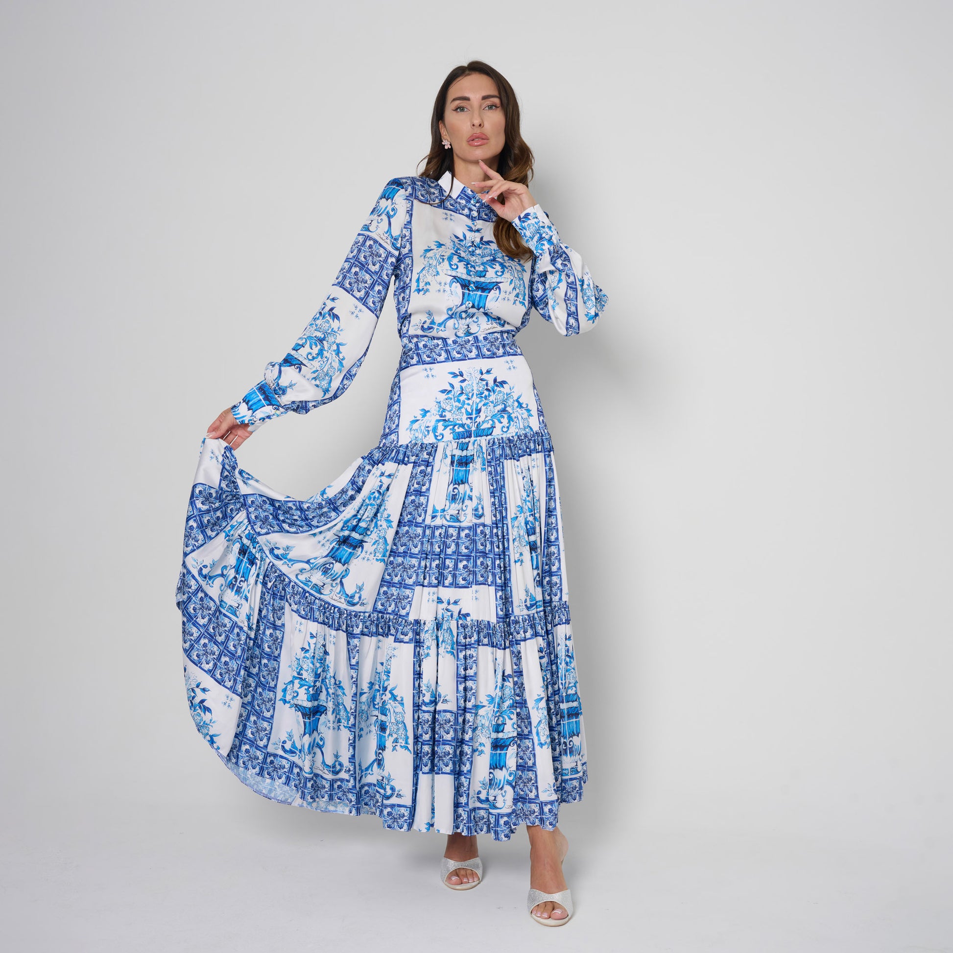 This elegant set consists of a matching shirt and skirt with a beautiful blue and white porcelain-inspired pattern. The shirt has a high neckline and long, slightly puffed sleeves, giving it a sophisticated and modest appearance. The skirt is full-length and features tiered layers, adding volume and flow to the outfit. The intricate print is reminiscent of classic ceramic art, creating a timeless look that blends traditional charm with modern elegance. This coordinated set is perfect for a refined and stylish statement.