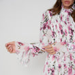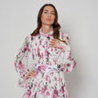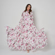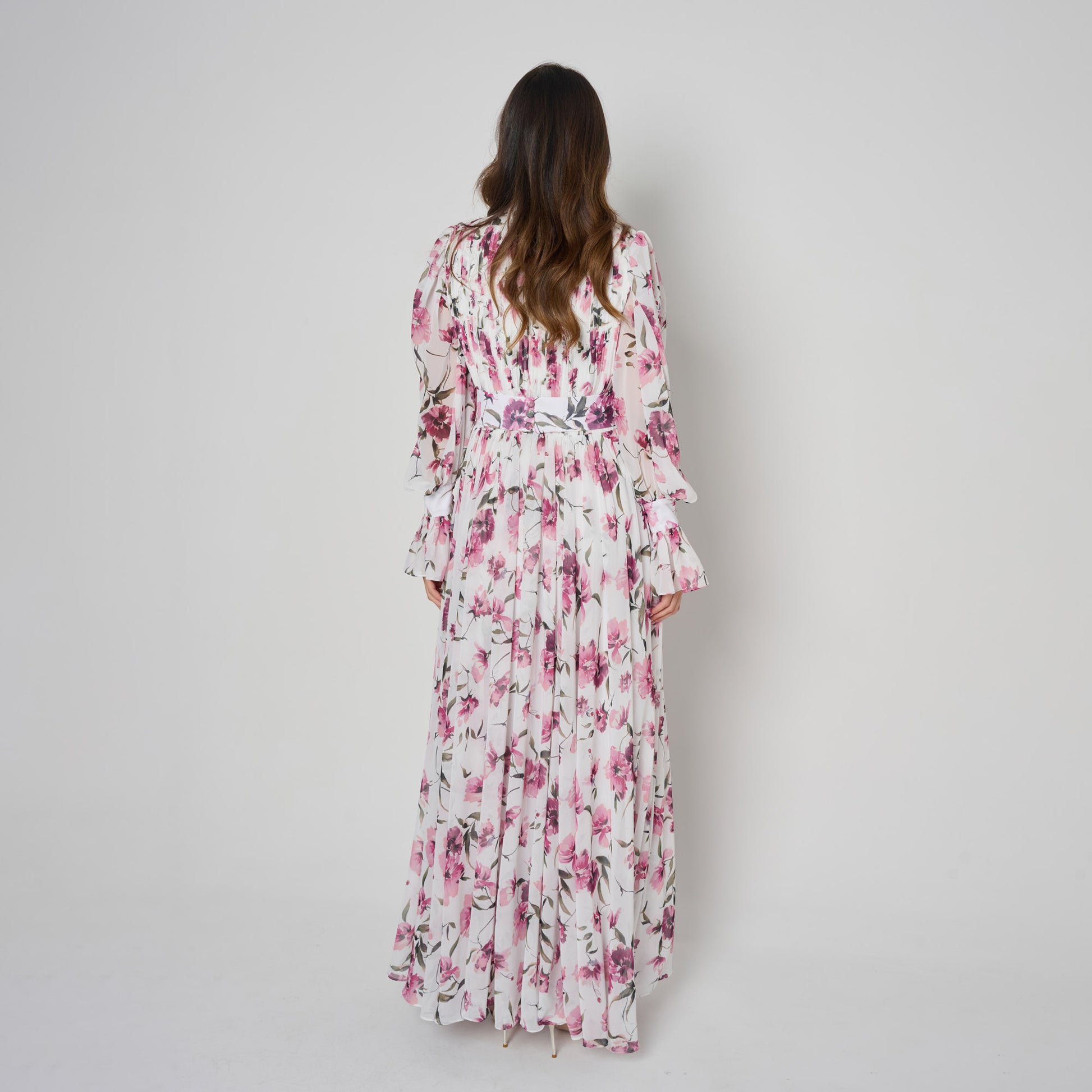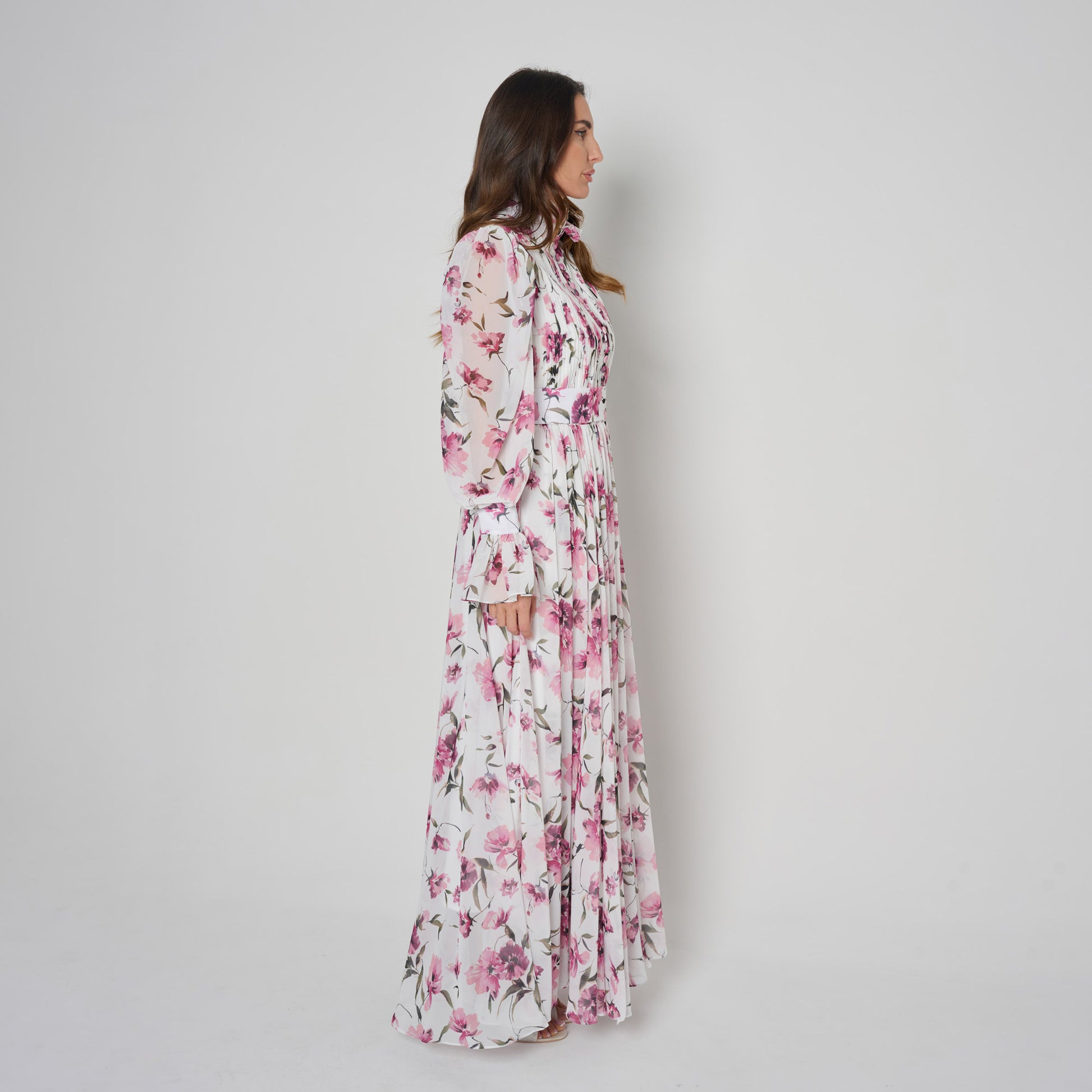 Elevate your style with this exquisite floral dress crafted from luxurious silk chiffon fabric. With its high neckline, long elegant sleeves, and flowing silhouette, this dress offers a timeless, romantic look that’s perfect for any occasion. The soft pink floral pattern adds a touch of feminine charm, while the lightweight fabric creates an airy and graceful movement.