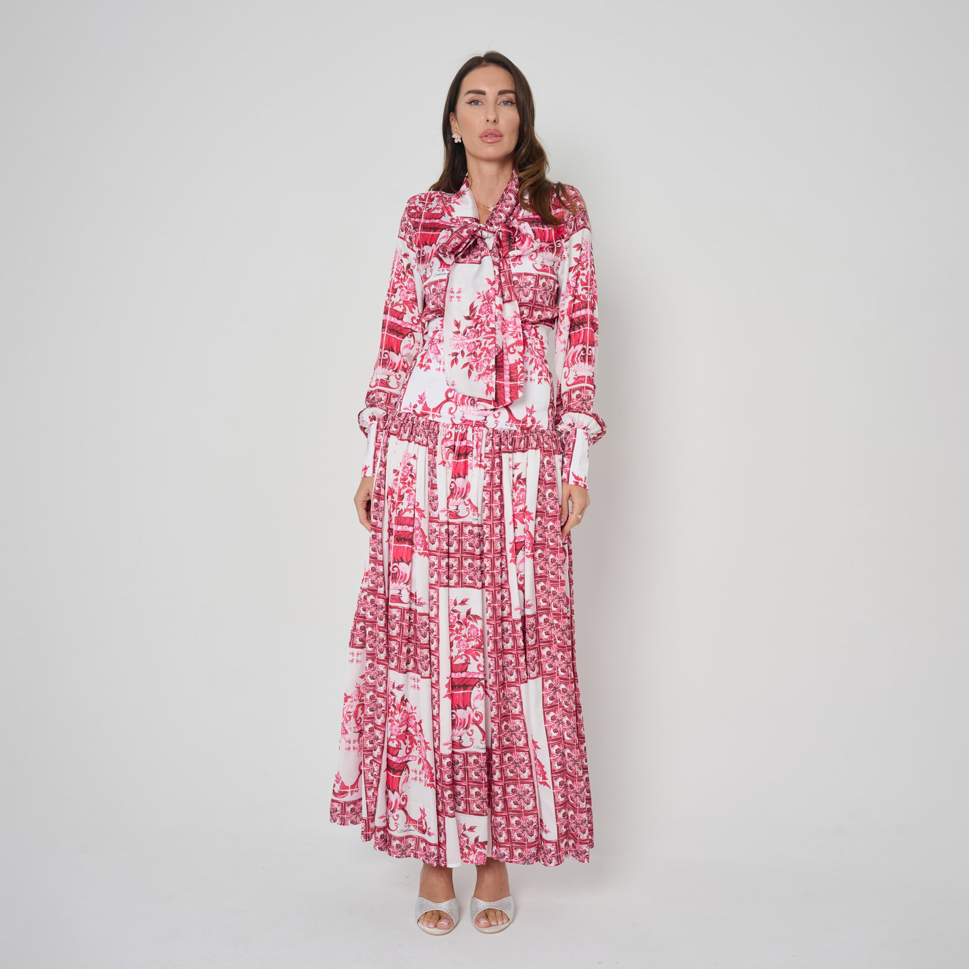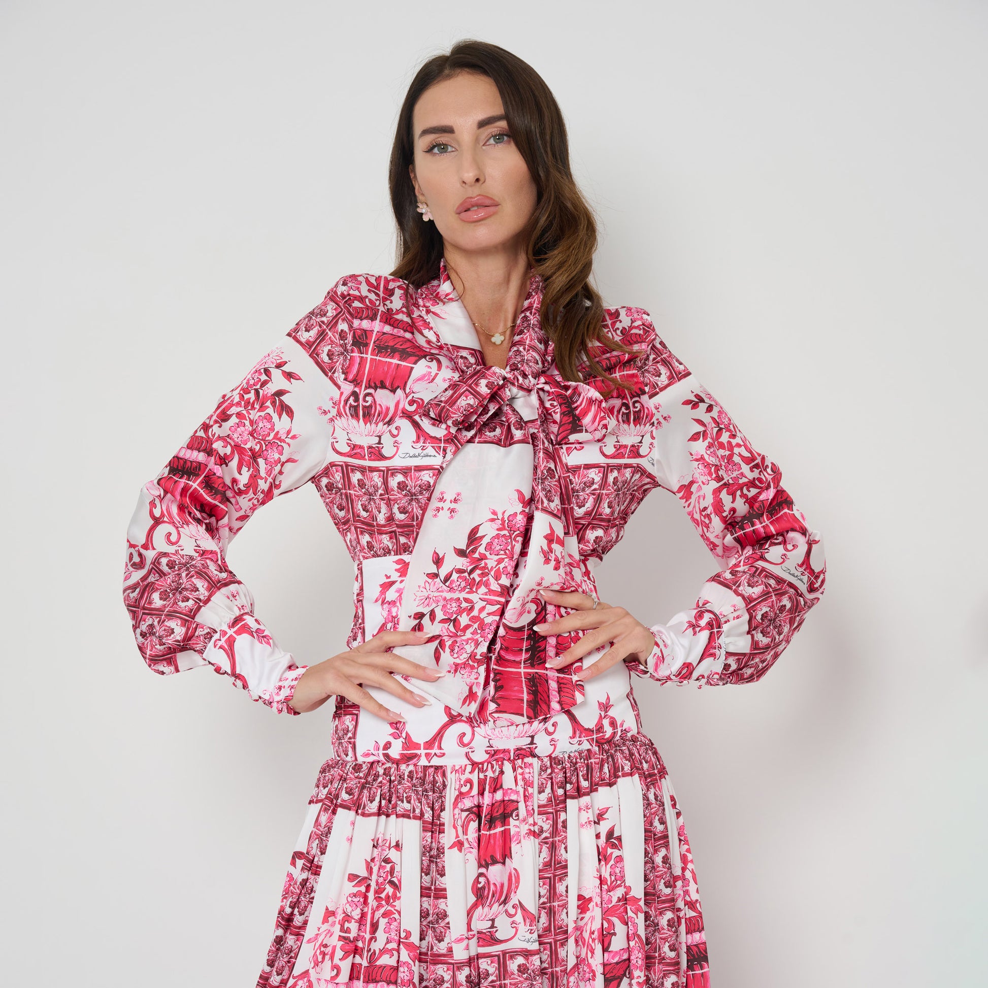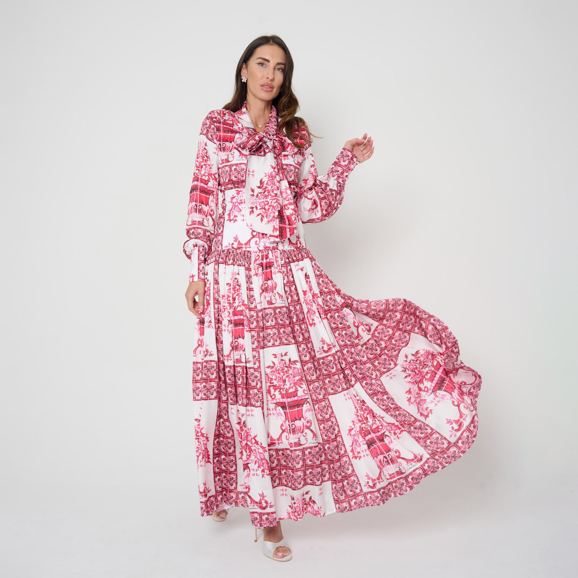 This elegant set consists of a matching shirt and skirt with a beautiful pink and white porcelain-inspired pattern. The shirt has a high neckline and long, slightly puffed sleeves, giving it a sophisticated and modest appearance. The skirt is full-length and features tiered layers, adding volume and flow to the outfit. The intricate print is reminiscent of classic ceramic art, creating a timeless look that blends traditional charm with modern elegance. This coordinated set is perfect for a refined and stylish statement.