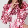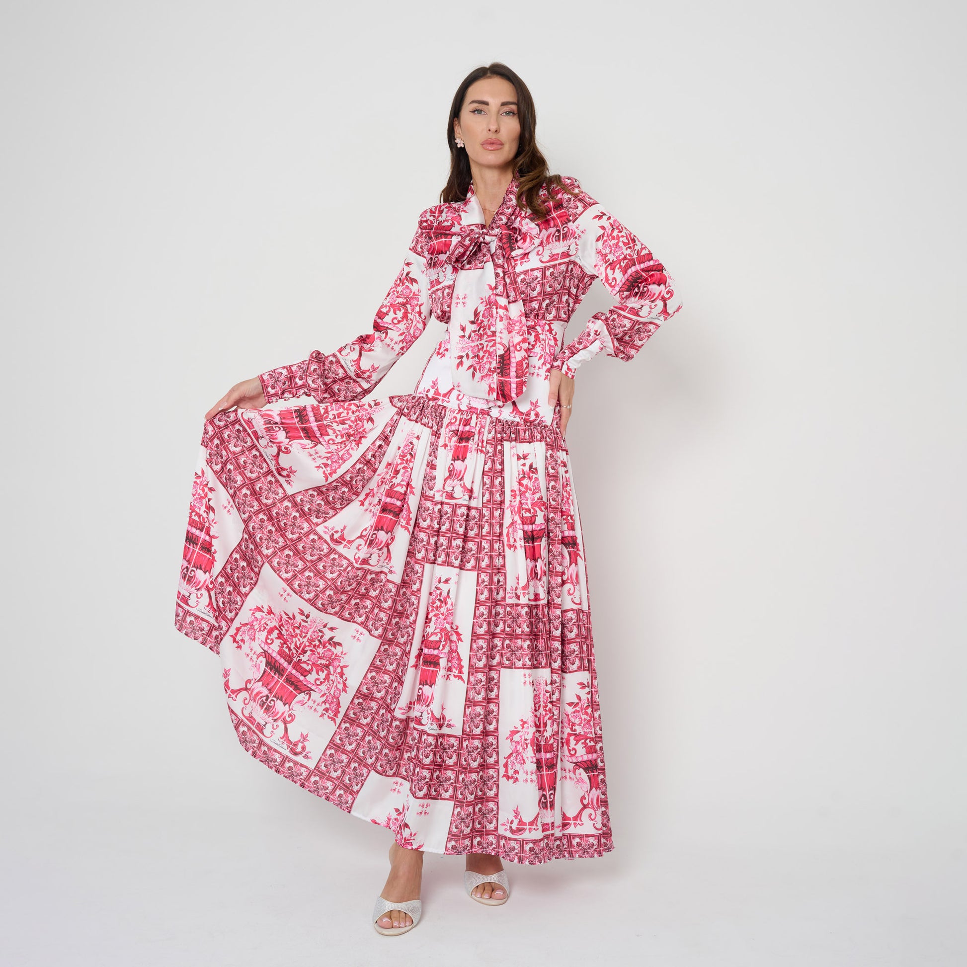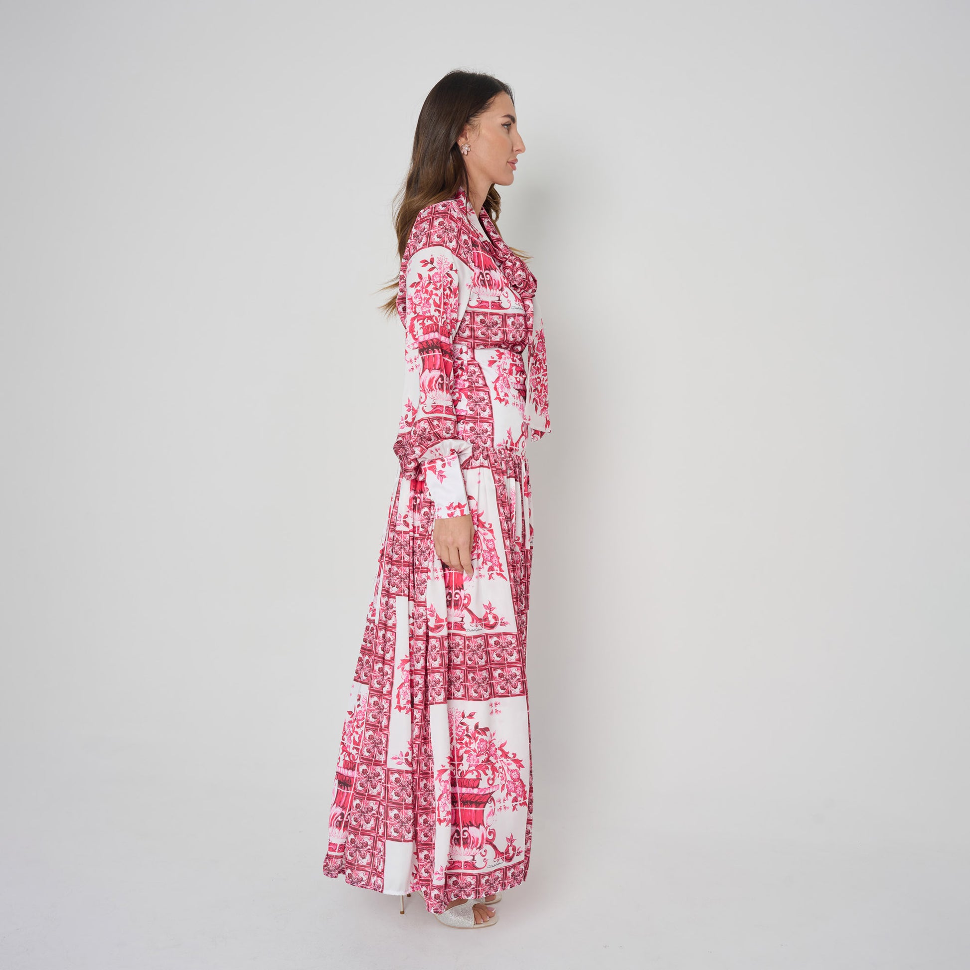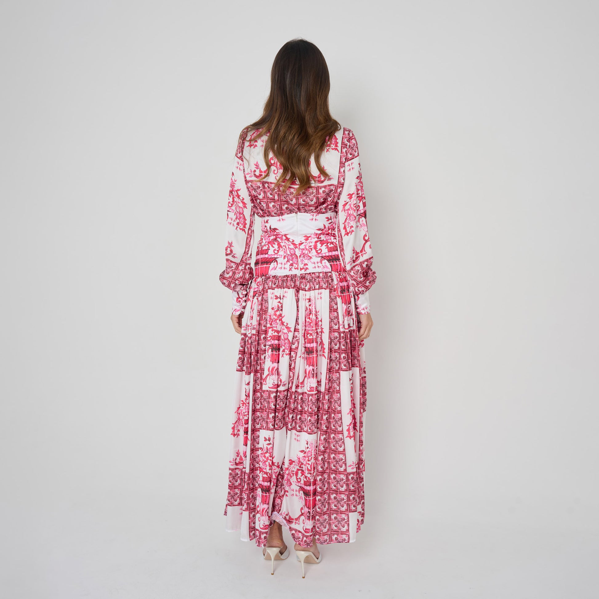 This elegant set consists of a matching shirt and skirt with a beautiful pink and white porcelain-inspired pattern. The shirt has a high neckline and long, slightly puffed sleeves, giving it a sophisticated and modest appearance. The skirt is full-length and features tiered layers, adding volume and flow to the outfit. The intricate print is reminiscent of classic ceramic art, creating a timeless look that blends traditional charm with modern elegance. This coordinated set is perfect for a refined and stylish statement.