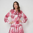 يتكون هذا الطقم الأنيق من قميص وتنورة متطابقين بنقشة جميلة مستوحاة من الخزف الوردي والأبيض. يتميز القميص بياقة عالية وأكمام طويلة منتفخة قليلاً، مما يمنحه مظهراً راقياً ومحتشماً. أما التنورة فهي بطول كامل وبتصميم طبقات متدرجة، مما يضيف حجماً وانسيابية للإطلالة. النقشة مستوحاة من فن الخزف الكلاسيكي، مما يضفي لمسة خالدة تجمع بين السحر التقليدي والأناقة العصرية. هذا الطقم المتناسق مثالي لإطلالة أنيقة ومميزة.
