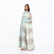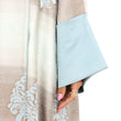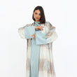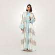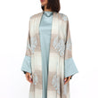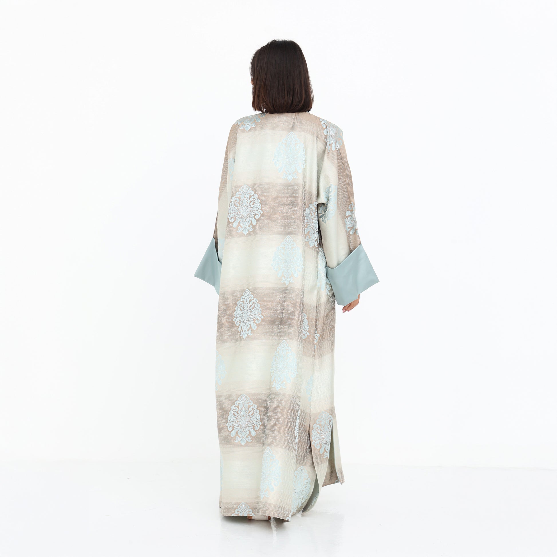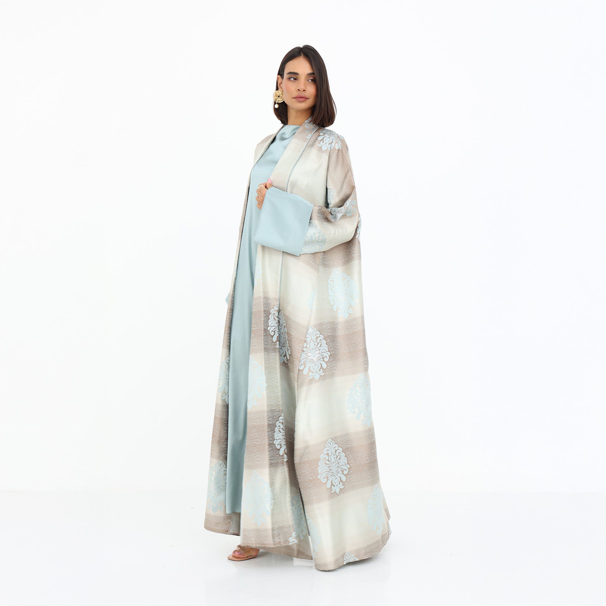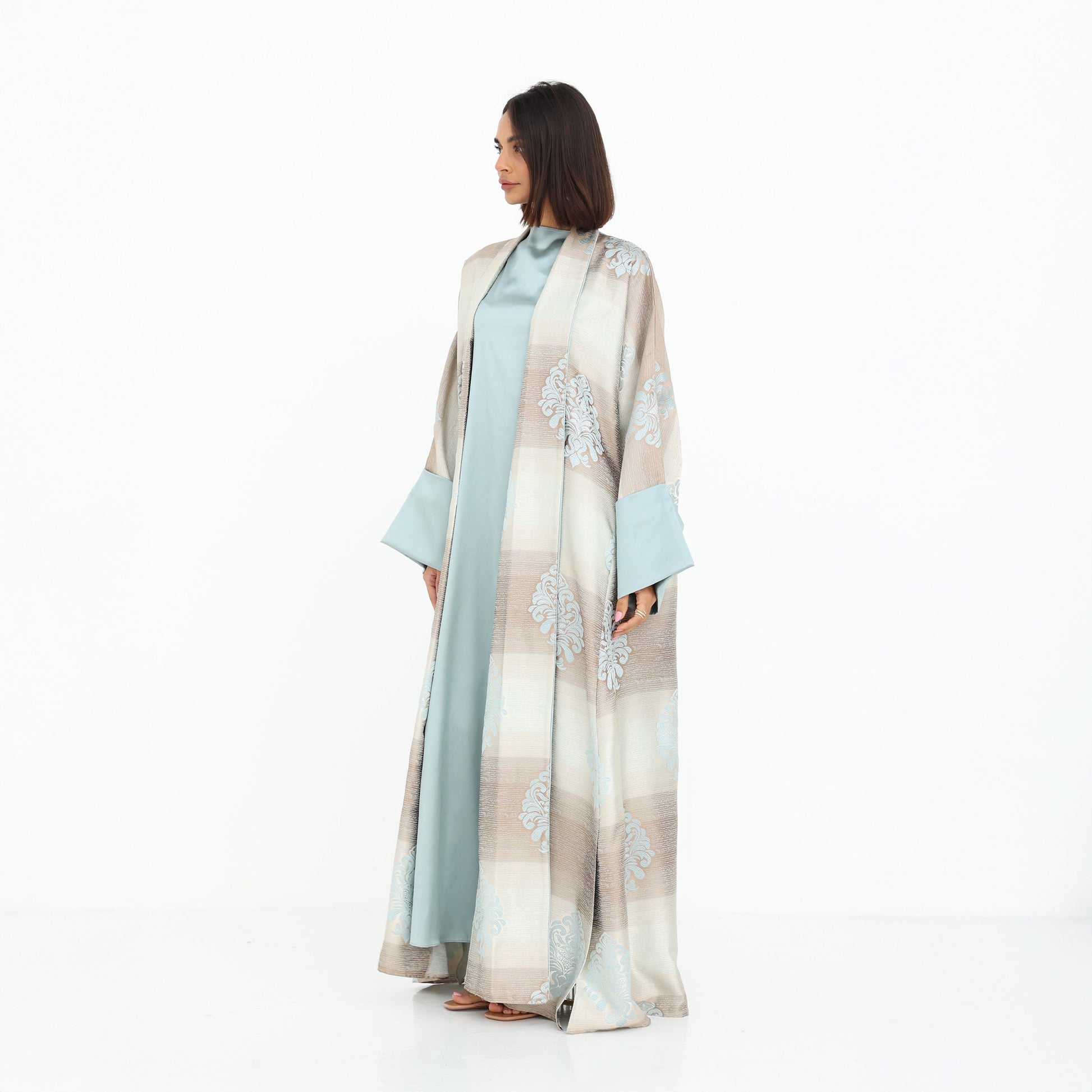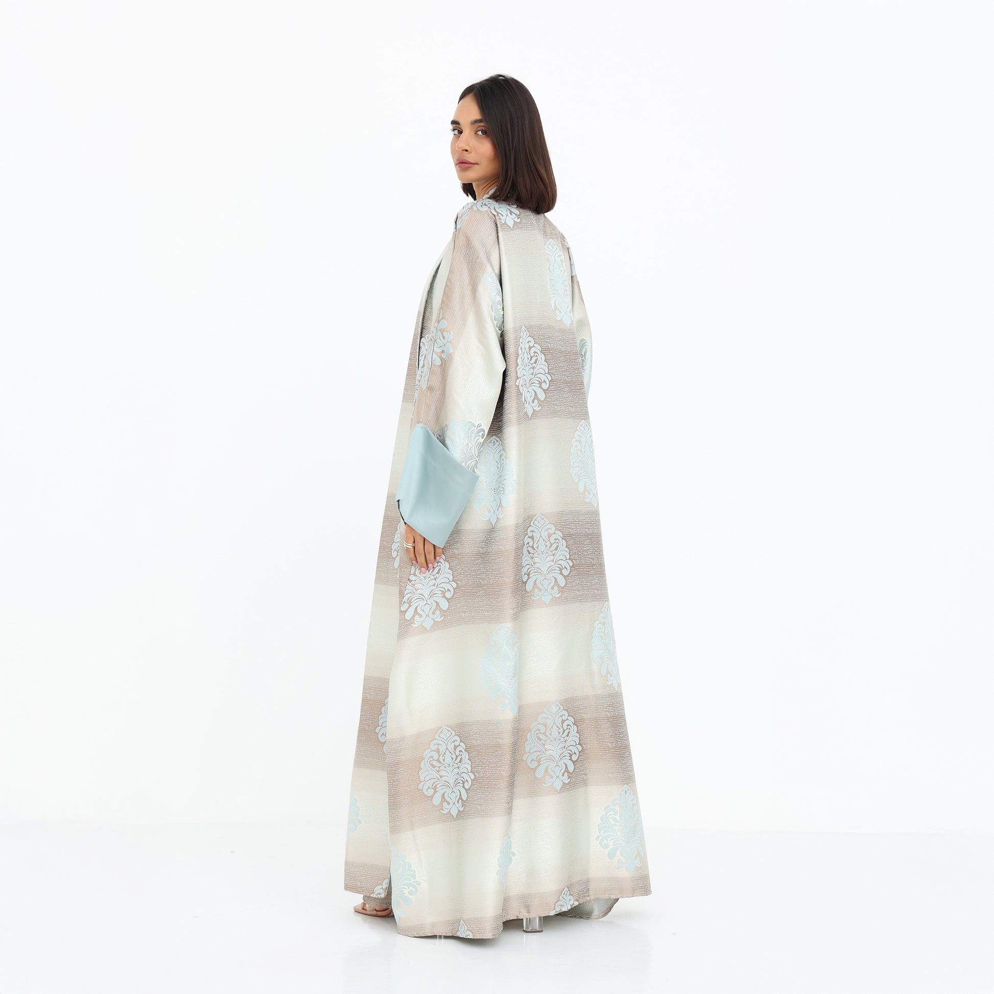 This elegant abaya set showcases a refined blend of soft pastel blue and champagne tones, crafted from luxurious jacquard fabric with intricate floral motifs. The open-front robe features wide sleeves with Silk cuffs, adding a touch of contrast and sophistication. Paired with a smooth Silk inner dress, this ensemble offers a graceful and modern look, perfect for formal gatherings and special occasions. The delicate detailing and flowing silhouette make it a timeless statement of elegance and class.