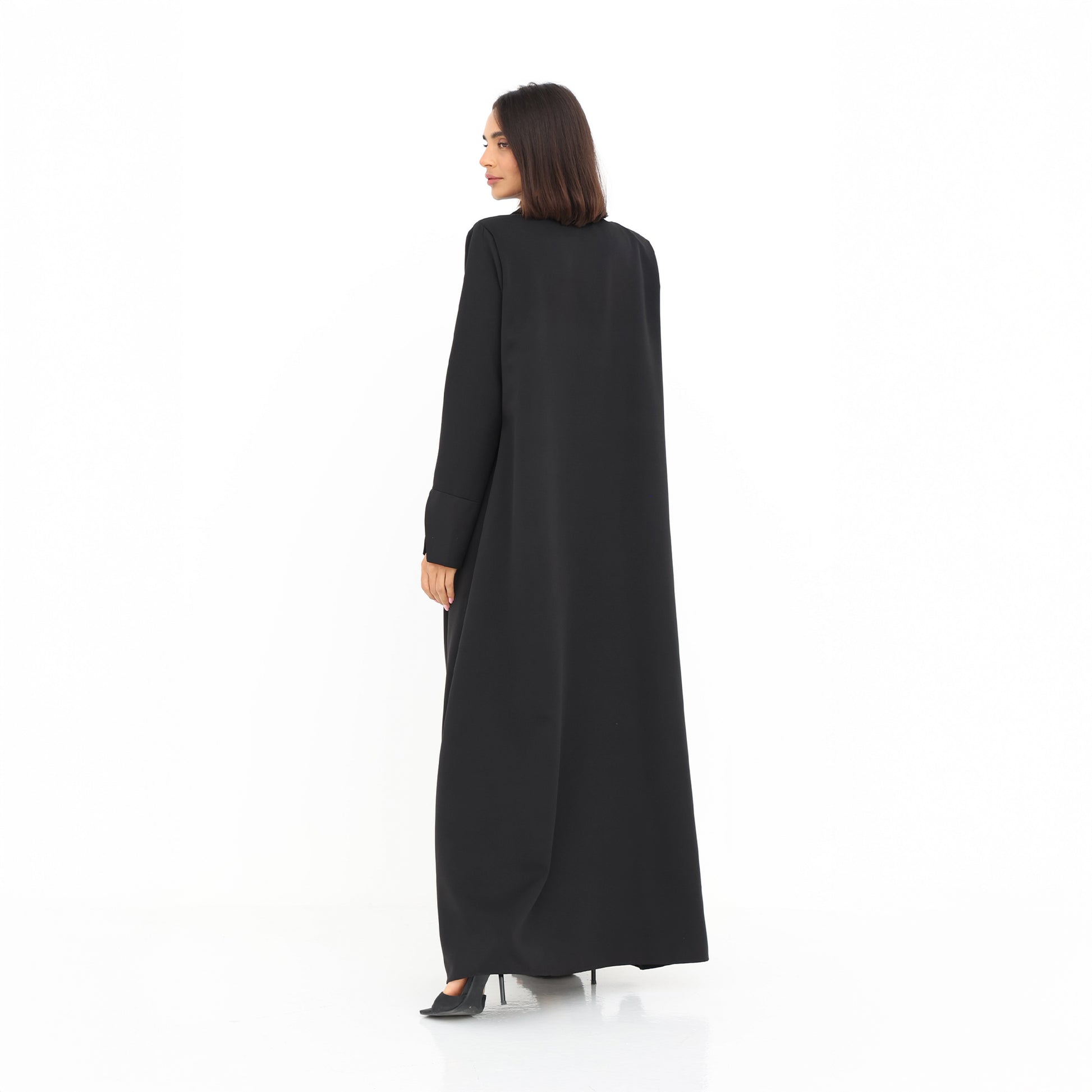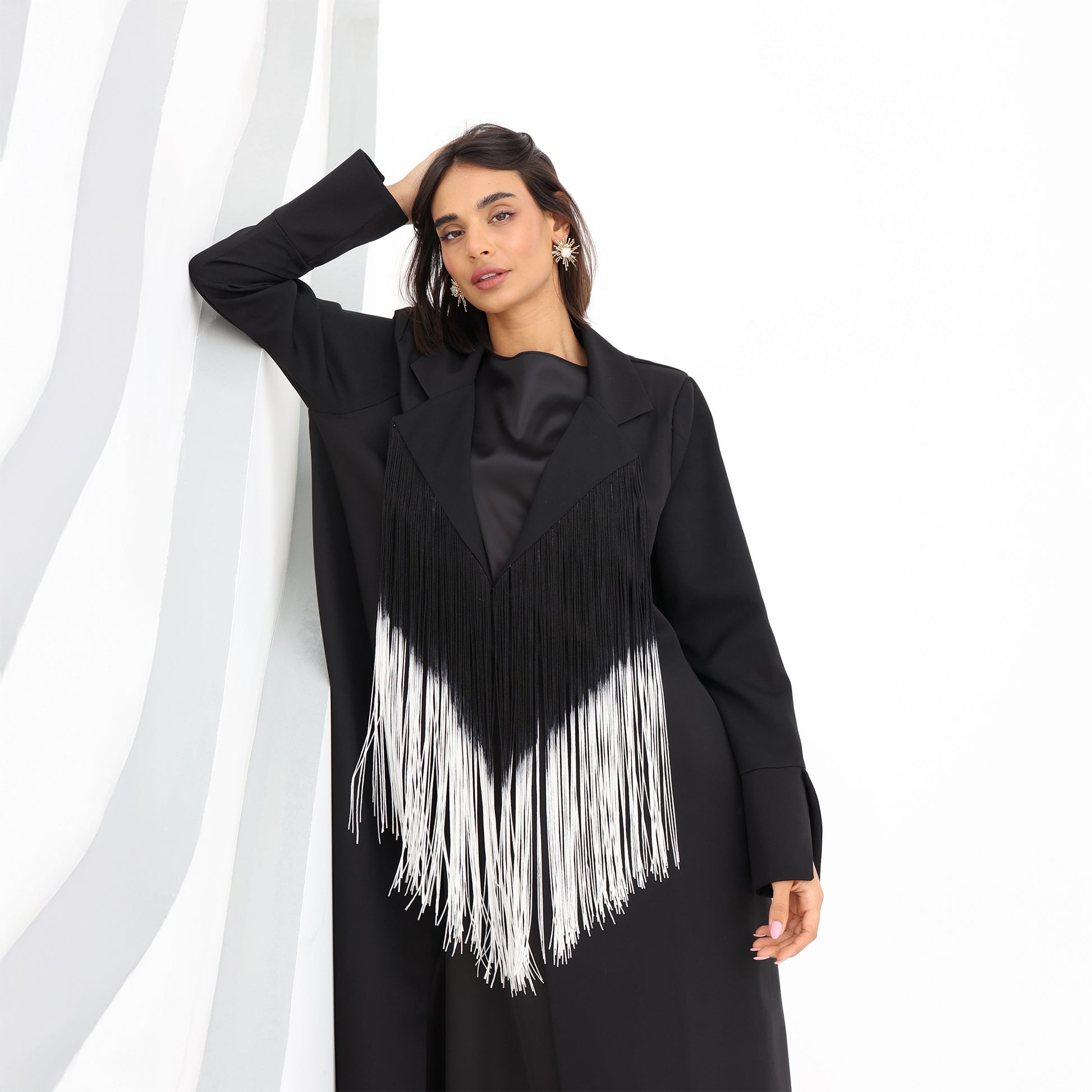 Make a bold statement with this striking Monochrome Fringe Abaya. Crafted from luxurious Crape black fabric, this abaya features a tailored lapel collar for a structured and elegant silhouette. The standout element is the cascading fringe detailing in a dramatic black-to-white gradient, adding movement and a modern edge to the design. Perfect for those who love to blend tradition with contemporary fashion, this abaya is ideal for special occasions or making an effortlessly chic impression.
