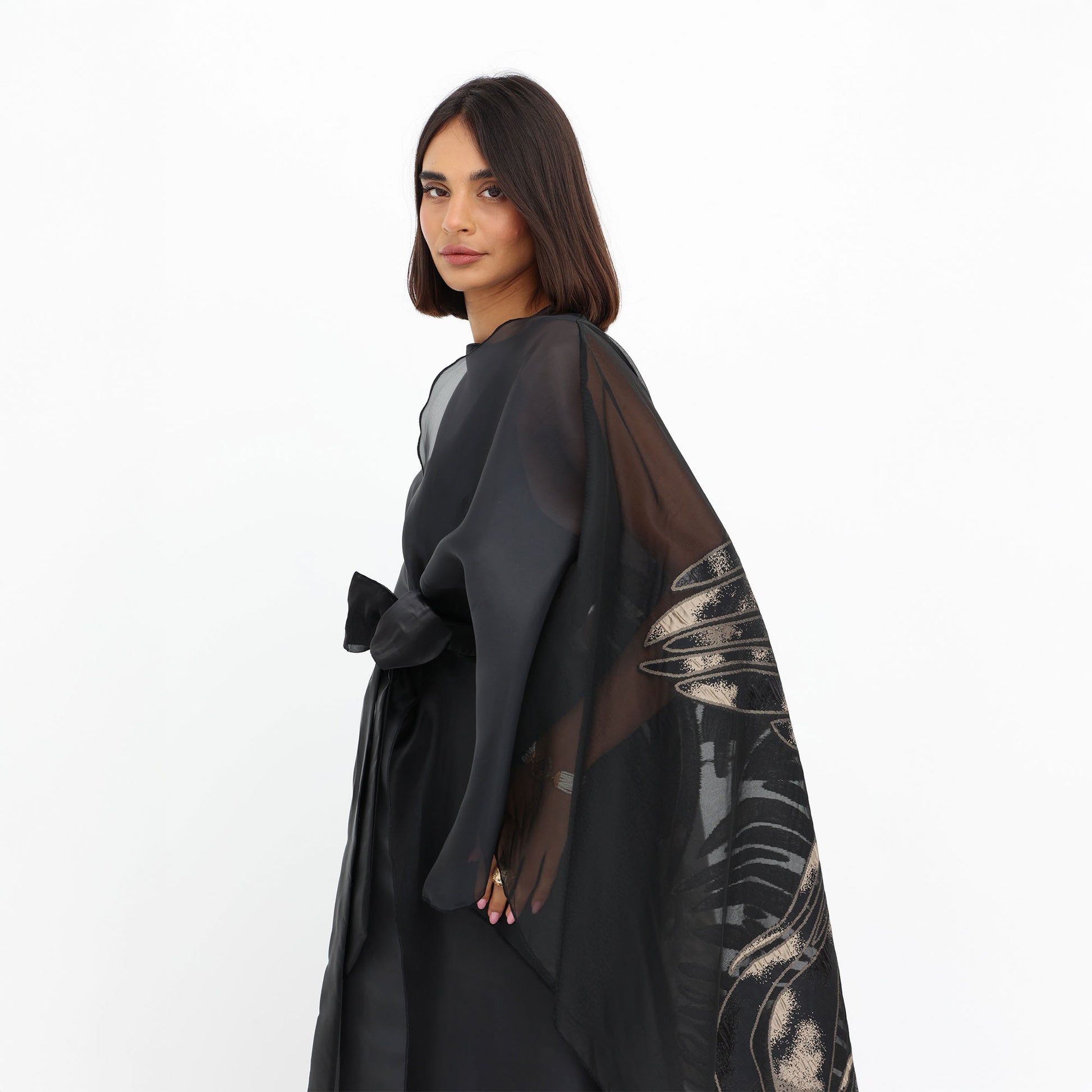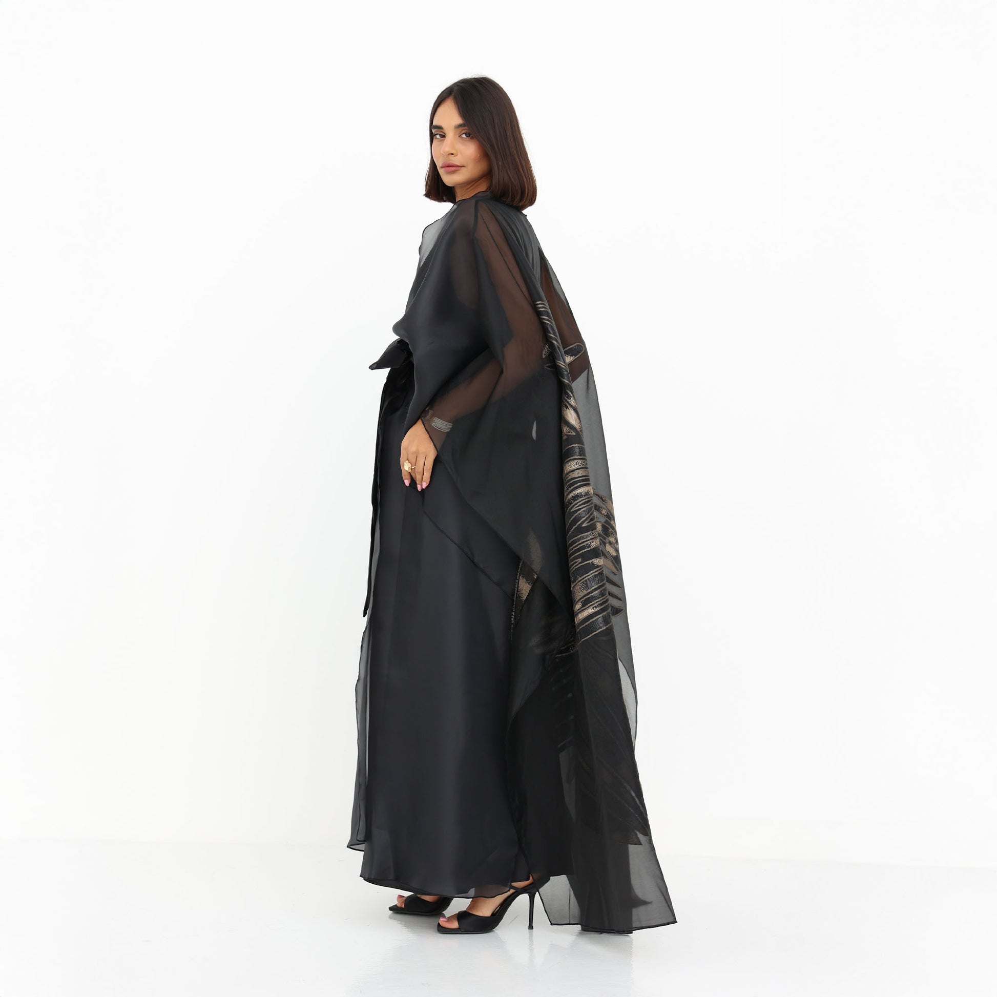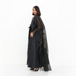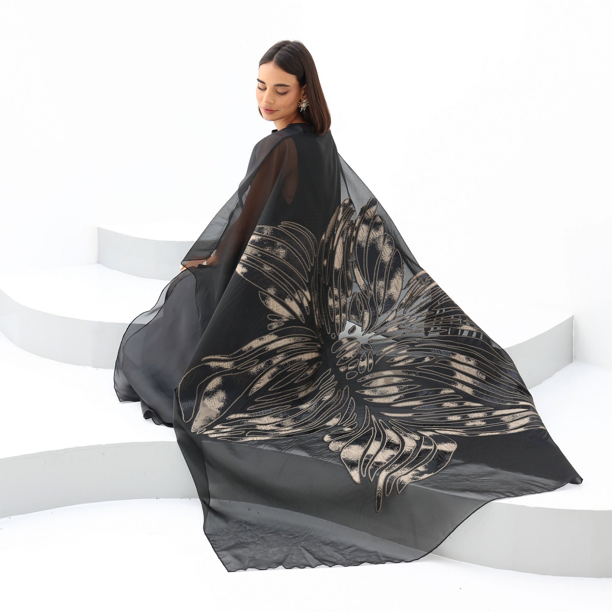 This luxurious organza cape is the epitome of elegance and sophistication. Crafted from sheer, lightweight fabric, it drapes effortlessly for a graceful, ethereal look. The cape features a striking metallic floral design, adding a touch of glamour and artistry to the ensemble. With its fluid silhouette and delicate transparency, this statement piece is perfect for layering over evening wear, elevating any outfit with a refined and contemporary charm.