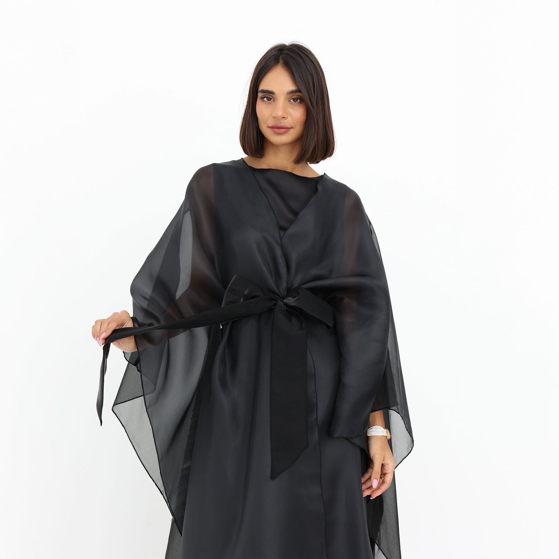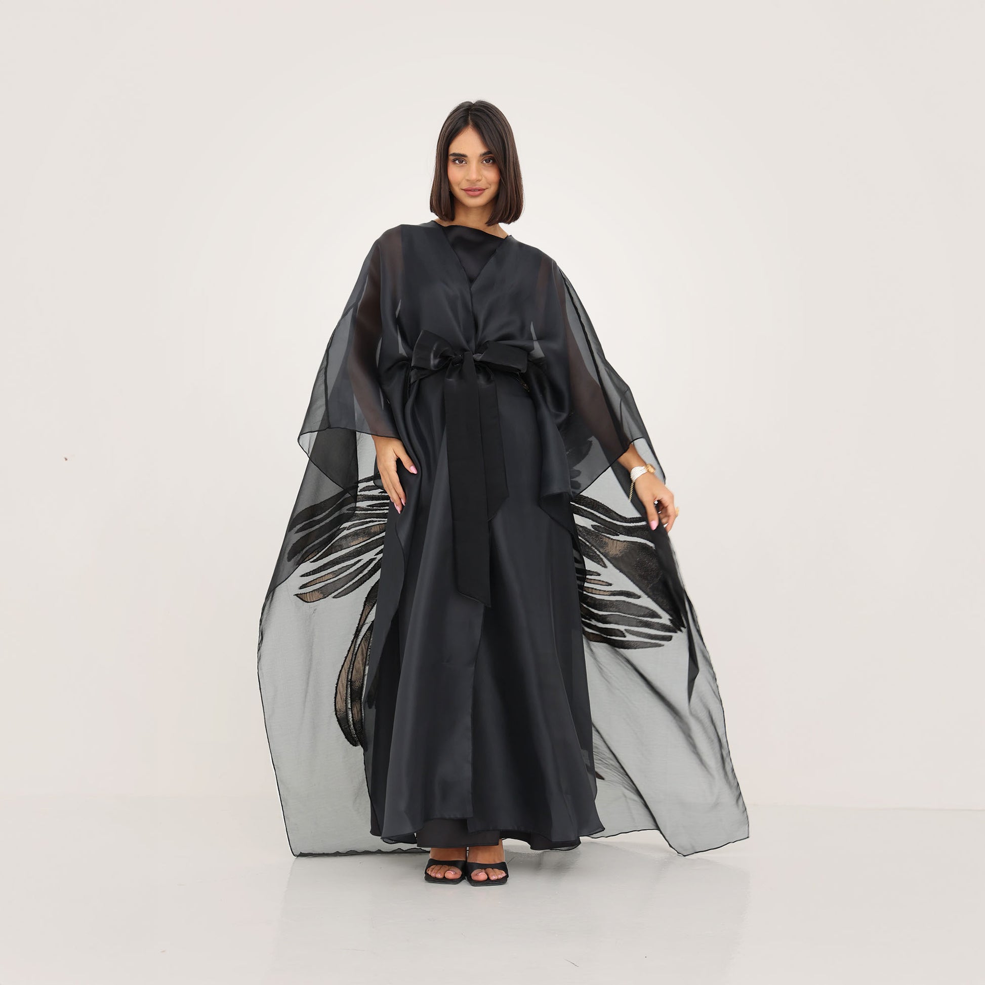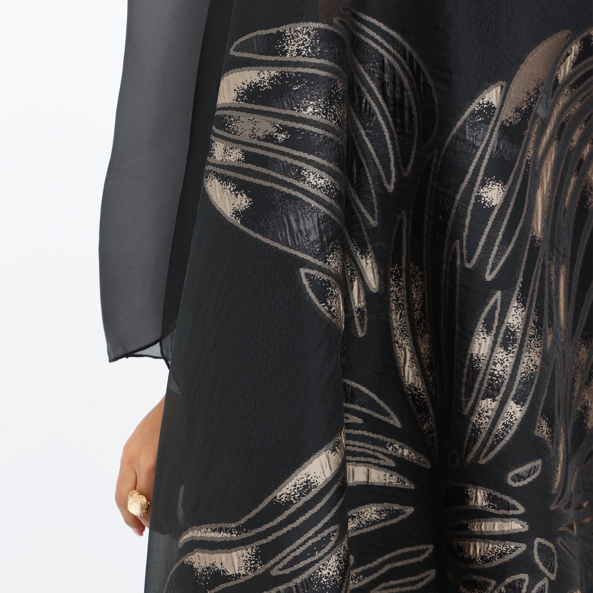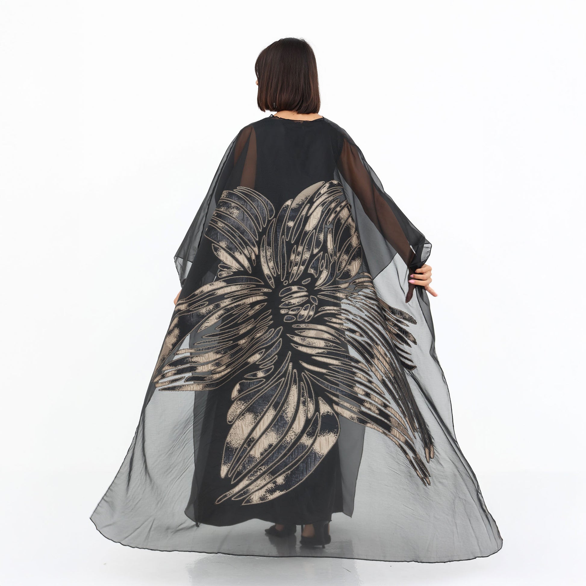 This luxurious organza cape is the epitome of elegance and sophistication. Crafted from sheer, lightweight fabric, it drapes effortlessly for a graceful, ethereal look. The cape features a striking metallic floral design, adding a touch of glamour and artistry to the ensemble. With its fluid silhouette and delicate transparency, this statement piece is perfect for layering over evening wear, elevating any outfit with a refined and contemporary charm.