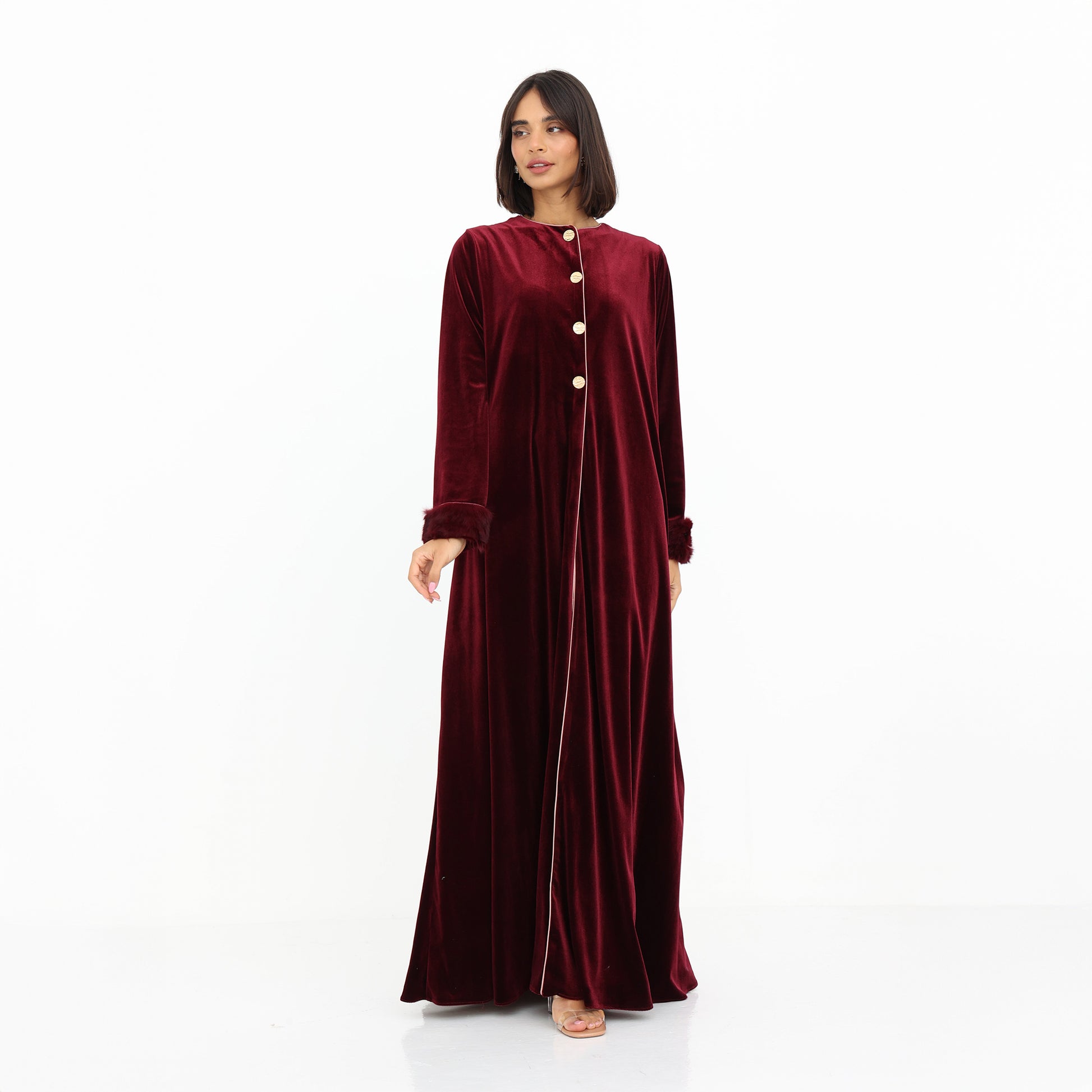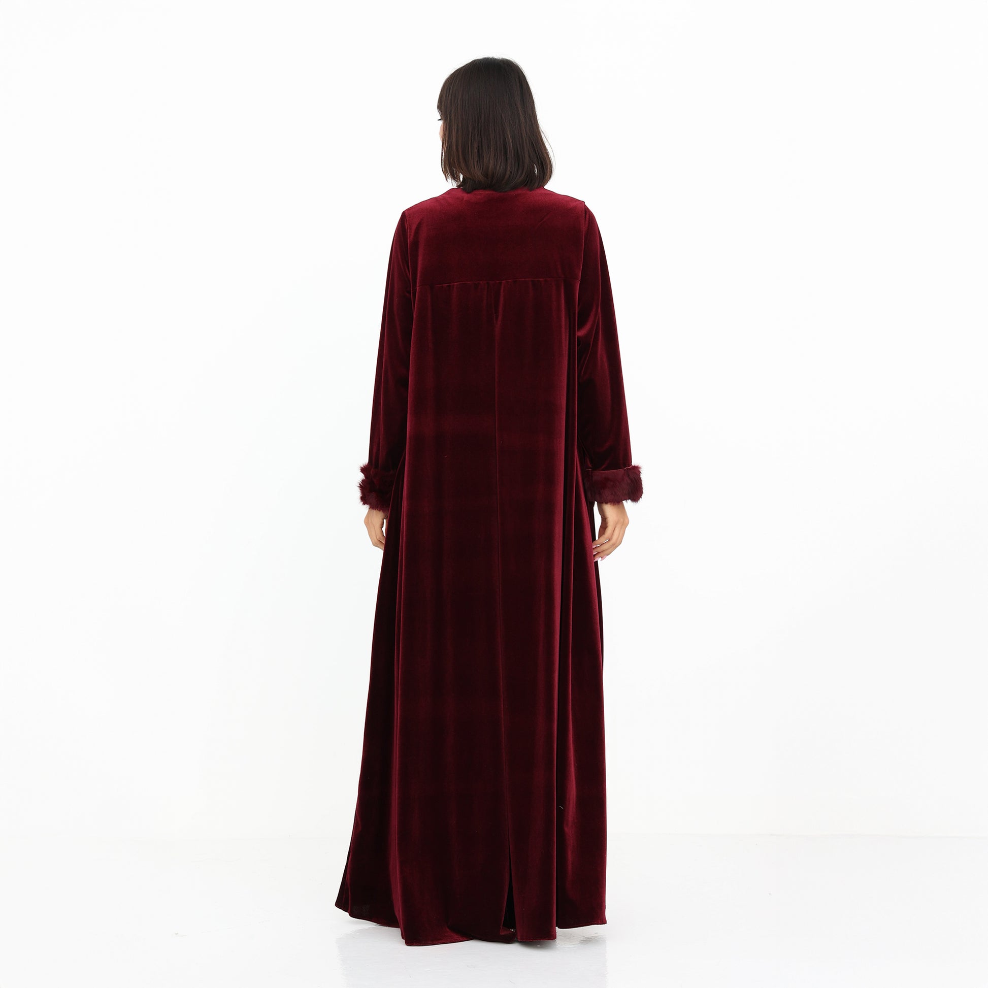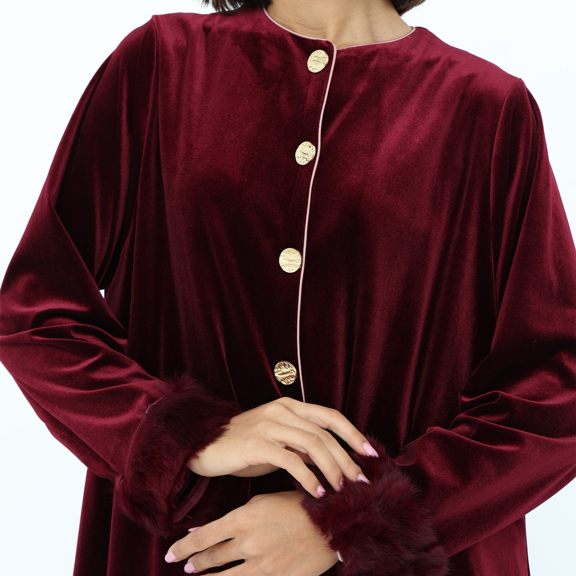 This luxurious velvet abaya in a rich burgundy hue exudes elegance and sophistication. Featuring a soft silk satin inner lining in a delicate blush tone, it offers a beautiful contrast that enhances its regal appeal. The gold button detailing adds a refined touch, while the plush natural fur-trimmed cuffs elevate the design with a hint of glamour. With its flowing silhouette, this abaya is the perfect statement piece for special occasions or winter elegance.