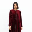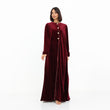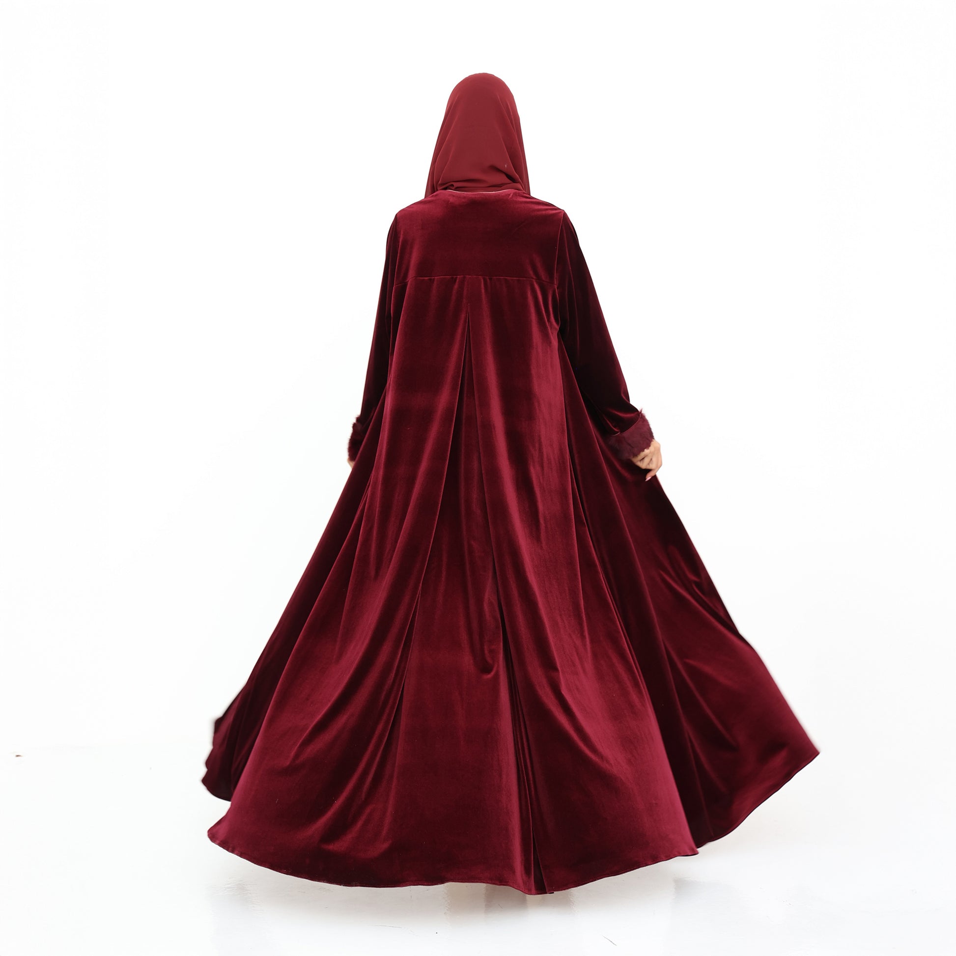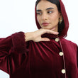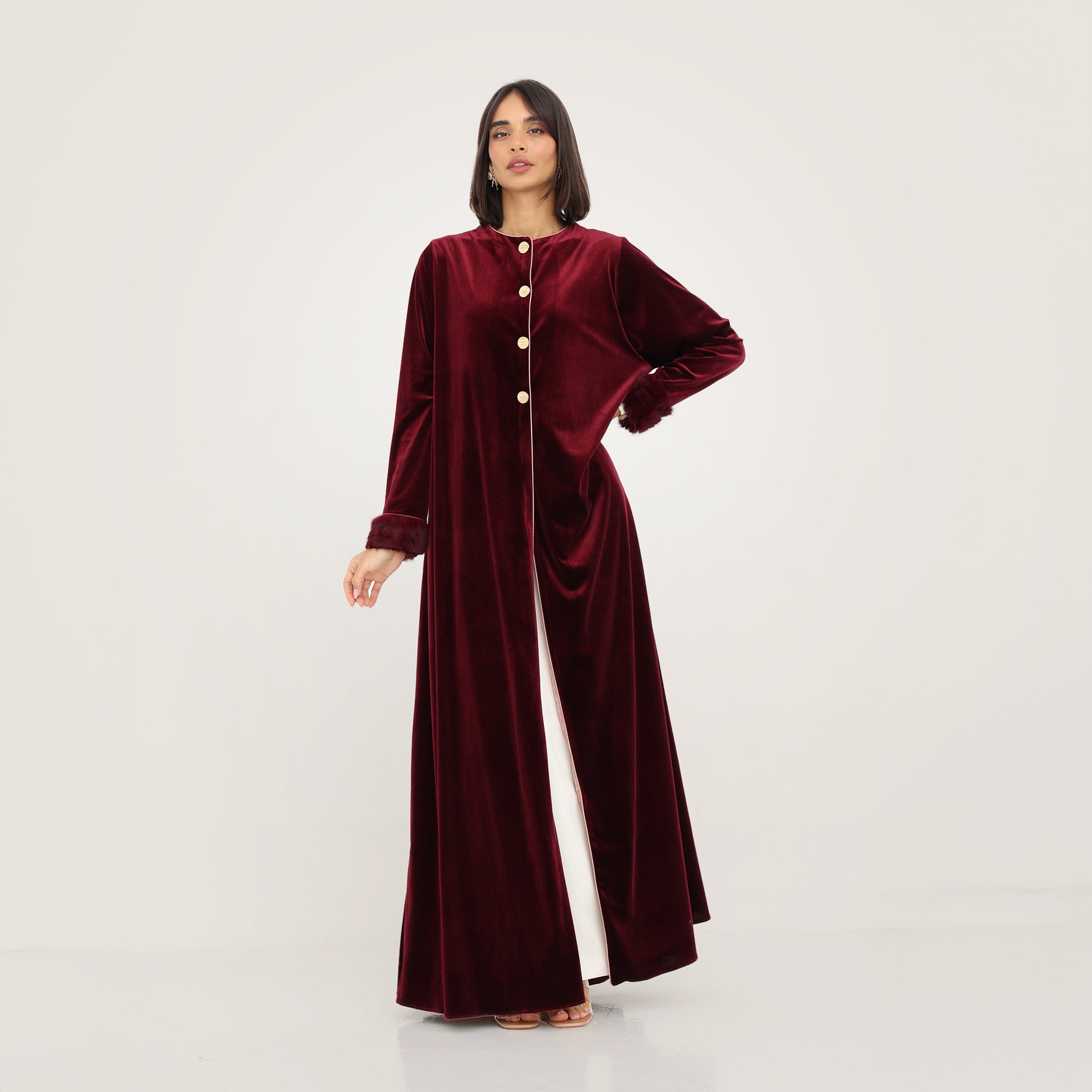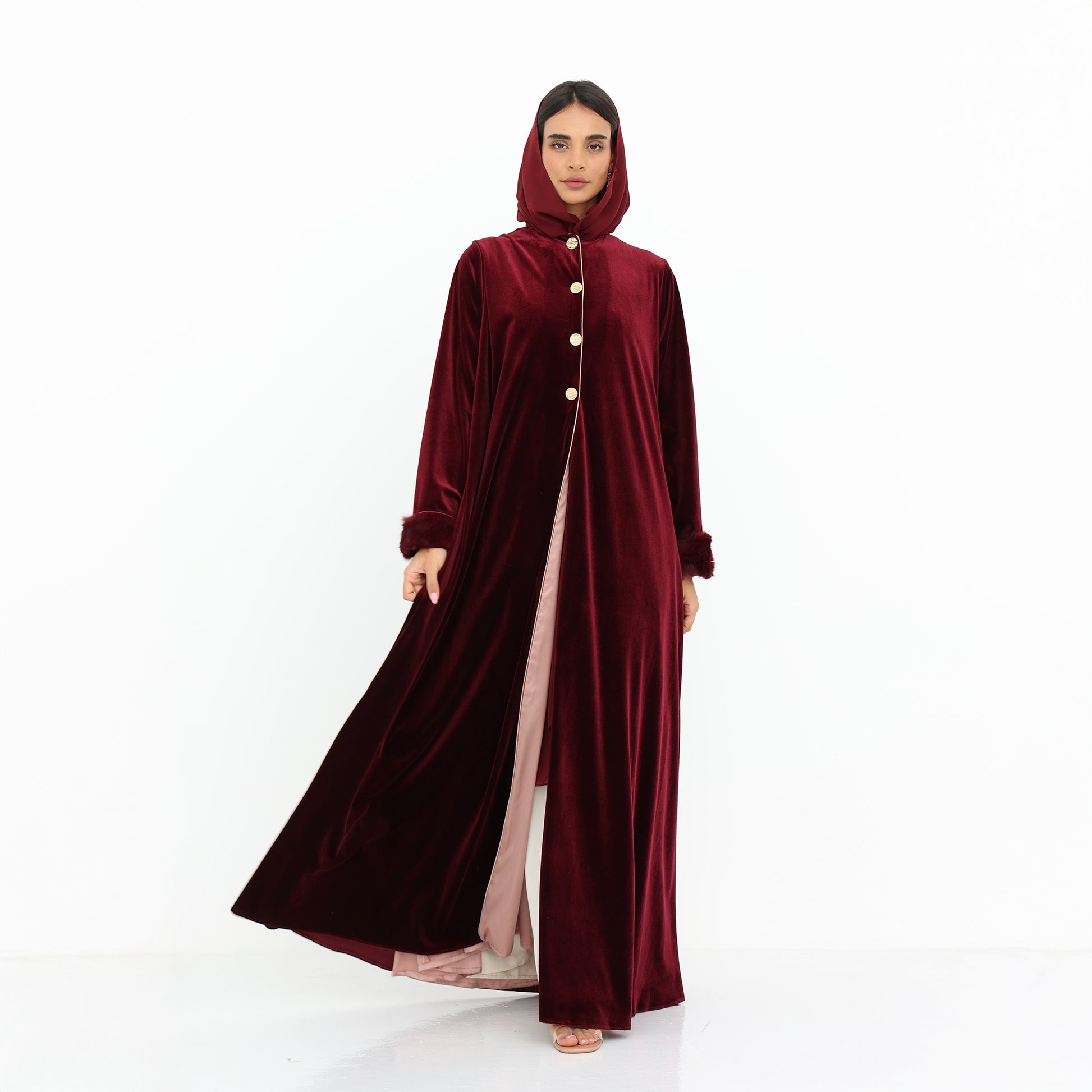 This luxurious velvet abaya in a rich burgundy hue exudes elegance and sophistication. Featuring a soft silk satin inner lining in a delicate blush tone, it offers a beautiful contrast that enhances its regal appeal. The gold button detailing adds a refined touch, while the plush natural fur-trimmed cuffs elevate the design with a hint of glamour. With its flowing silhouette, this abaya is the perfect statement piece for special occasions or winter elegance.
